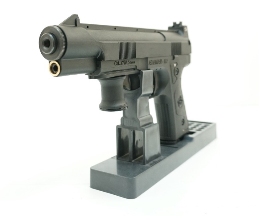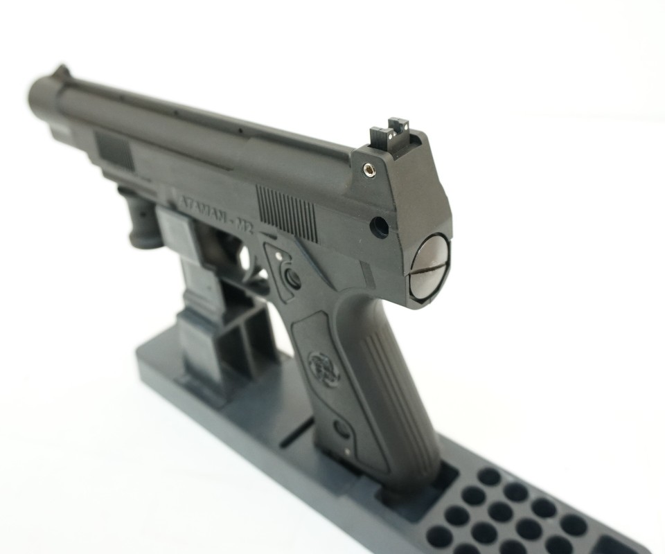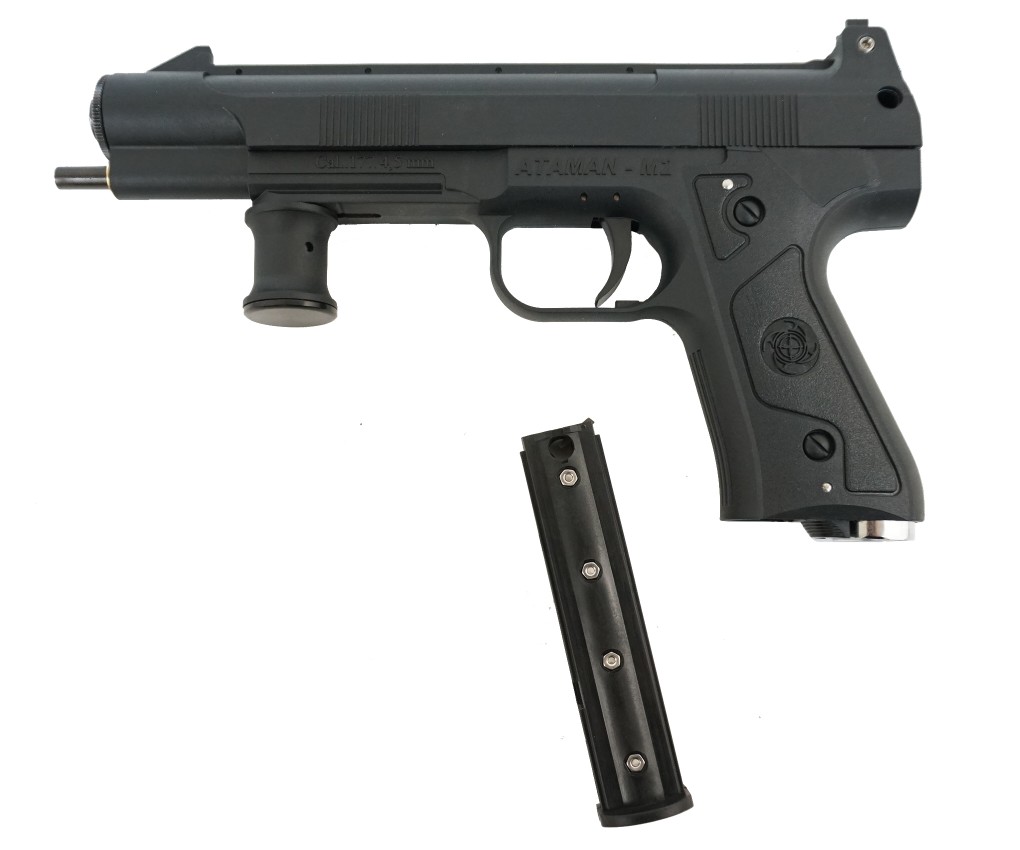 Заправить пистолет можно также и от иных источников – например, от компрессора или ручного насоса. Благодаря возможности установки дополнительного резервуара оружие получает существенный запас работоспособности. Стреляет пистолет Атаман-М2 пулями 4,5 мм. Магазин отъемного типа, рассчитан на 20 боеприпасов. Ствол оружия нарезной, кучность стрельбы с расстояния 25 метров составляет 45 мм. УСМ – только двойного действия, предусмотрен полуавтоматический режим ведения огня.