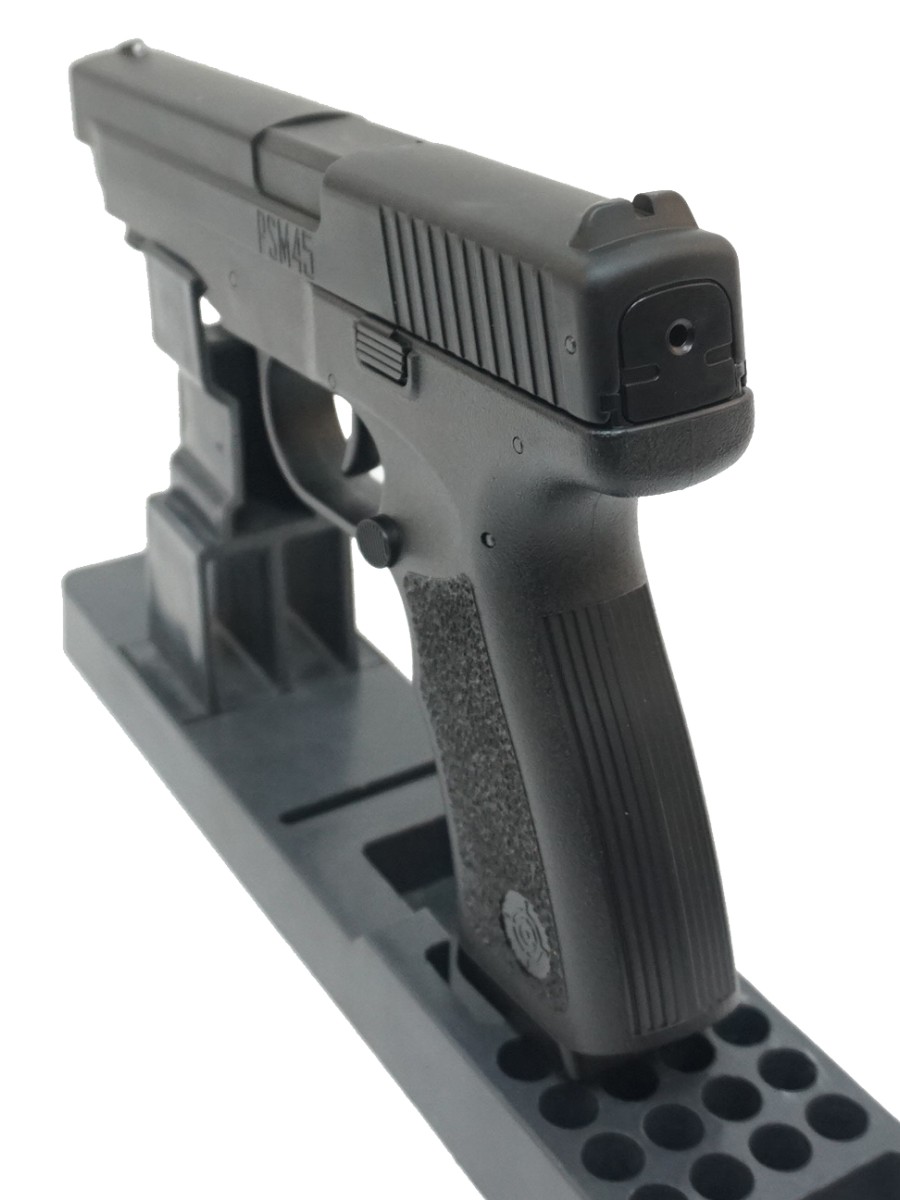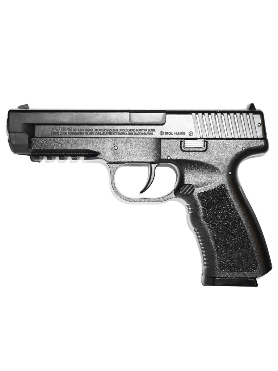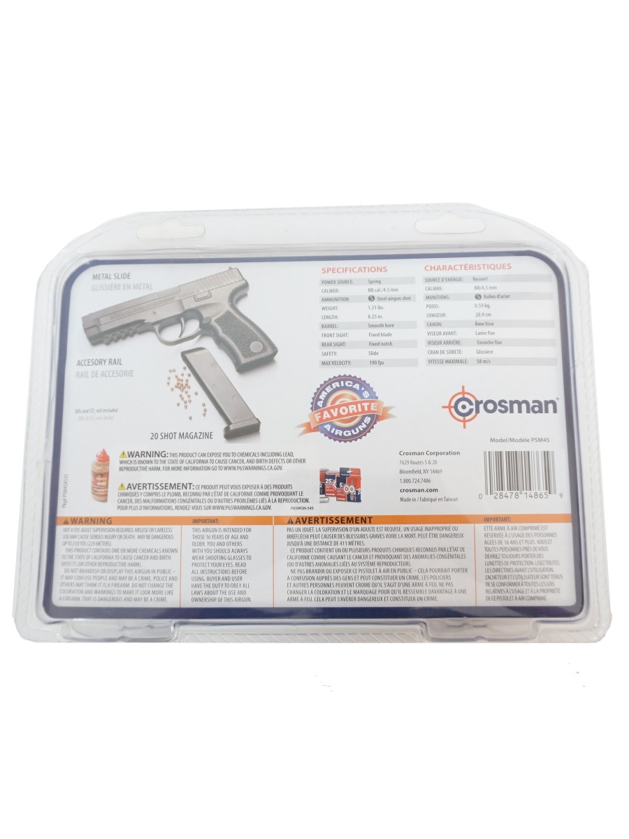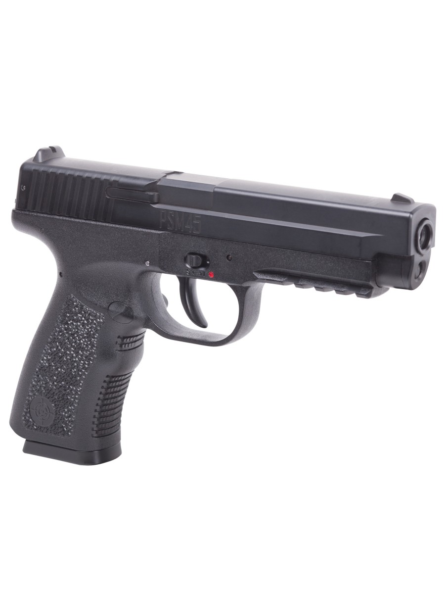 Мушка с целиком здесь нерегулируемые, ниже ствола расположена планка для возможности использования фонаря, ЛЦУ или других тактических аксессуаров. Crosman PSM45 изготовлен из металла (затвор, ответственные детали) и полимерного материала высокого качества, и отличается высокой степенью надежности.