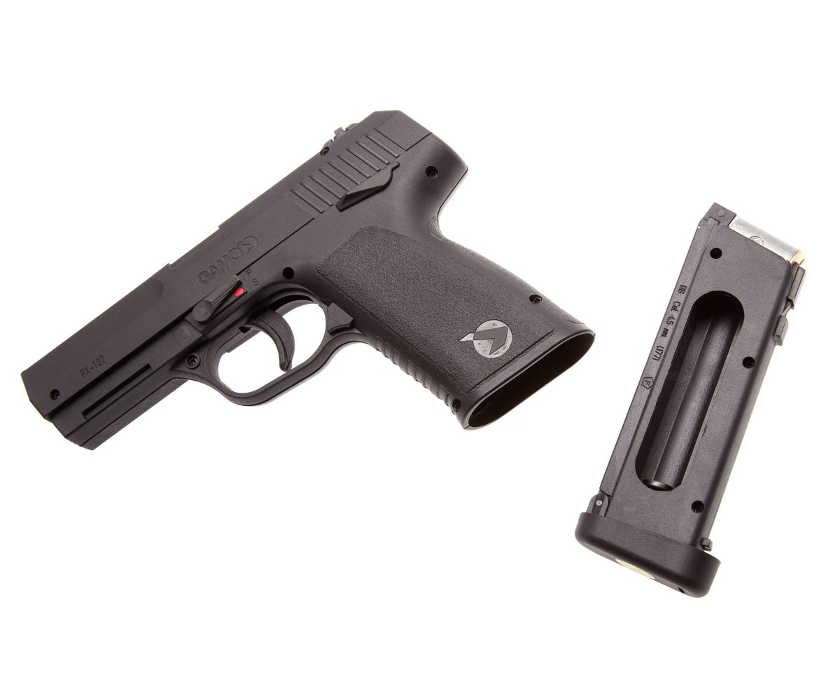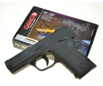 Магазин для пуль является моноблоком, содержащим механизм установки баллона. У Gamo PX107 имеется предохранитель, регулировка целика по горизонтали и белая метка на мушке для облегчения прицеливания. Gamo PX-107 - универсальное оружие, ведь усовершенствовать его можно самостоятельно. Для этого имеется планка под фонарь либо лазерный целеуказатель. Стоимость пистолета Gamo PX-107 невелика, одна из наиболее низких в модельном ряду данной испанской фирмы.