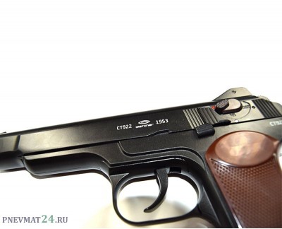 Предохранитель в данной модели поворотный, флажкового типа. Эти качества обеспечивают высокую скорость заряда, меткость, кучность стрельбы и при всем этом газ расходуется более экономно.