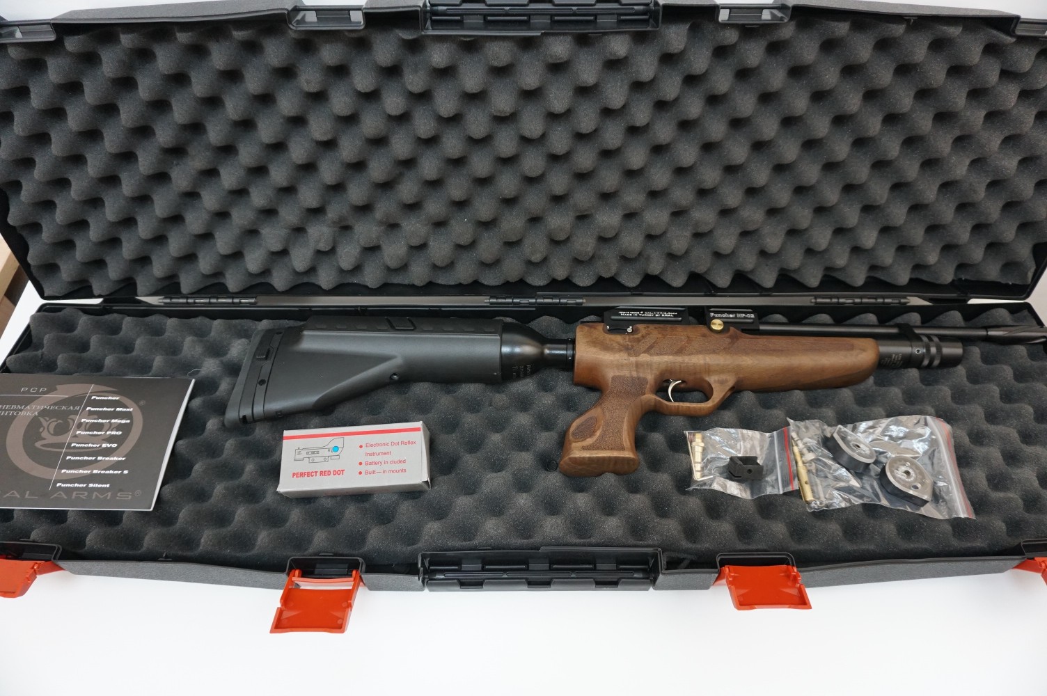 Комплектация (?): | пистолет, приклад, магазин-барабан - 2 шт., заправочный штуцер, коллиматорный прицел, набор уплотнительных колец, инструкция, кейс |