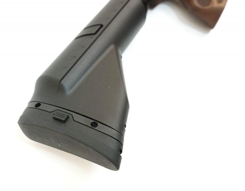 Ложе этой модели изготовлено из натурального ореха, сохраняя натуральный цвет древесины, и отличается высококачественной обработкой. Ответственные элементы и корпус выполнены из металла и оружейного пластика. На прикладе установлен прорезиненный затыльник для смягчения отдачи при выстреле. За счет наличия двух направляющих с этим оружием можно использовать различные аксессуары для стрельбы, включая и коллиматор, идущий в комплекте.