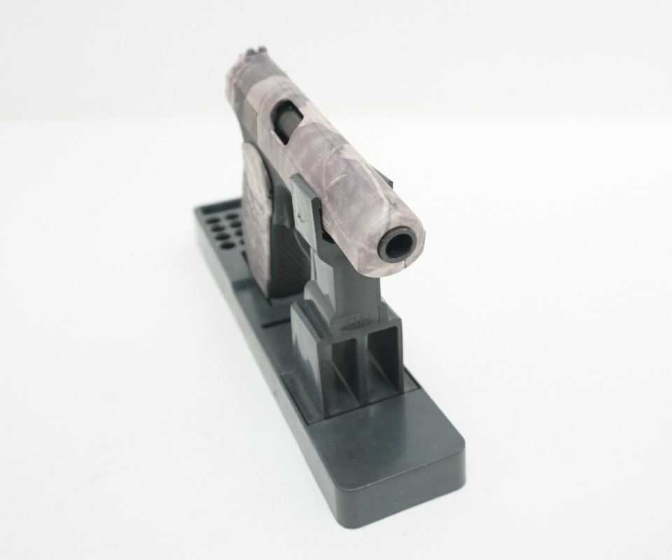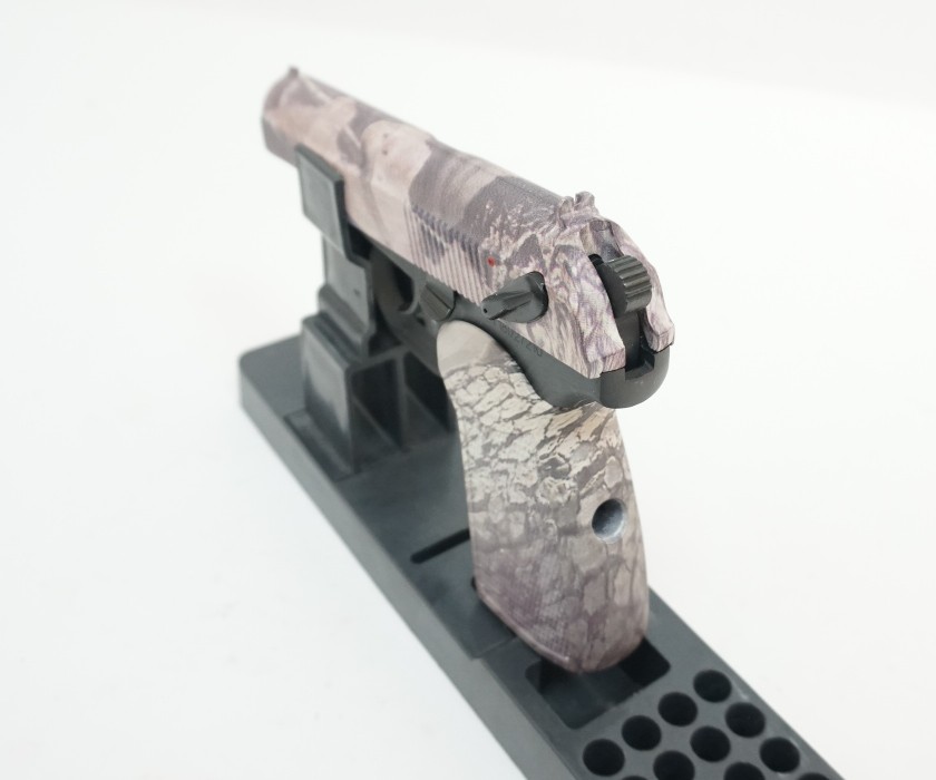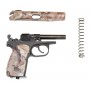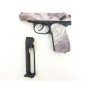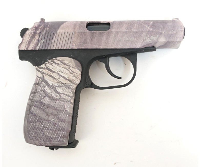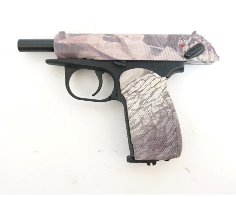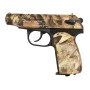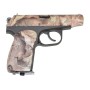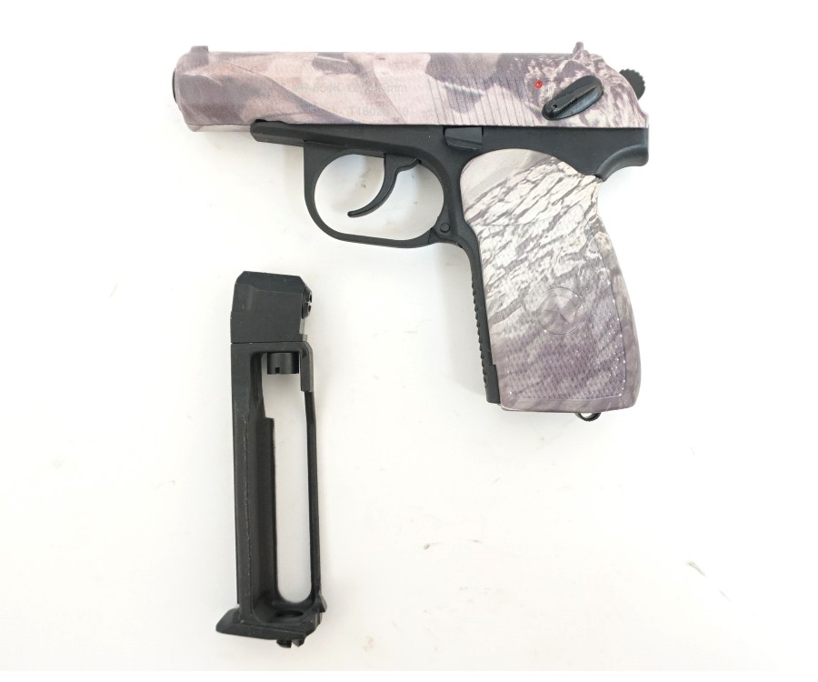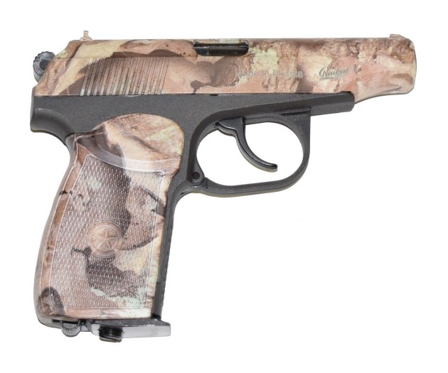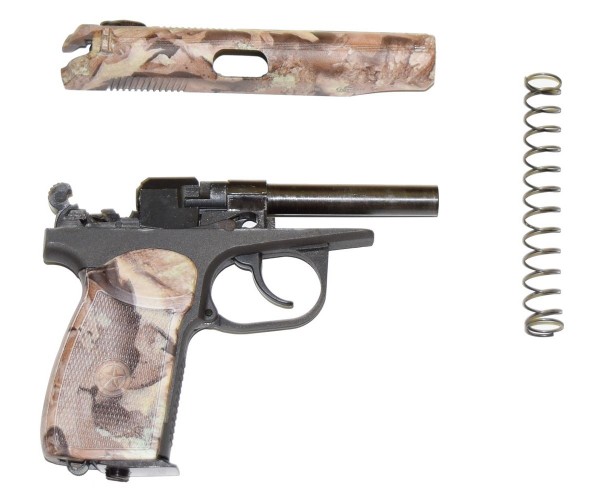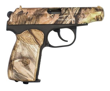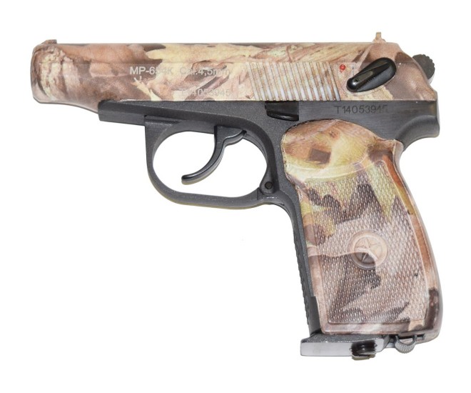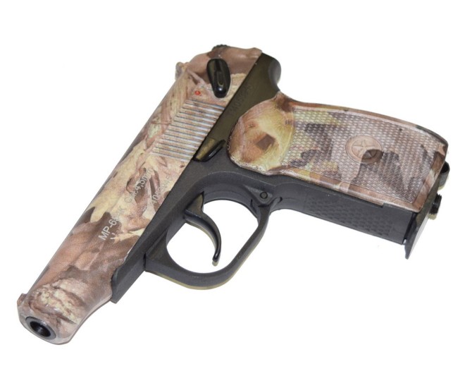 МР-654К-23 - это еще одна газобаллонная копия всем известного пистолета Макарова. Пистолет сделан в необычном камуфляжном дизайне, что придает ему крайне интересный вид. На Ижевском механическом заводе когда-то производился оригинальный пистолет Макарова. Разумеется, работники данного завода знают как можно сделать пистолет очень похожим на огнестрельный и превосходно справляются с такой задачей.