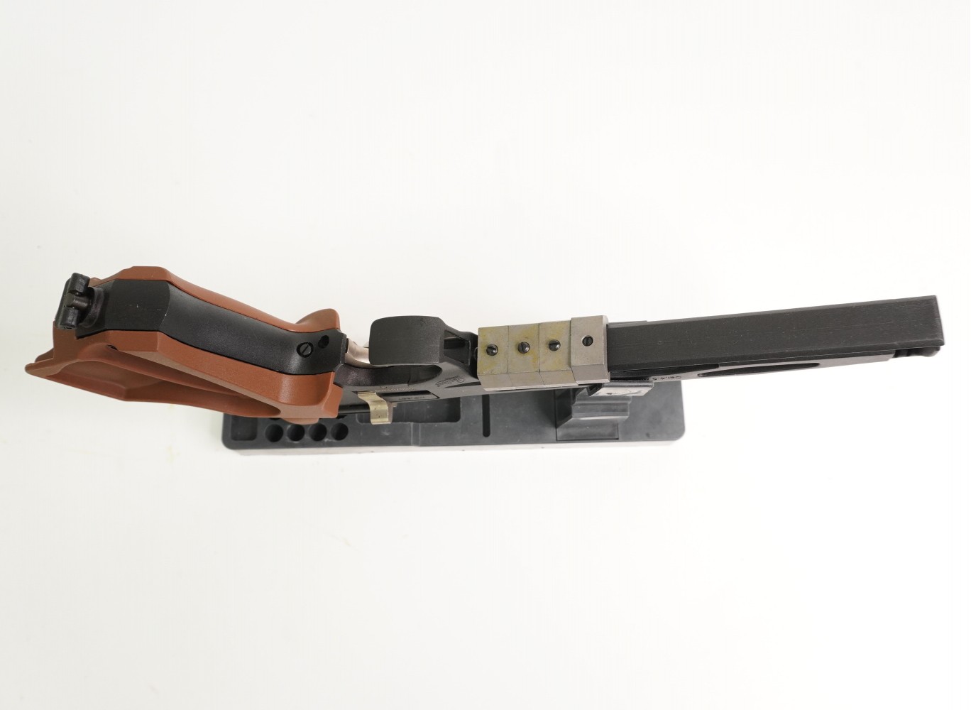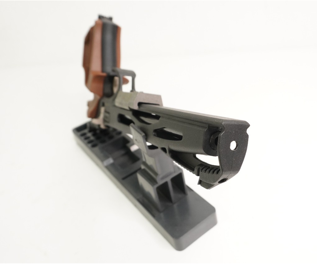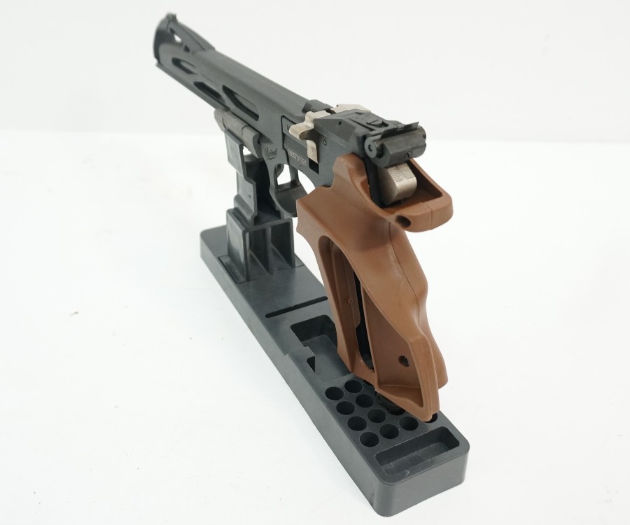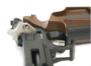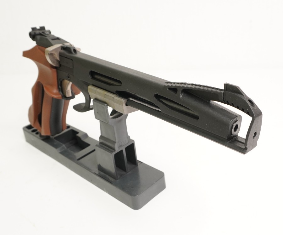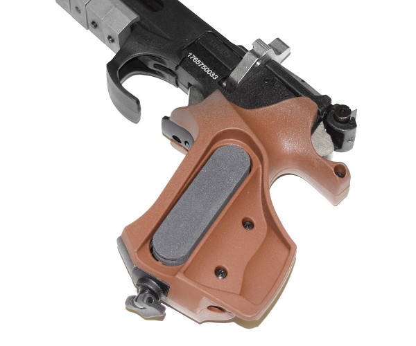 Данная модель отличается ортопедической формой рукоятки, выполненной из прочного пластика коричневого цвета. Кожух ствола пистолет также пластиковый. Корпус и его основные элементы изготовлены из стали. Имеется планка Пикатинни для установки балансировочных грузиков, фонаря или лазерного целеуказателя. Прицеливание выполняется по схеме «целик-мушка», элементы прицела регулируются. Весит пистолет 0,8 кг, длина – 36 см.