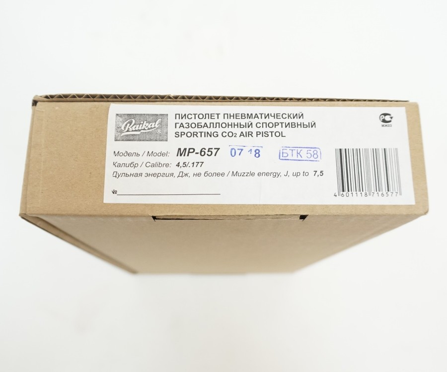 Пневматический пистолет МР-657 использует энергию газового баллончика, располагающегося в специальном резервуаре в рукоятке. Один баллончик обеспечивает стрелку возможность произвести порядка 60 выстрелов. Для стабилизации температуры баллончик оснащен парой теплообменников из алюминия, прикрепленных к нему магнитами. УСМ этой модели позволяет регулировать усилие спуска и предварительный ход. Интересно, что, помимо баллончика, можно использовать и другие переснаряжаемые емкости. Ствол пистолета нарезной, это повышает точность стрельбы и ее кучность. Кнопка предохранителя расположена на спусковом крючке. В качестве боеприпасов используются пули из свинца 4,5 мм, начальная скорость – 120 м/с.