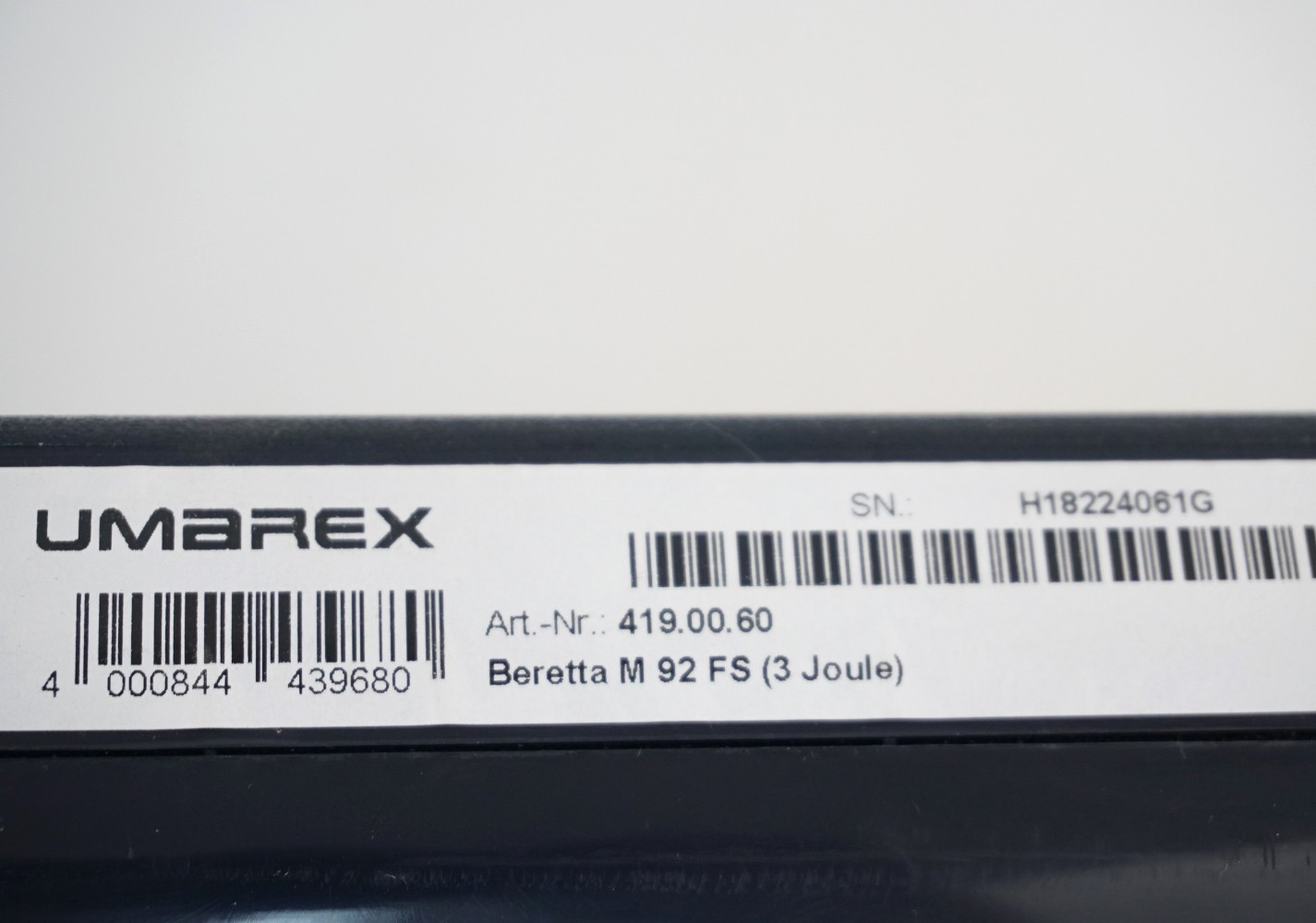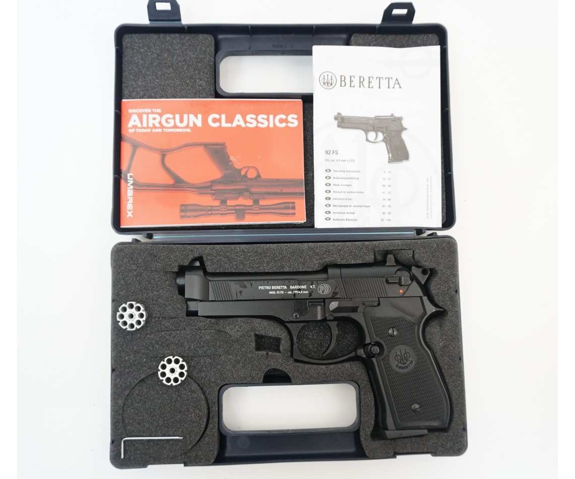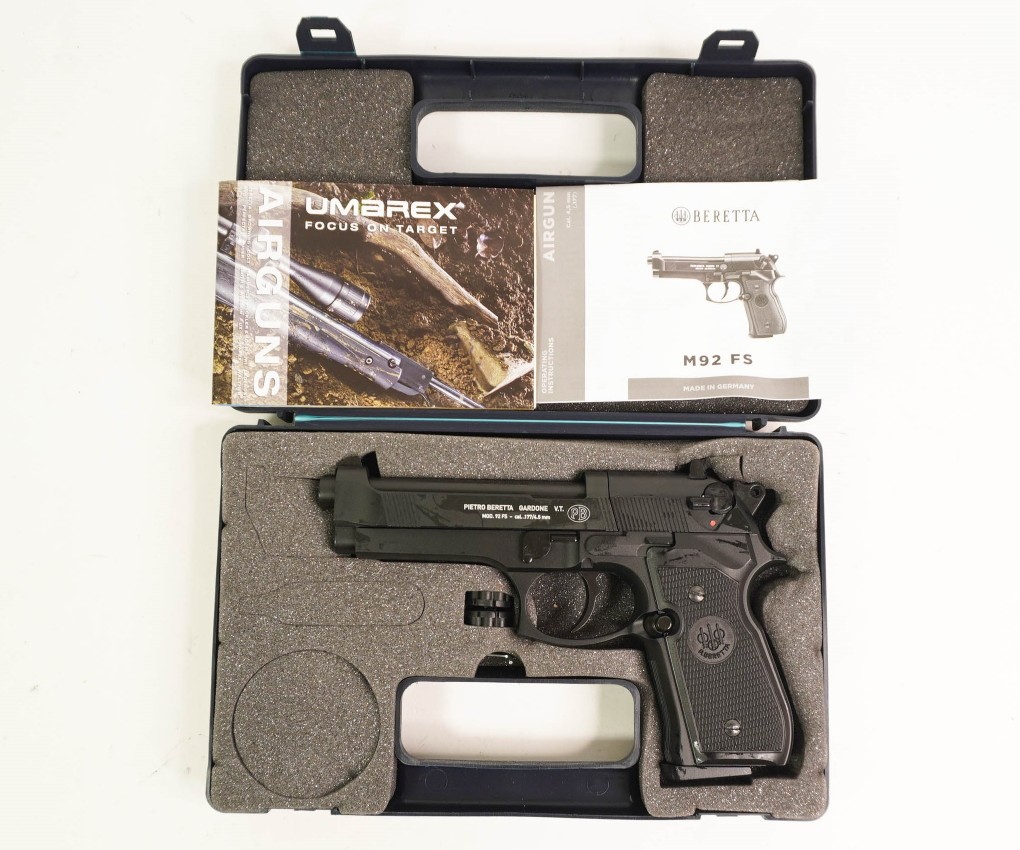 Пневматический пистолет Umarex Beretta 92 FS сделан практически полностью из металлического сплава, габариты его соответствуют огнестрельному прототипу, потому масса его 1,26 кг. Нарезной внутренний стволик сделан из высококачественной оружейной стали и служит гарантом высокоточной стрельбы. Накладки на рукоятке сделаны из чёрного пластика. Эта модель пневматического пистолета оборудована 2-сторонним предохранителем. В качестве магазина используется клип, который рассчитан на 8 пуль. Этот барабан-клип ставится в ствольную коробку пневматического пистолета.