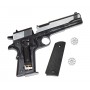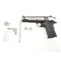 Присутствуют одновременно два предохранителя – один рычажный на раме, и клавишный на рукоятке с ее тыльной стороны. Мушка и целик регулируются. Ствол и корпус пистолета изготовлен из металла. На рукояти предусмотрена накладка из жесткой пластмассы, с рифленой поверхностью для обеспечения удобного хвата оружия. По внешнему виду и габаритам данный пистолет максимально схож с оригинальным боевым прототипом, вес 1,08 кг при длине 22 см. В комплекте поставки: ключ-шестигранник, два барабана, паспорт и футляр для хранения.