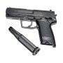 У данной модели неподвижен, рычаг затворной задержки лишь имитирует подлинный. Правее данного рычага расположен достаточно крупный флажок предохранителя. Пневматический пистолет Heckler & Koch USP имеет полноразмерный магазин, по внешнему виду схожий с обоймой для патронов. В него входят отсек для баллона, обойма для шариков, а также клапанный механизм пистолета. В магазине вмещаются 22 стальных шарика.