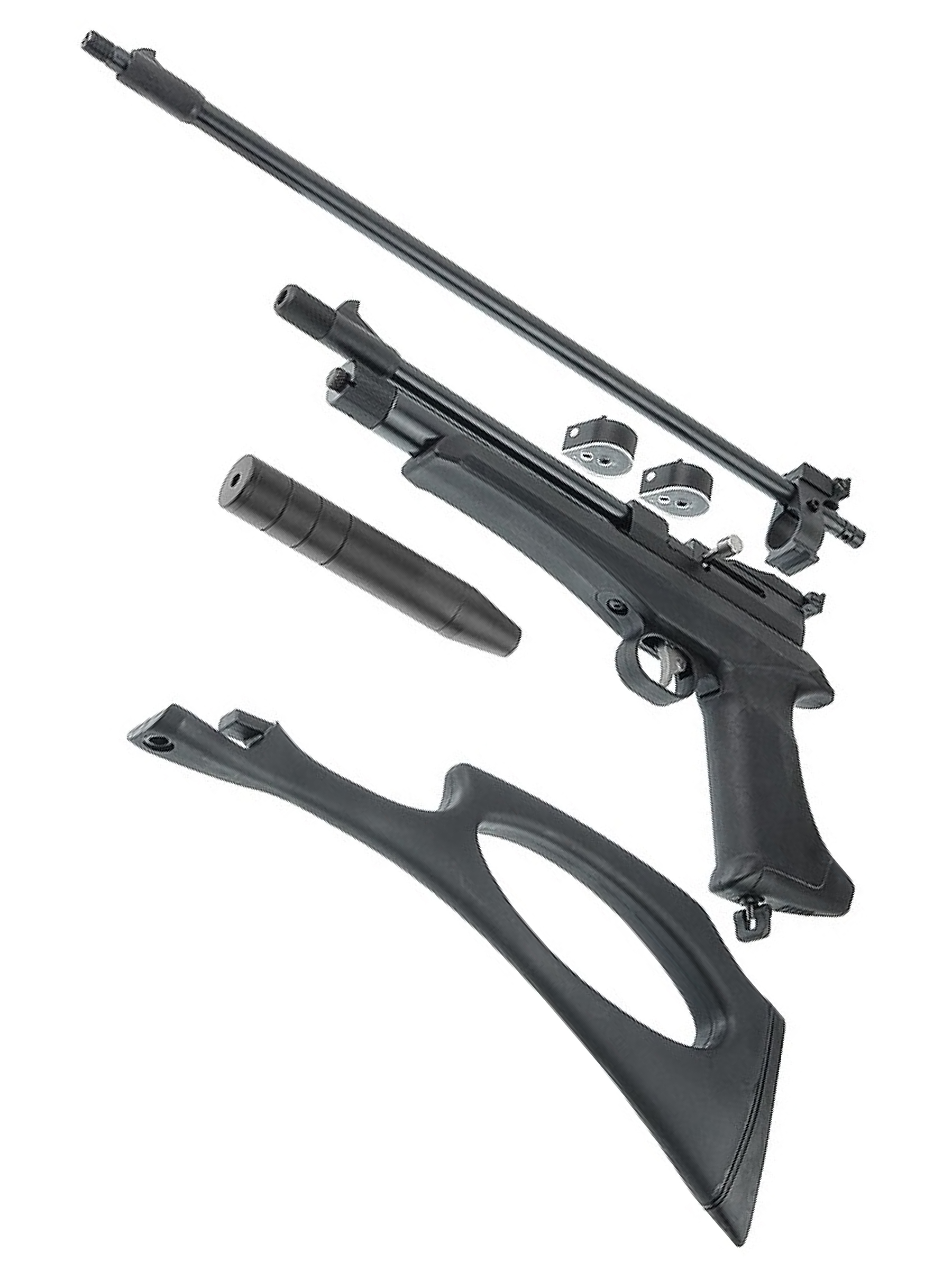 Пневматический пистолет-винтовка Black Strike B024 – это модификация оригинальной конструкции, отличающаяся доступной стоимостью при хороших технических характеристиках. Главной особенностью модели является возможность трансформации из пистолета в винтовку и обратно, причем процесс занимает минимум времени и совершенно не вызывает трудностей. Источник энергии – съемные баллоны с оксидом углерода, весом 12 г.