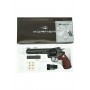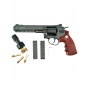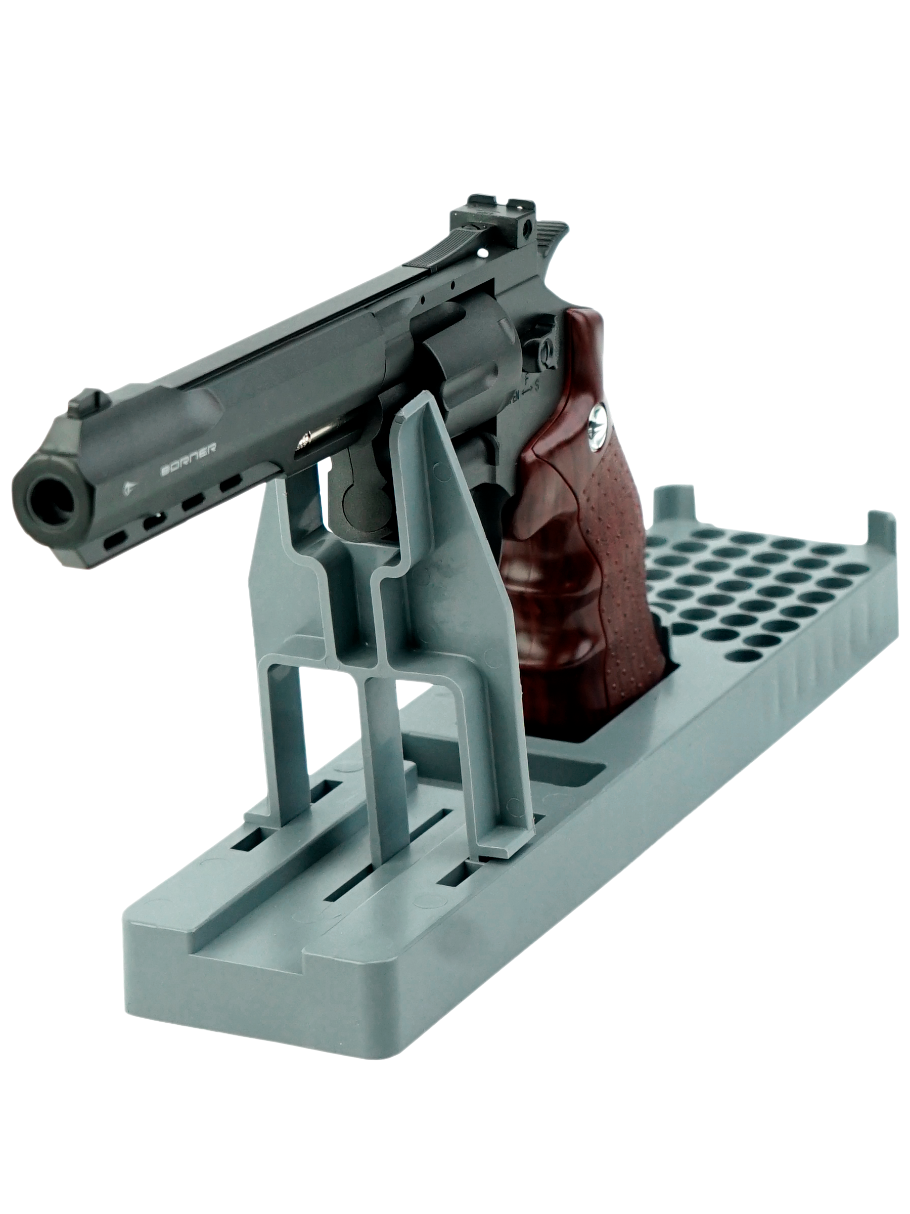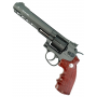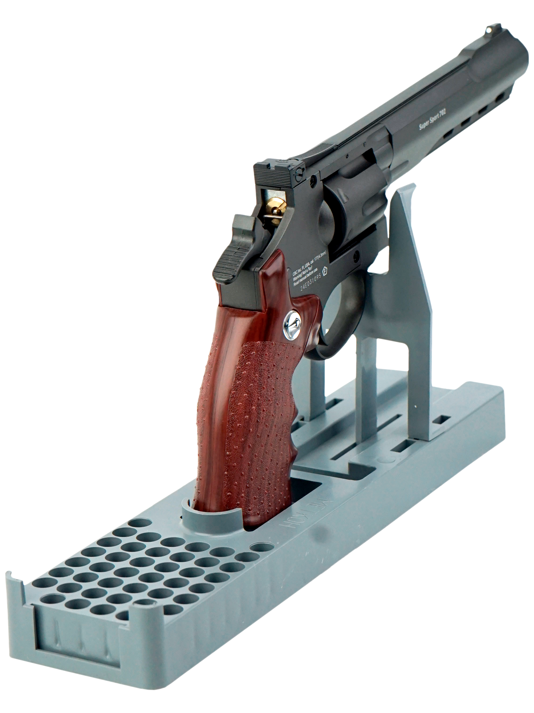 Освобождается барабан при нажатии специальной кнопки, находящейся на левой стороне револьвера. Заряженный фальшпатрон устанавливается в барабан. Вместе с пневматическим револьвером Borner Super Sport 702 поставляется ускоритель заряжания. Одного баллона достаточно для произведения 90 выстрелов на приемлемой скорости. Это благодаря приличной длине ствола и высокой скорости пули кучность и точность стрельбы на высоком уровне. Этот револьвер будет оптимальным выбором для любителей пневматического оружия, копирующего огнестрельные аналоги. Подойдет он и стрелкам, предпочитающим неторопливое поражение мишеней.