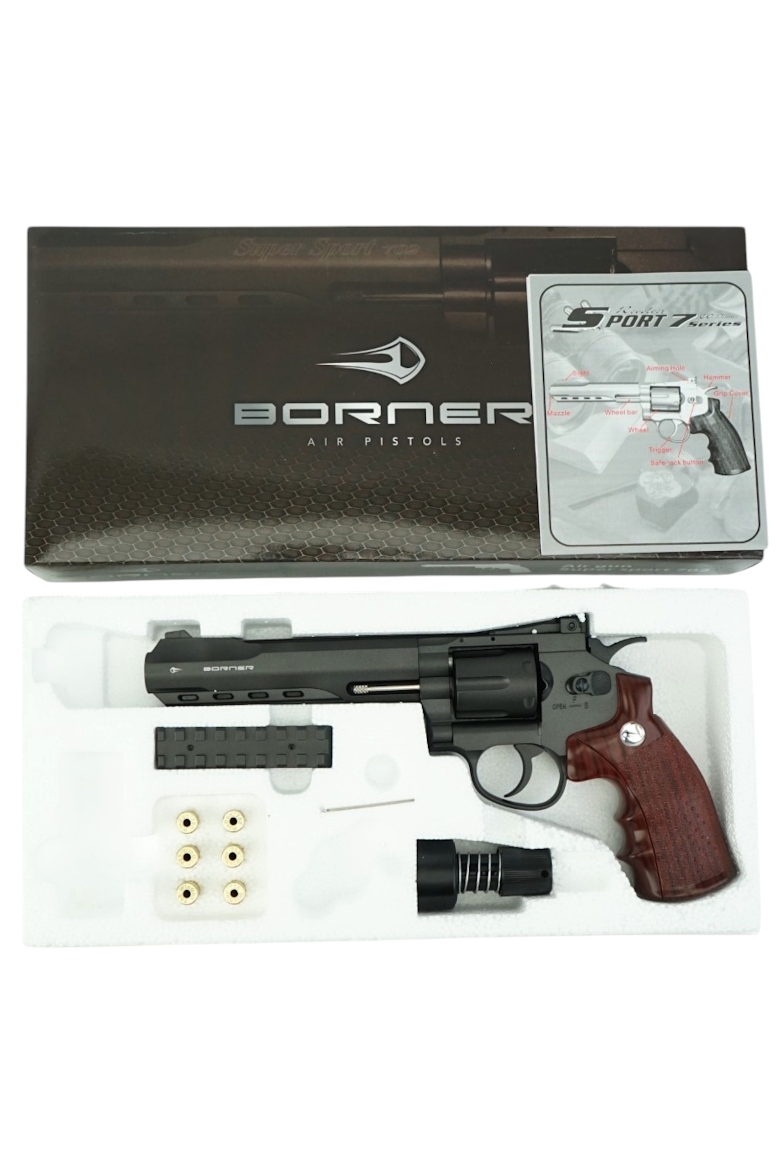 В комплекте с револьвером Borner Super Sport 702 идет 6 фальшпатровов - полный барабан. В коробке также можно найти ускоритель заряжания и планку Вивера с ключом для крепления. Прилагается и подробная инструкция, в которой наглядно показано, как установить баллон, регулировать прицел, устанавливать планку Вивера. Расписаны и меры безопасности, соблюдение которых обязательно при обращении с оружием и стрельбе.