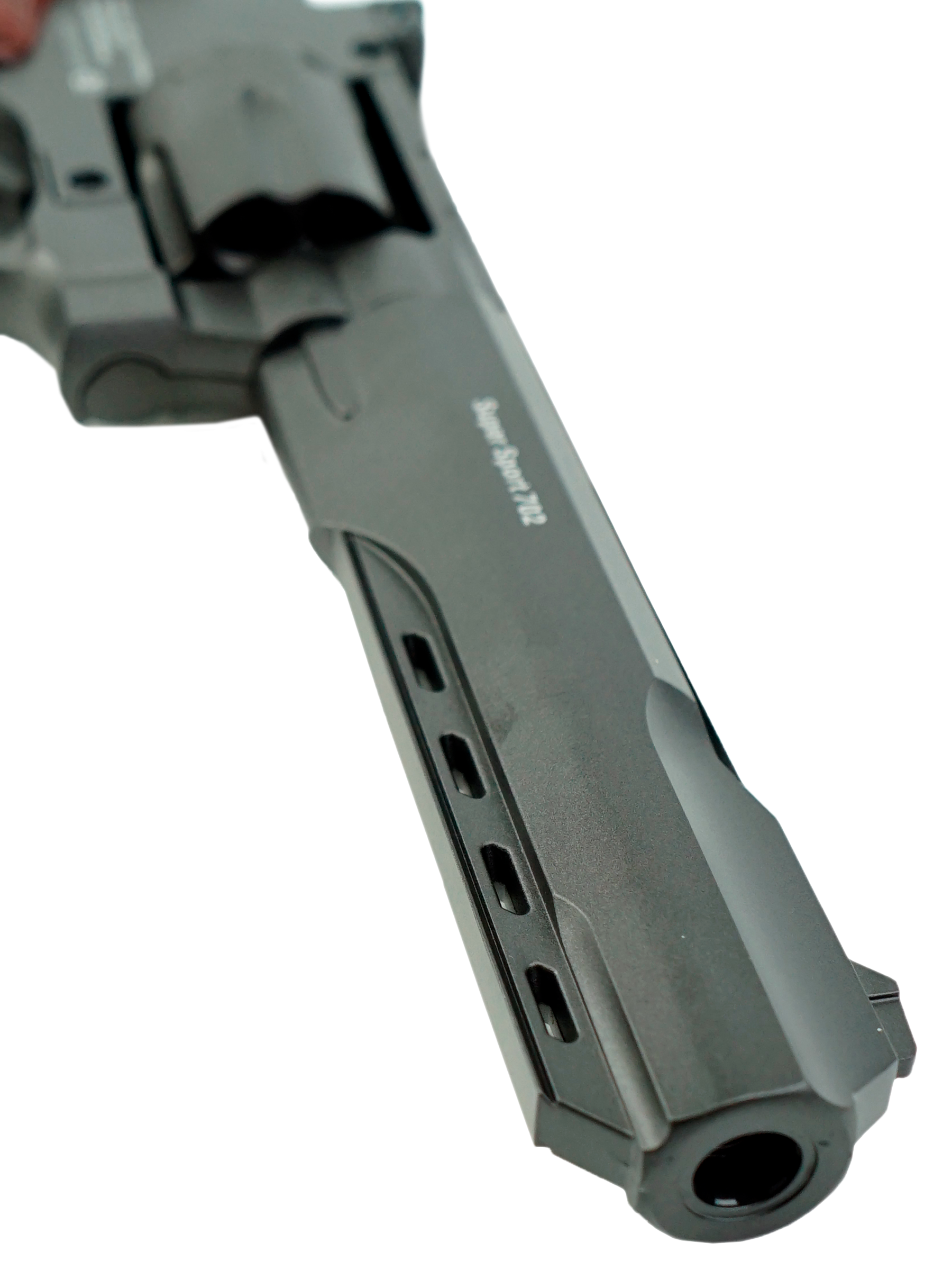 Интерес, который вызывает пневматическое оружие с фальшпатронами, связан в первую очередь с копированием процесса обращения с огнестрельными моделями. Револьвер Borner Super Sport 702 - один из представителей оружия такого рода. Длина ствола в 6 дюймов делает его довольно привлекательным и органично выглядящим в руке. Внешний ствол сделан из легкого сплава металла, внутри же находится стальной стволик. Несмотря на 900 грамм веса, оптимального для столь больших габаритов, рука не ощущает тяжести.