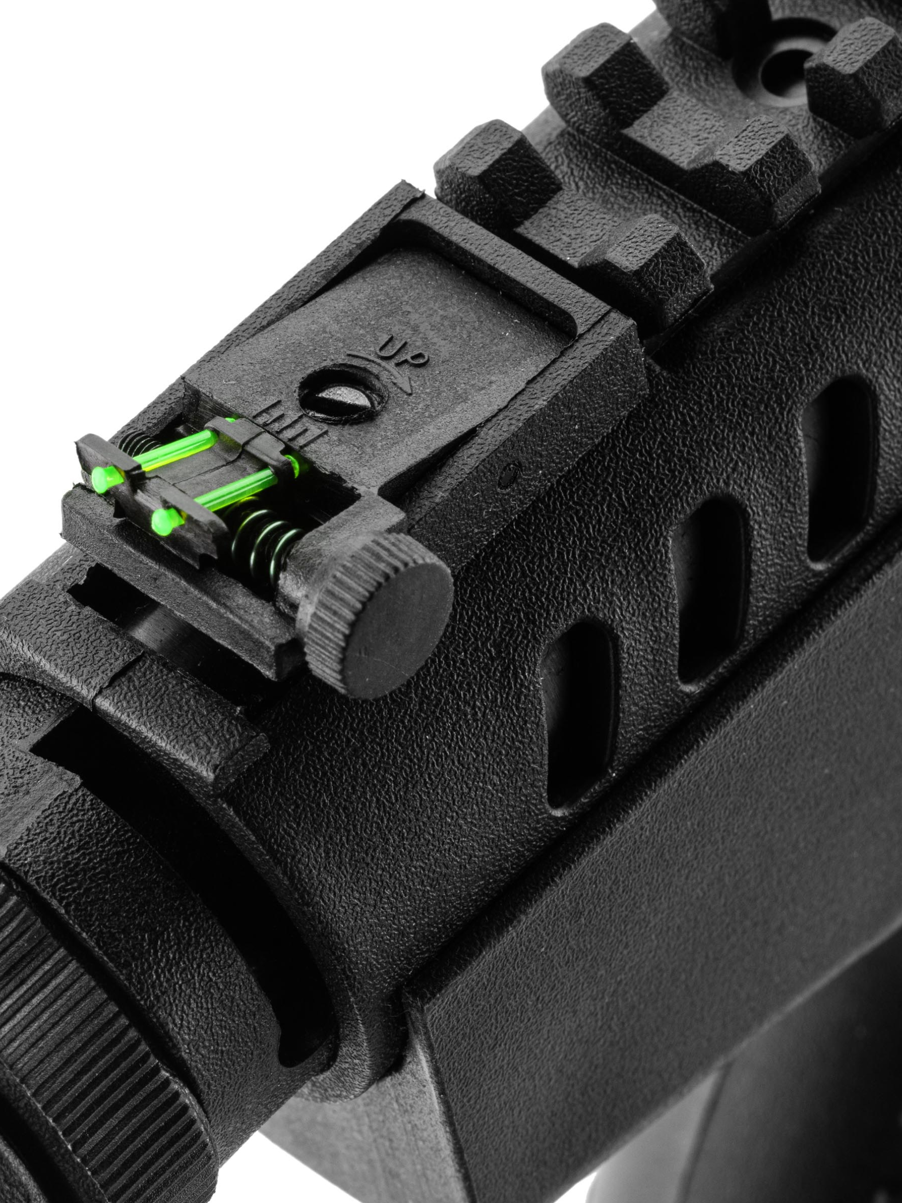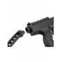 Для безопасного обращения пистолет оснащен ручным кнопочным предохранителем, расположенным над спусковой скобой. Базовая прицельная система — открытая, с мушкой. Для установки оптических или коллиматорных прицелов на рамке интегрирована планка Пикатинни стандартной ширины 21 мм и длиной 95 мм.