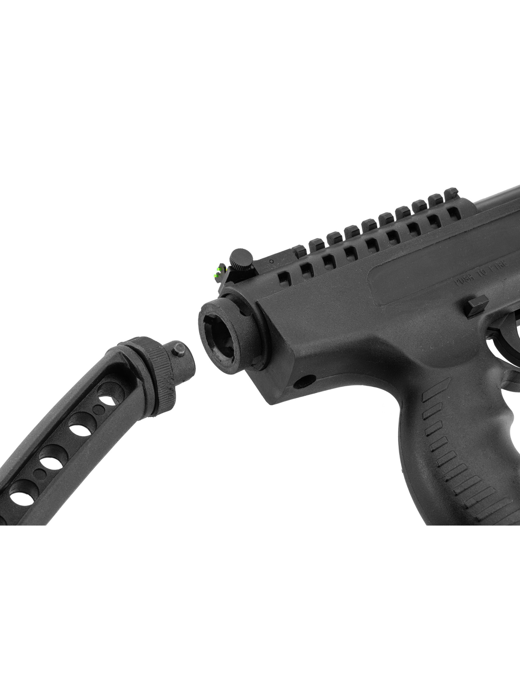 Ключевой особенностью пистолета является съемный рамочный приклад из полимера. Его установка превращает оружие в компактную винтовку длиной до 625 мм, значительно повышая устойчивость и точность при стрельбе.