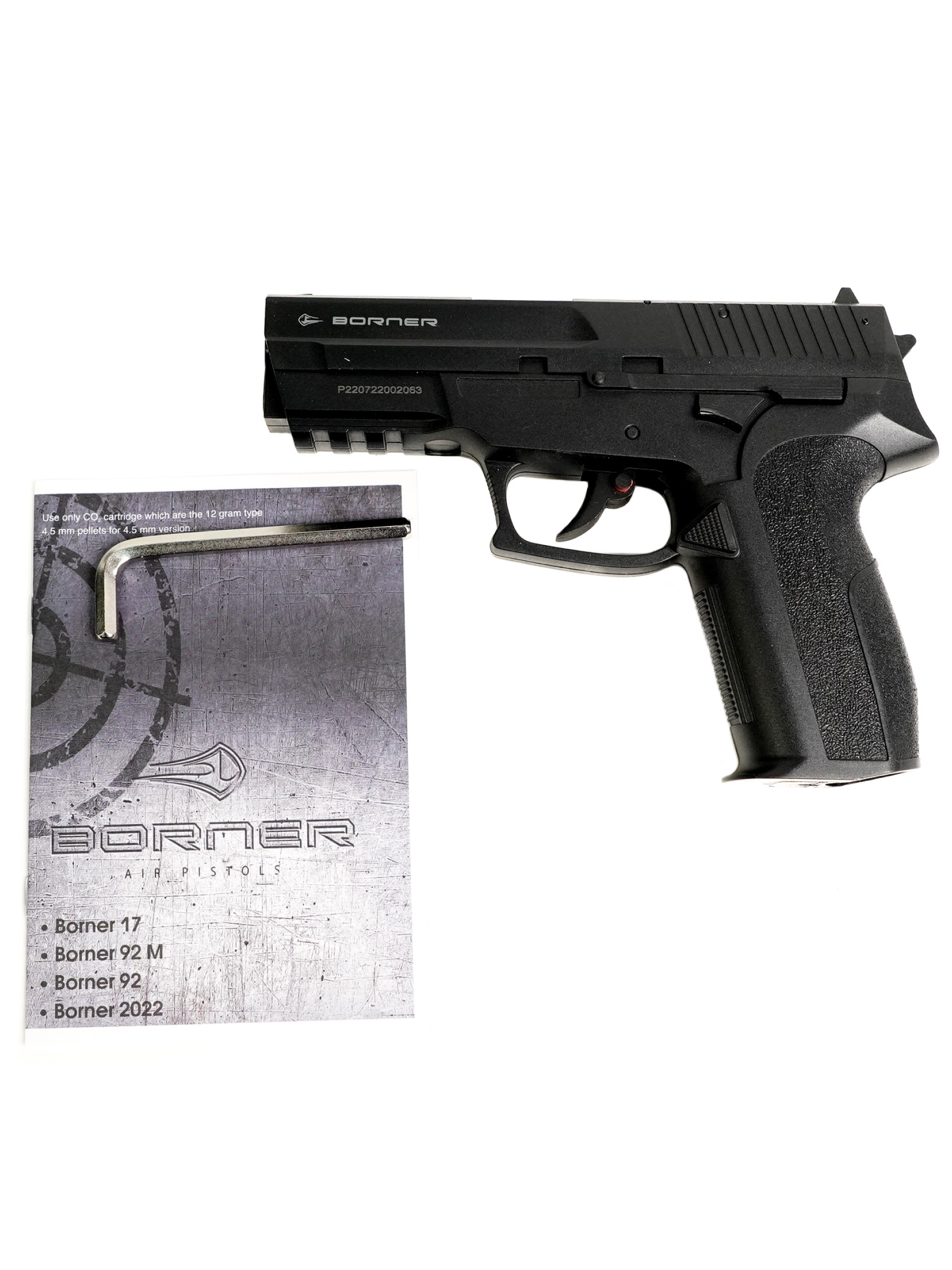 В комплекте поставки вы найдете: пистолет Borner 2022, магазин, шестигранник для обслуживания, инструкцию по эксплуатации и фирменную коробку.