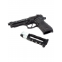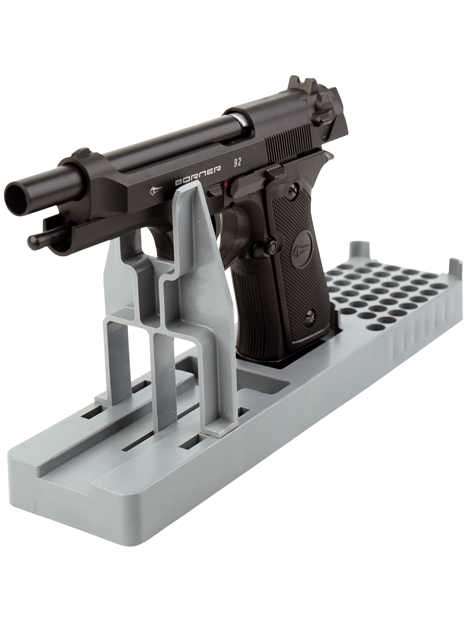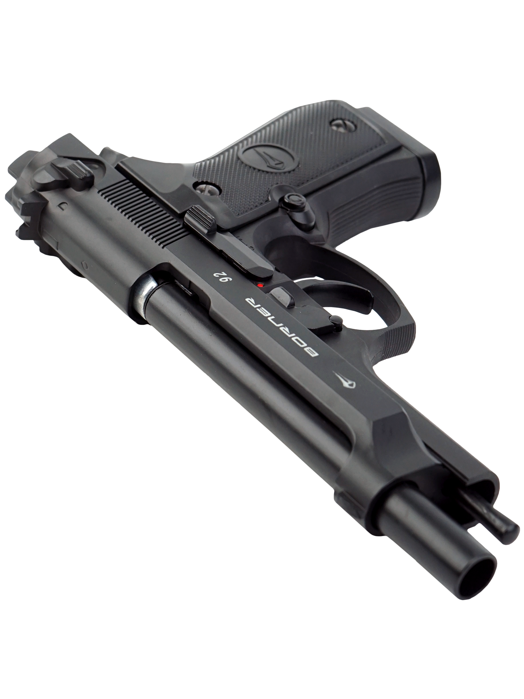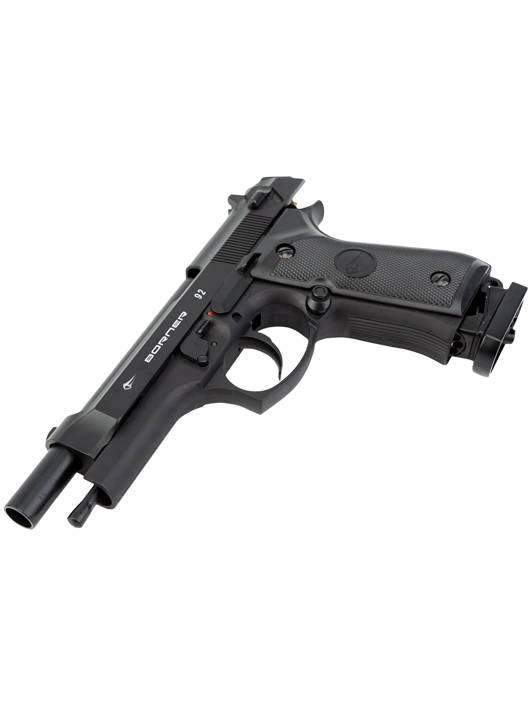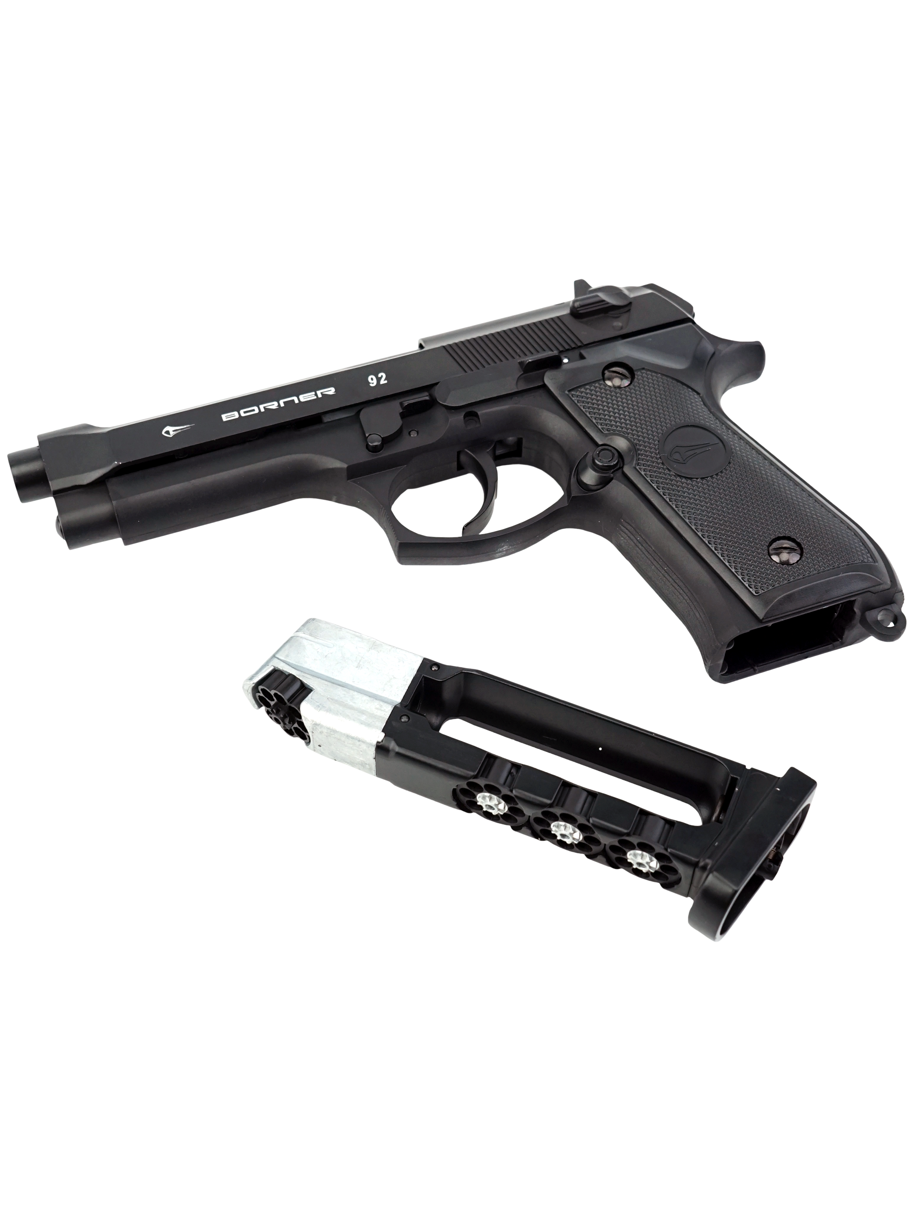 Пневматический пистолет Borner 92 разработан для стрельбы свинцовыми пулями калибра 4,5 мм. В основе его работы лежит газобаллонная система, активируемая кнопкой, расположенной у спусковой скобы. В специальном отсеке размещается основной барабан и три дополнительных магазина, каждый из которых рассчитан на восемь зарядов.