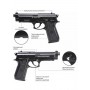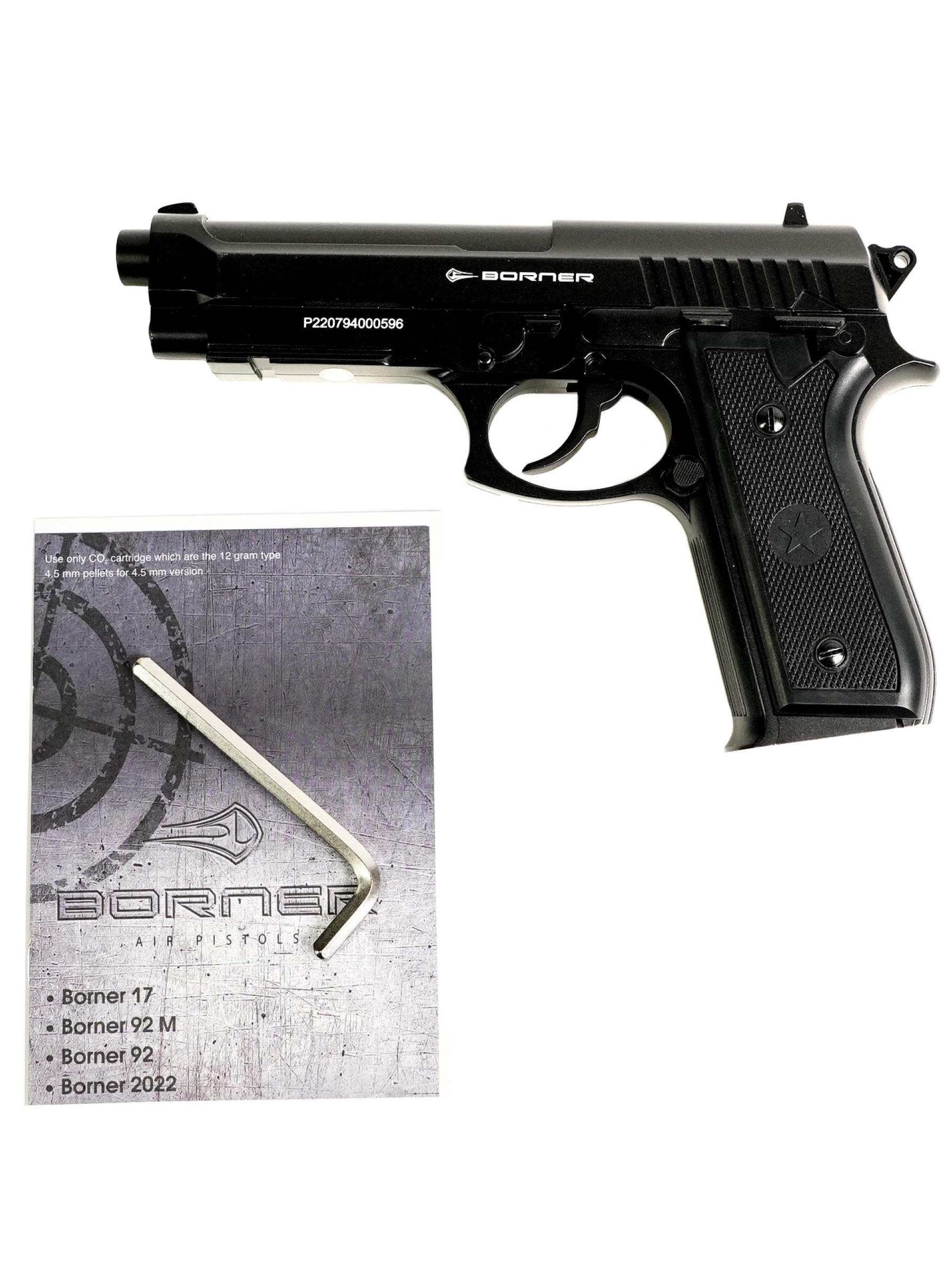 В отличие от младших моделей, Borner 92M имеет цельнометаллический корпус и ствол, что делает его не только более прочным и долговечным, но и добавляет веса (920 г), создавая ощущение настоящего оружия в руке. Благодаря отсутствию Blowback, конструкция пистолета максимально надежна. Ударно-спусковой механизм только двойного действия (самовзводом) обеспечивает простоту использования и безопасность. Для безопасного обращения с оружием предусмотрен неавтоматический, кнопочно-сдвижной предохранитель.