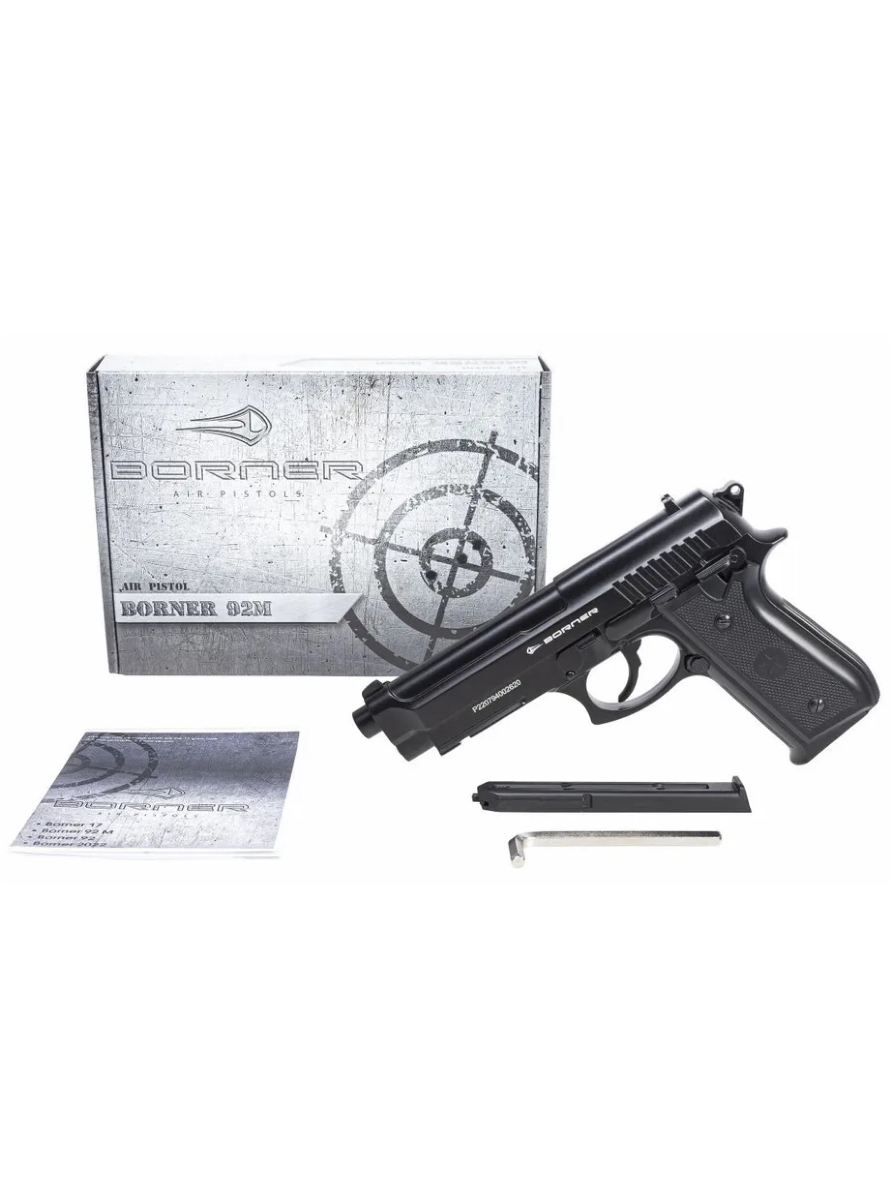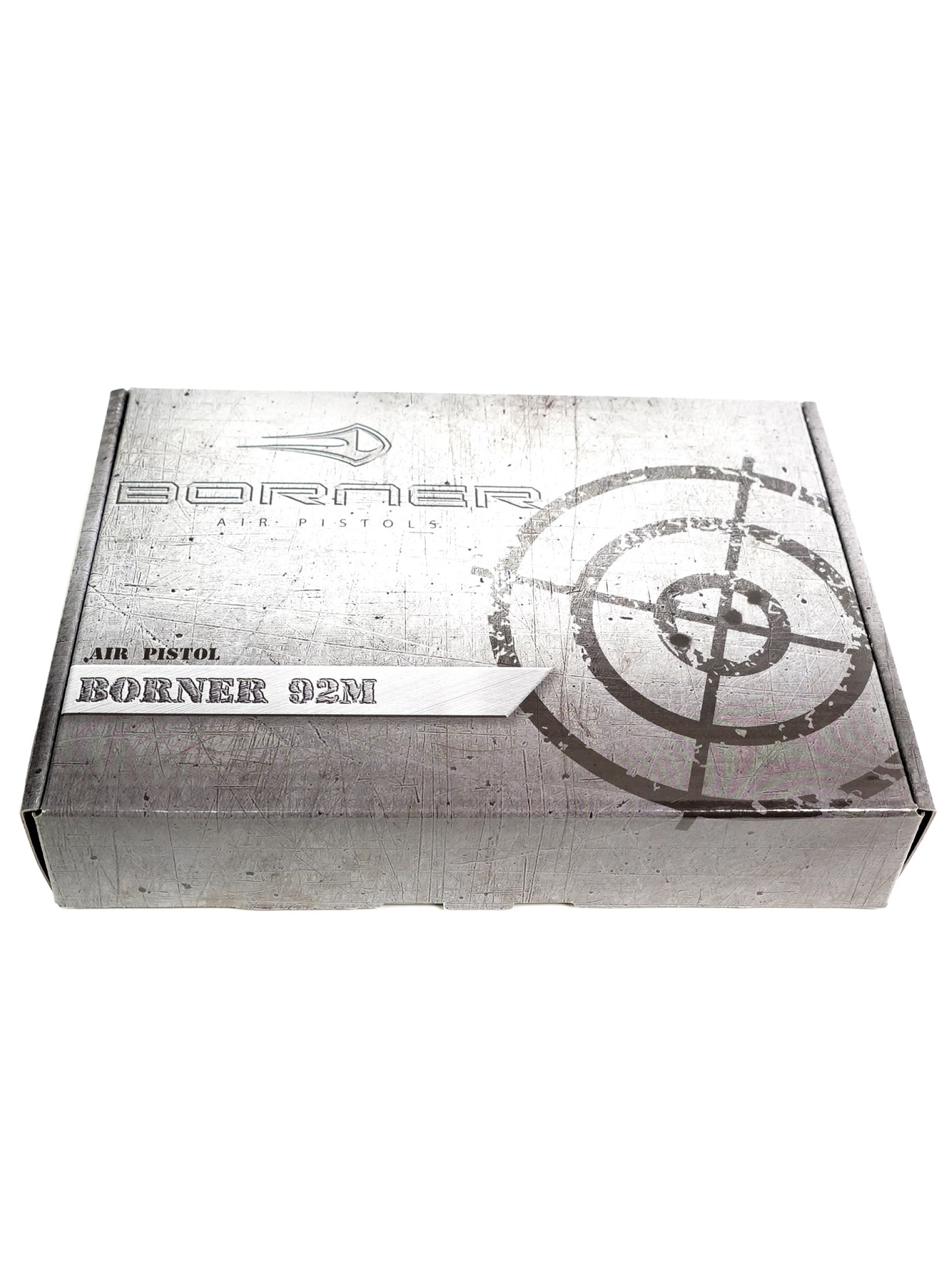 Borner 92M оснащен нерегулируемыми прицельными приспособлениями (целик и мушка) для быстрого прицеливания. Под стволом расположена планка Weaver/Picatinny, позволяющая установить дополнительные аксессуары, такие как лазерный целеуказатель или тактический фонарик. Длина пистолета составляет 213 мм. В комплекте поставки вы найдете пистолет Borner 92M, магазин, шестигранный ключ для обслуживания, инструкцию по эксплуатации и фирменную коробку.