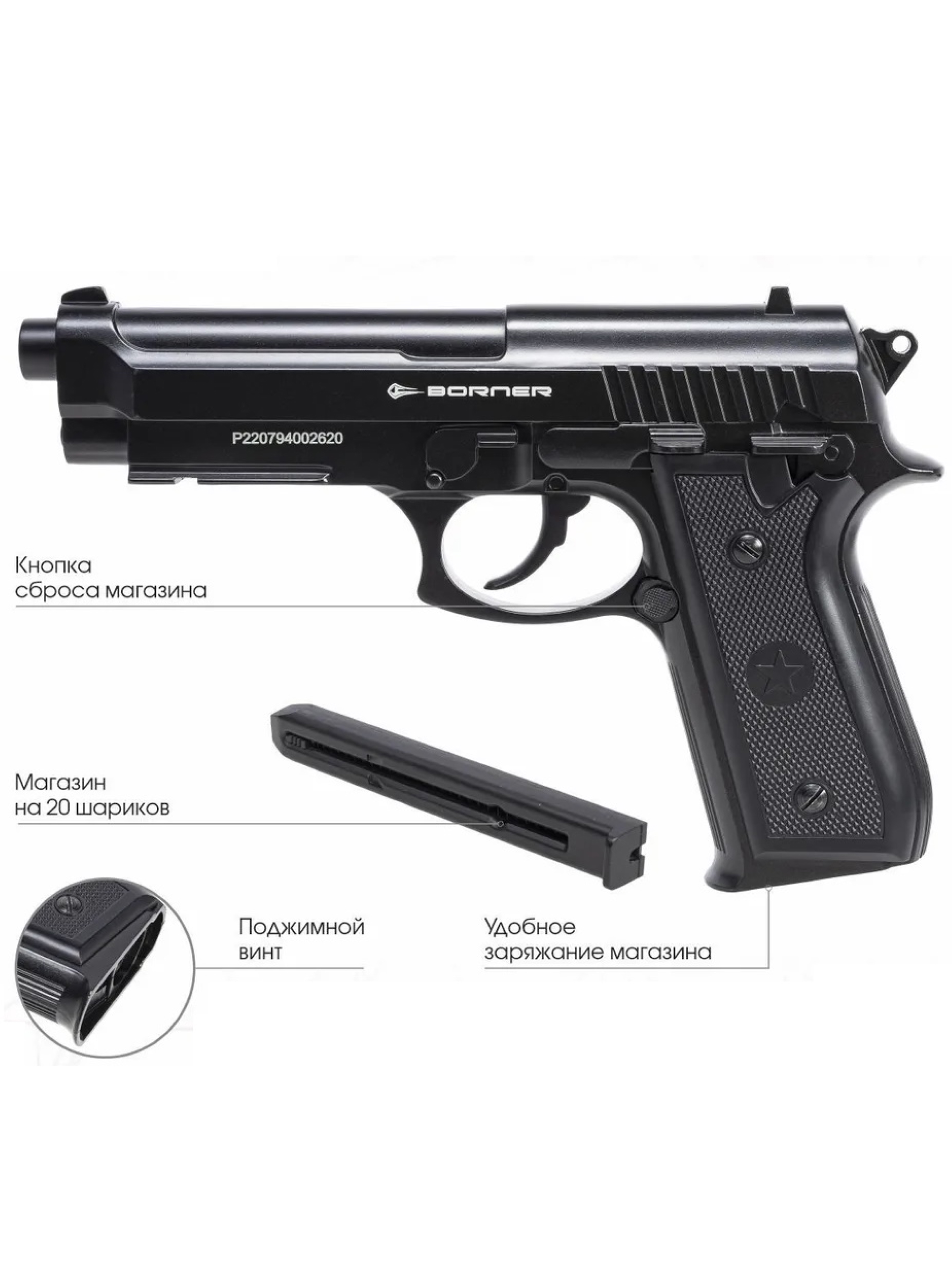 Пневматический пистолет Borner 92M – повторяет в точности культовый Beretta M92 FS, выполненной в прочном и солидном цельнометаллическом корпусе! Эта модель, разработанная компанией Borner (США/Тайвань), сочетает в себе узнаваемый дизайн, высокую надежность и превосходные стрелковые характеристики. Borner 92M – идеальный выбор для тех, кто ценит качество и реализм.