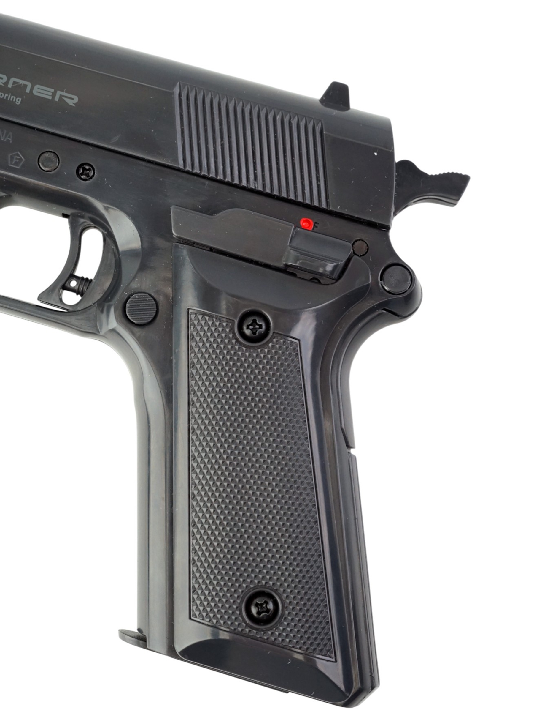 Оснащенный пружинно-поршневой системой, пистолет работает без использования газа или CO2, что делает его более безопасным и экономичным. Модель обладает мощностью до 3 Дж и скоростью выстрела до 120 м/с, что позволяет точно вести огонь по мишеням или для развлечения. Емкость магазина — 20 шариков BB диаметром 4,5 мм, что обеспечивает достаточно выстрелов для тренировок или игр.