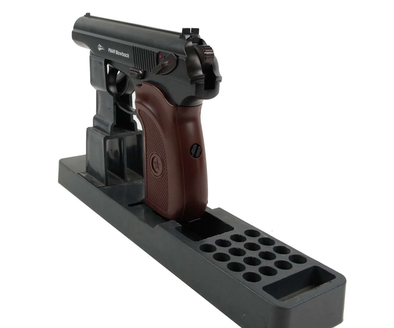 Borner ПМ49 Blowback на рукоятке имеет темно-коричневую накладку, дополняющую сходство с известным Макаровым. Чтобы установить баллончик с СО2, необходимо сдвинуть пистолетную рукоятку назад. При этом открывается доступ к посадочному месту и поджимному винту.