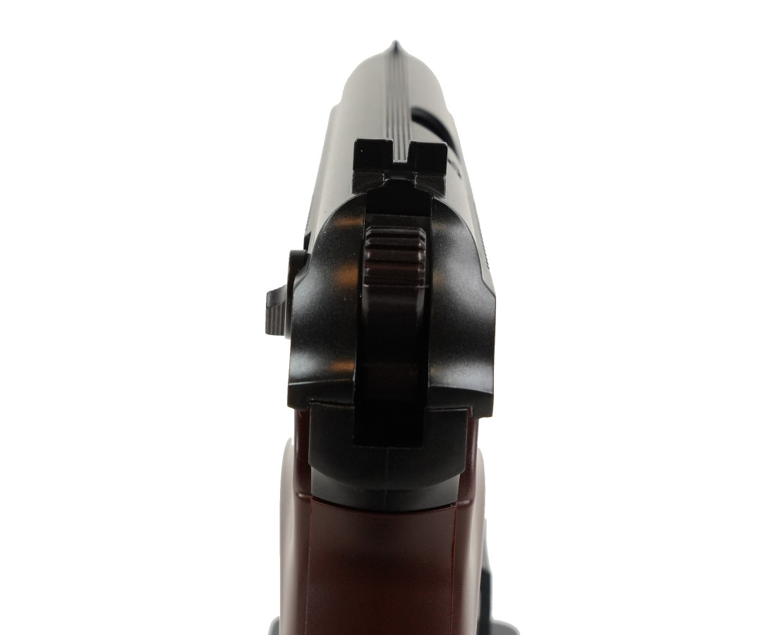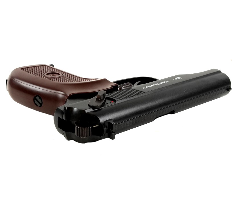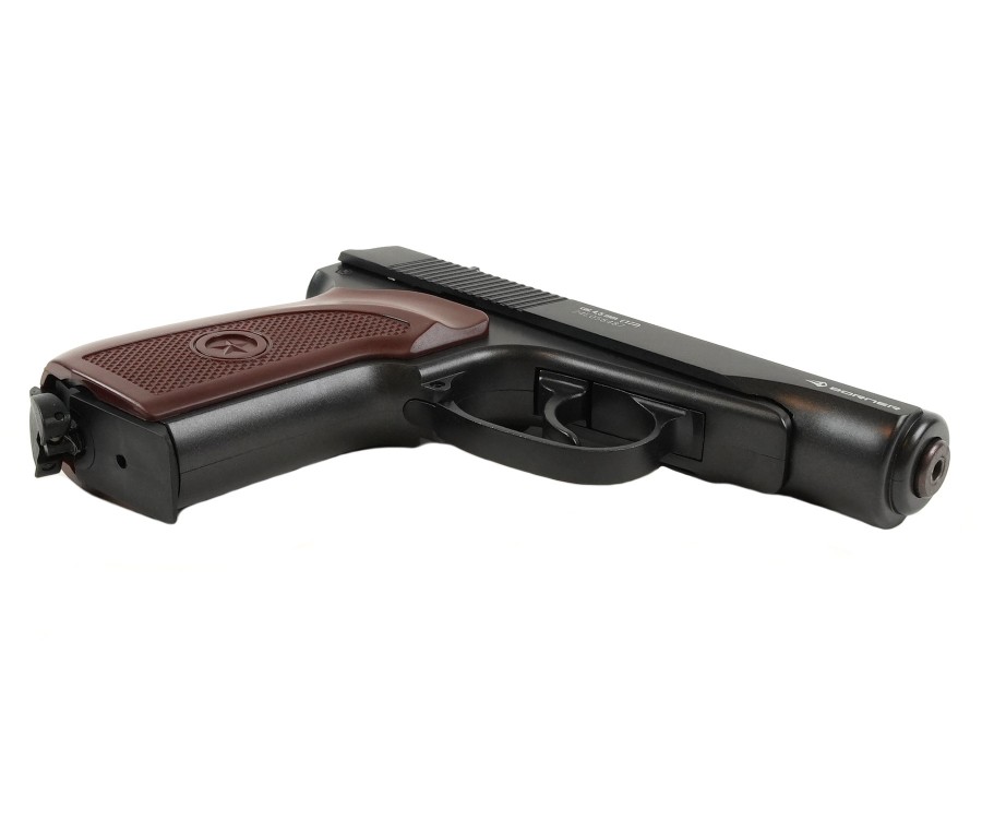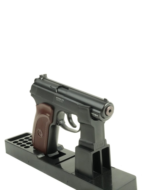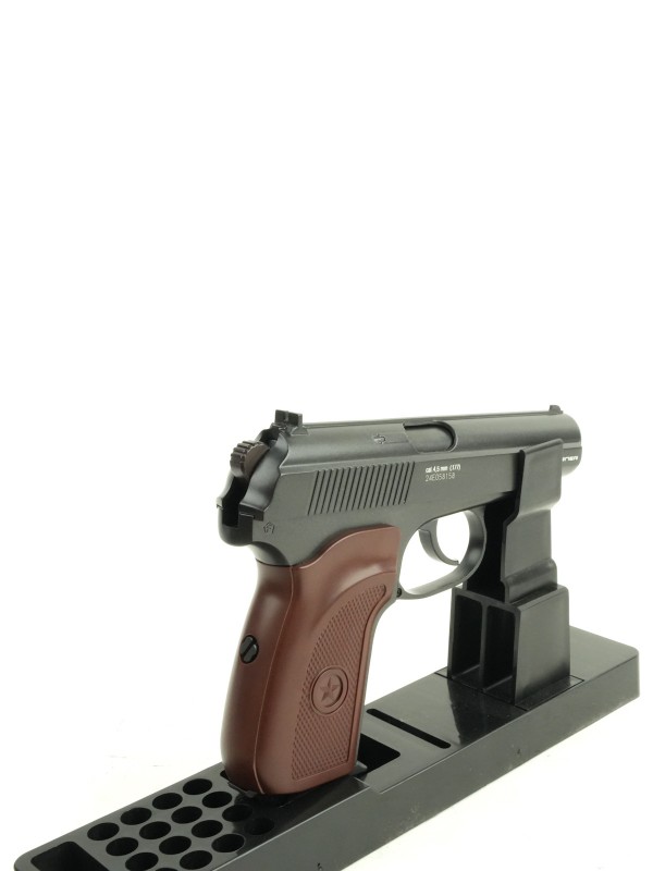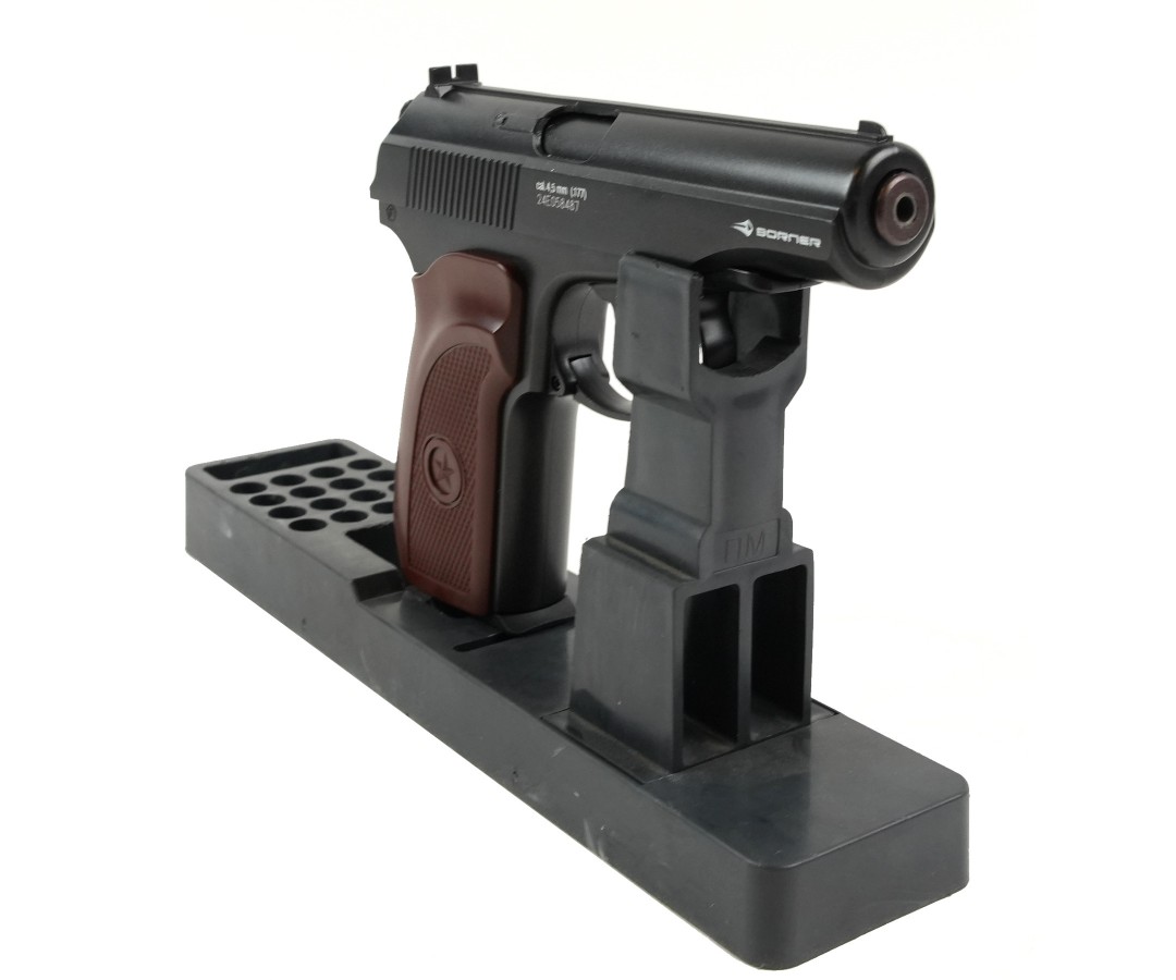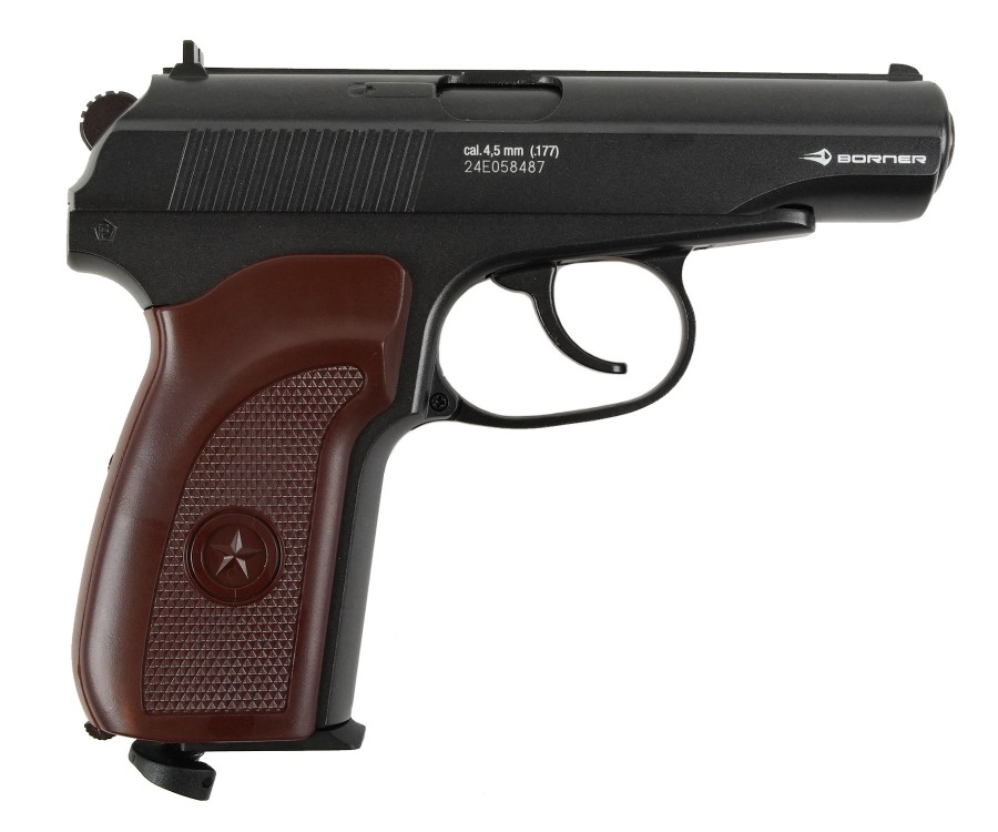 Это стильная копия знаменитого пистолета Макарова оснащена функцией Blowback от американской компании Borner. Калибр оружия – 4,5 мм, а емкость магазина – 17 пуль (стальных шаров BB).