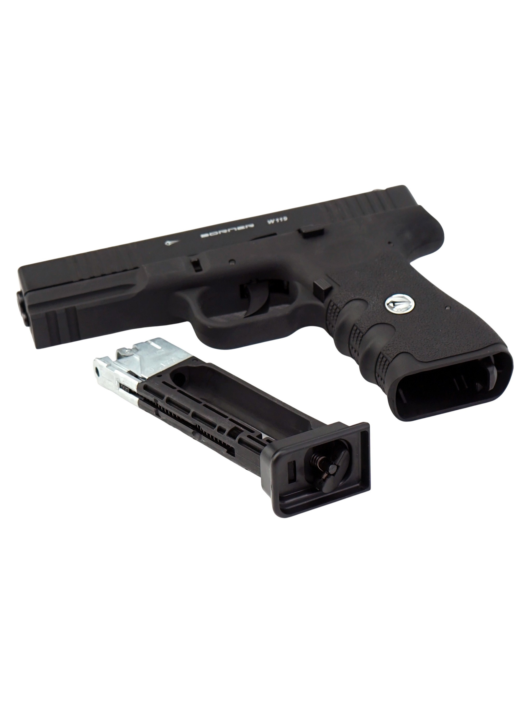 Borner Special Force W119 – это газобаллонная пневматика калибра 4,5 мм (.177), работающая на стандартных 12-граммовых баллончиках CO2. Забудьте о сложном взведении – просто установите баллончик, зарядите магазин на 16 шариков BB, и вы готовы к стрельбе! Благодаря гладкому стволу, пистолет разгоняет шарики до 110 м/с, обеспечивая кучность и дальность, достаточные для развлечения и тренировок.