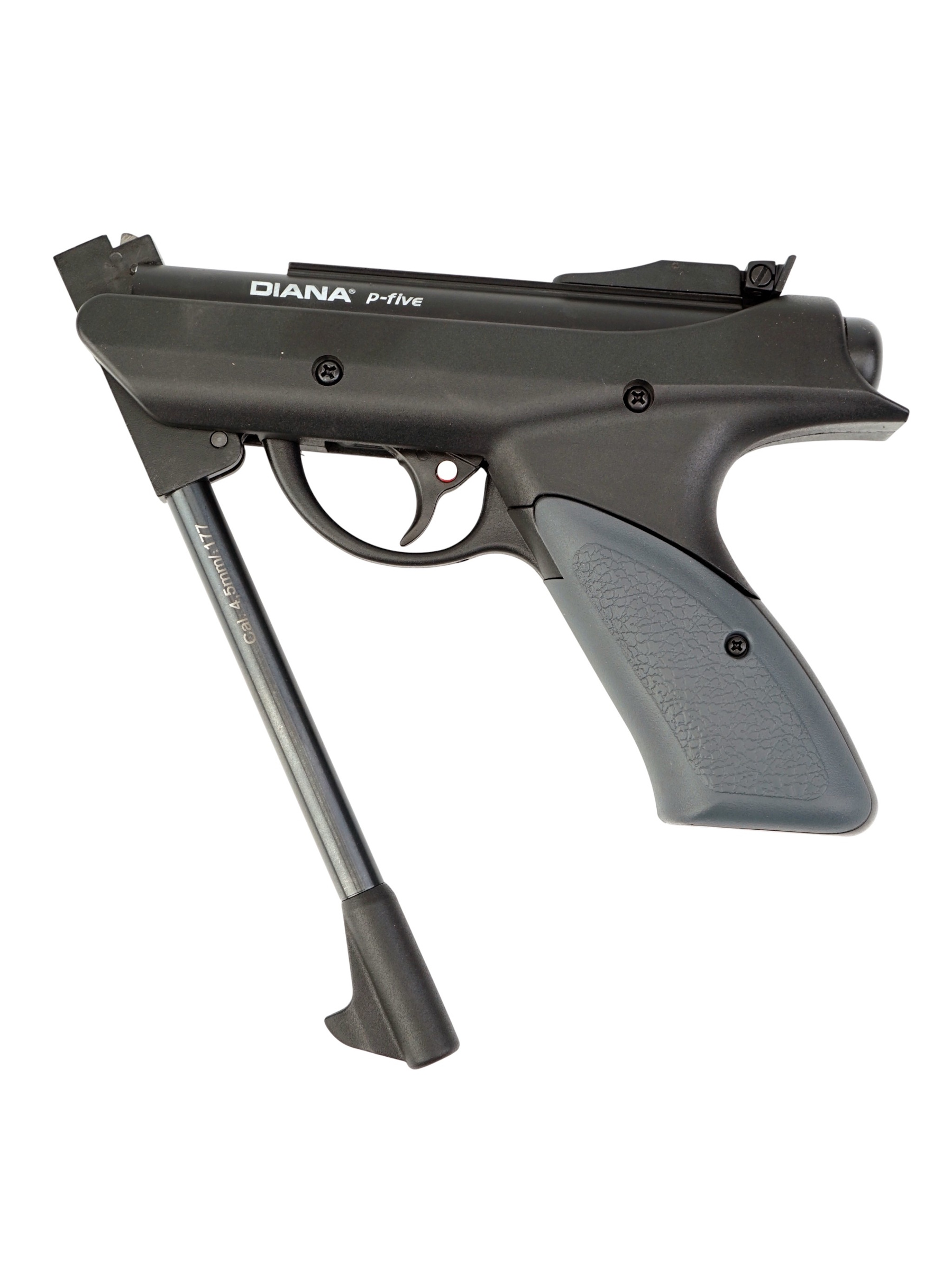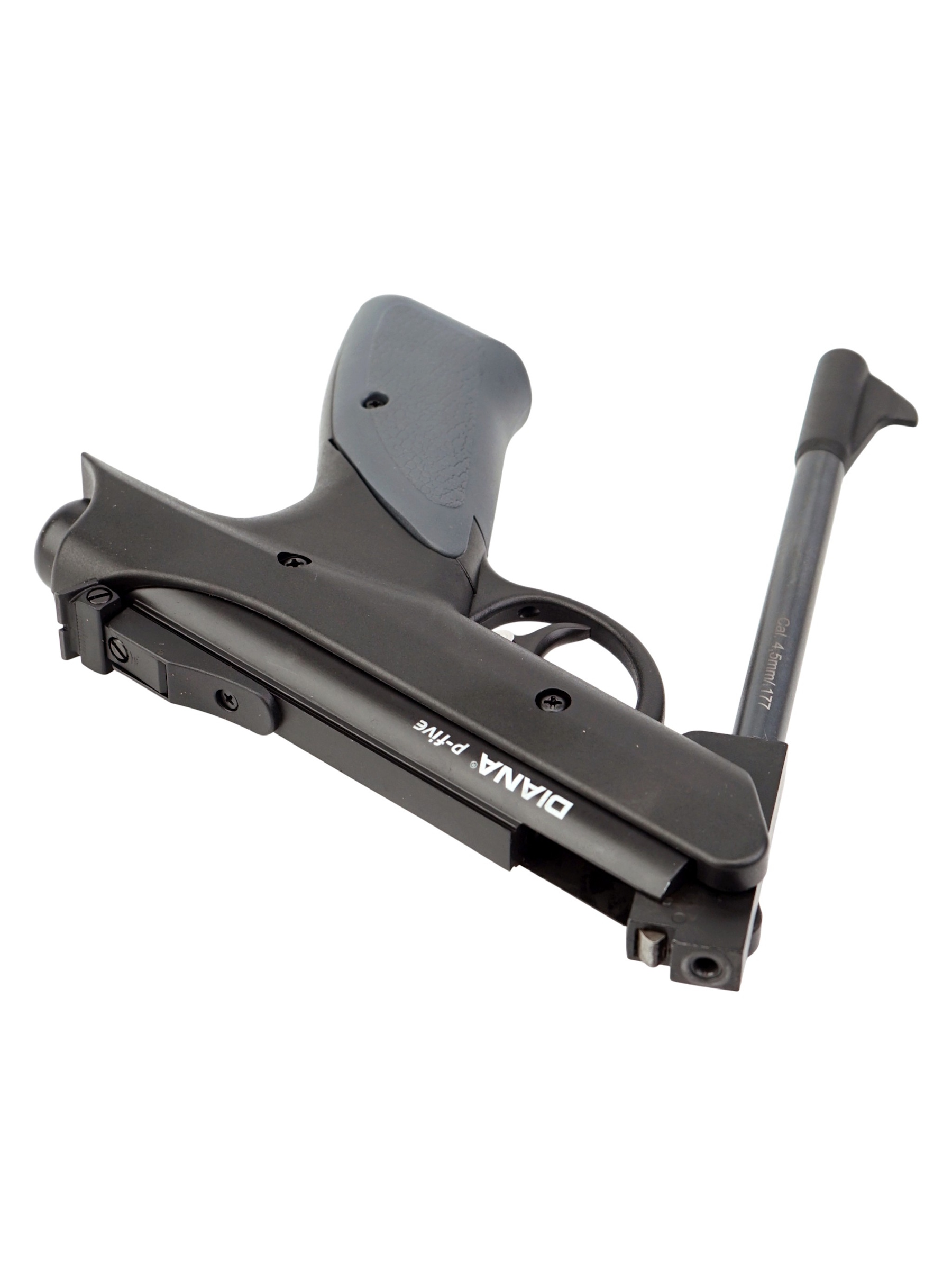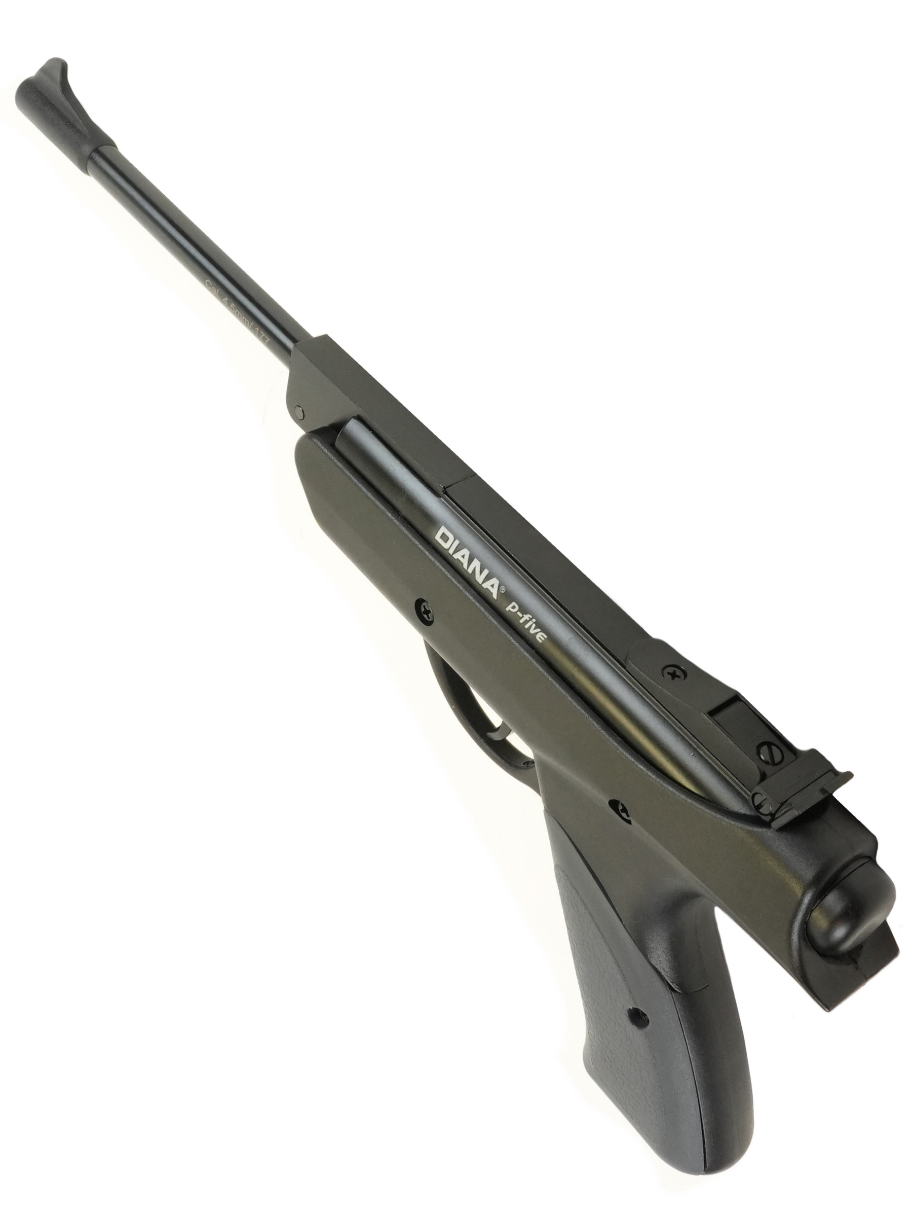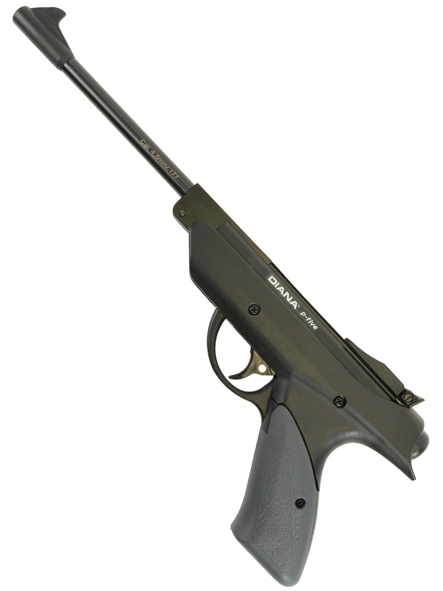 Diana P-Five не имеет боевого прототипа, но это нисколько не снижает его достоинств. Благодаря пружинно-поршневой системе и взведению переламыванием ствола, вы получаете полностью автономное оружие, не требующее ни баллончиков, ни внешних источников энергии. Ствол, изготовленный из металла, имеет нарезку, что обеспечивает высокую точность и кучность стрельбы. Пистолет использует пули для пневматики калибра 4,5 мм (.177), а начальная скорость пули достигает 110-120 м/с.