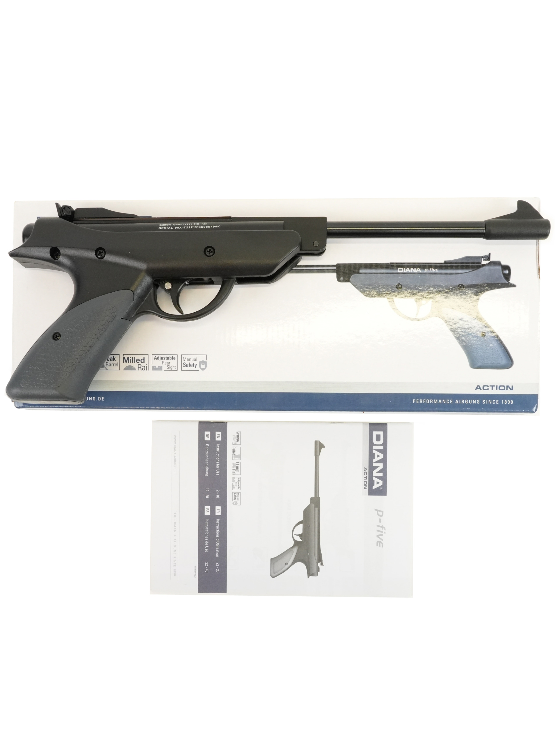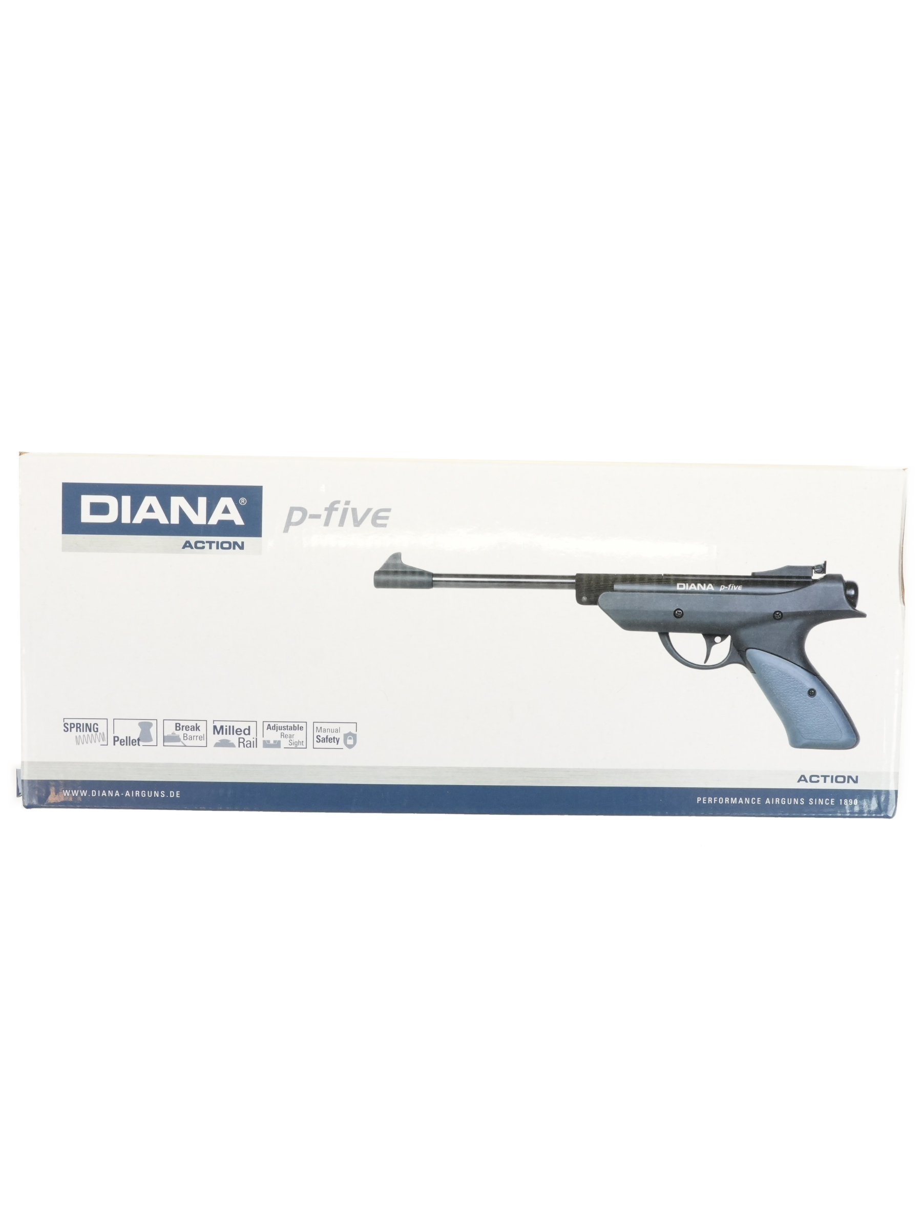 Diana P-Five оснащен планкой «ласточкин хвост» для установки оптики или коллиматорного прицела, что позволяет еще больше расширить возможности для точной стрельбы. Общая длина пистолета составляет 380 мм, при этом длина ствола – 220 мм. В комплекте поставки вы найдете пистолет Diana P-Five, подробную инструкцию и практичный кейс для хранения и транспортировки.