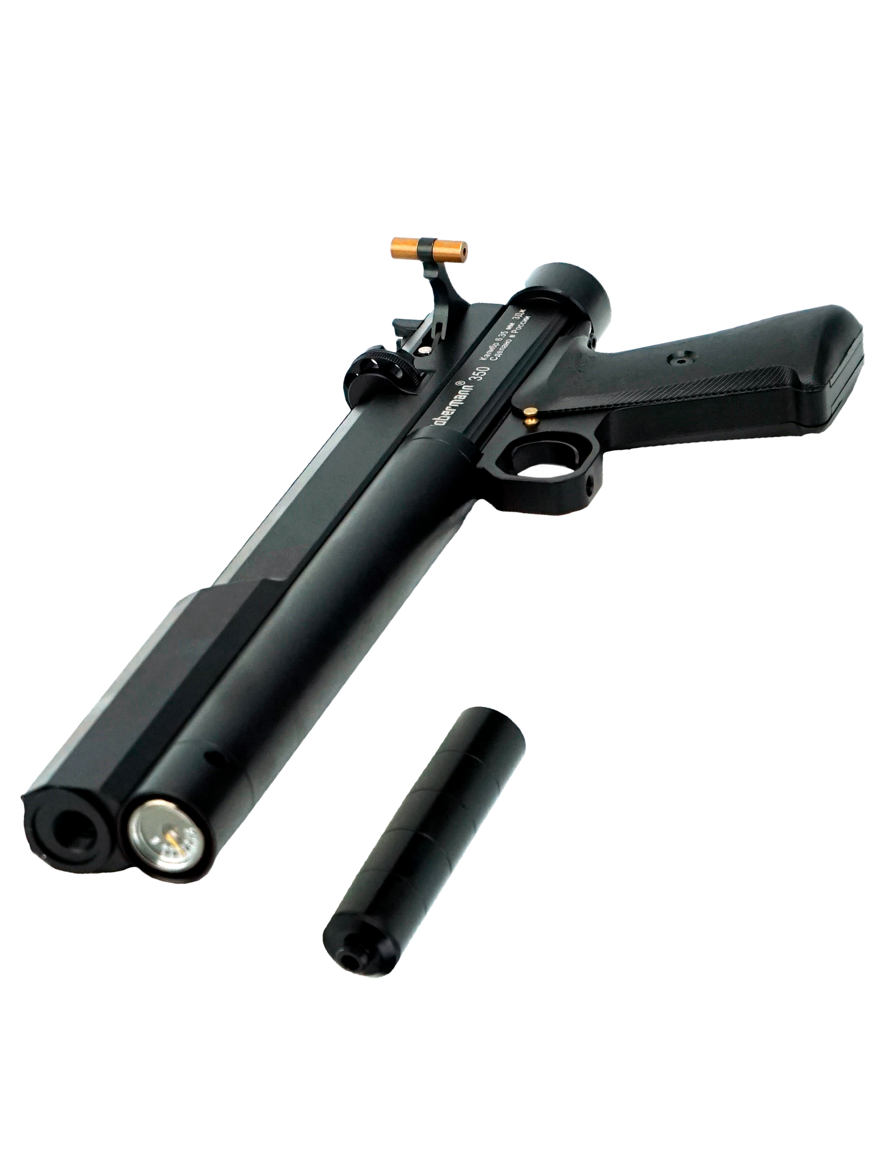 | Комплектация (?): | пистолет, барабанчик на 7 пуль, дополнительный съемный модератор (34 мм) на 5 камер, комплект РТИ, заправочный штуцер квик + резьба G 1/8, сертификат, паспорт |