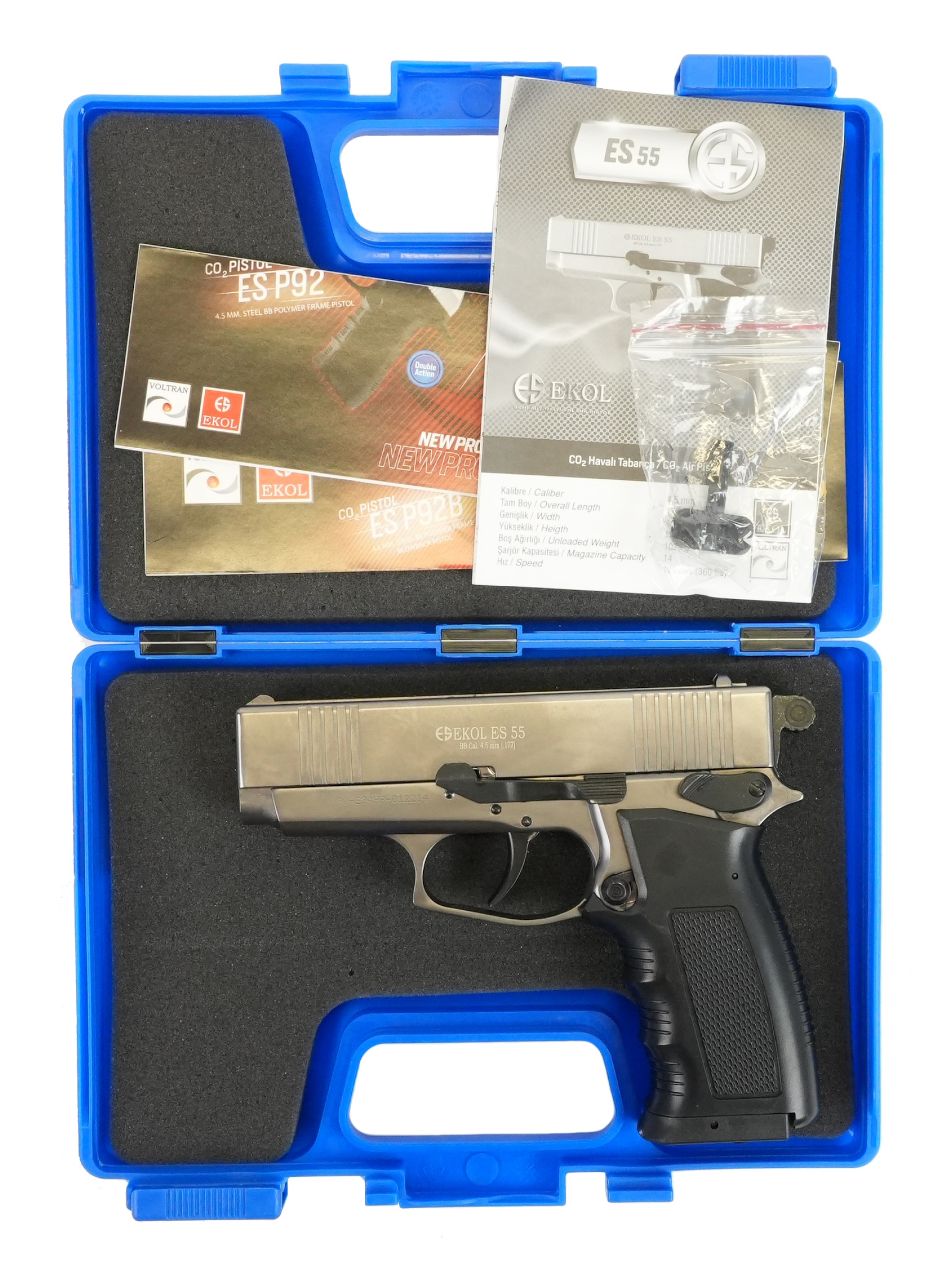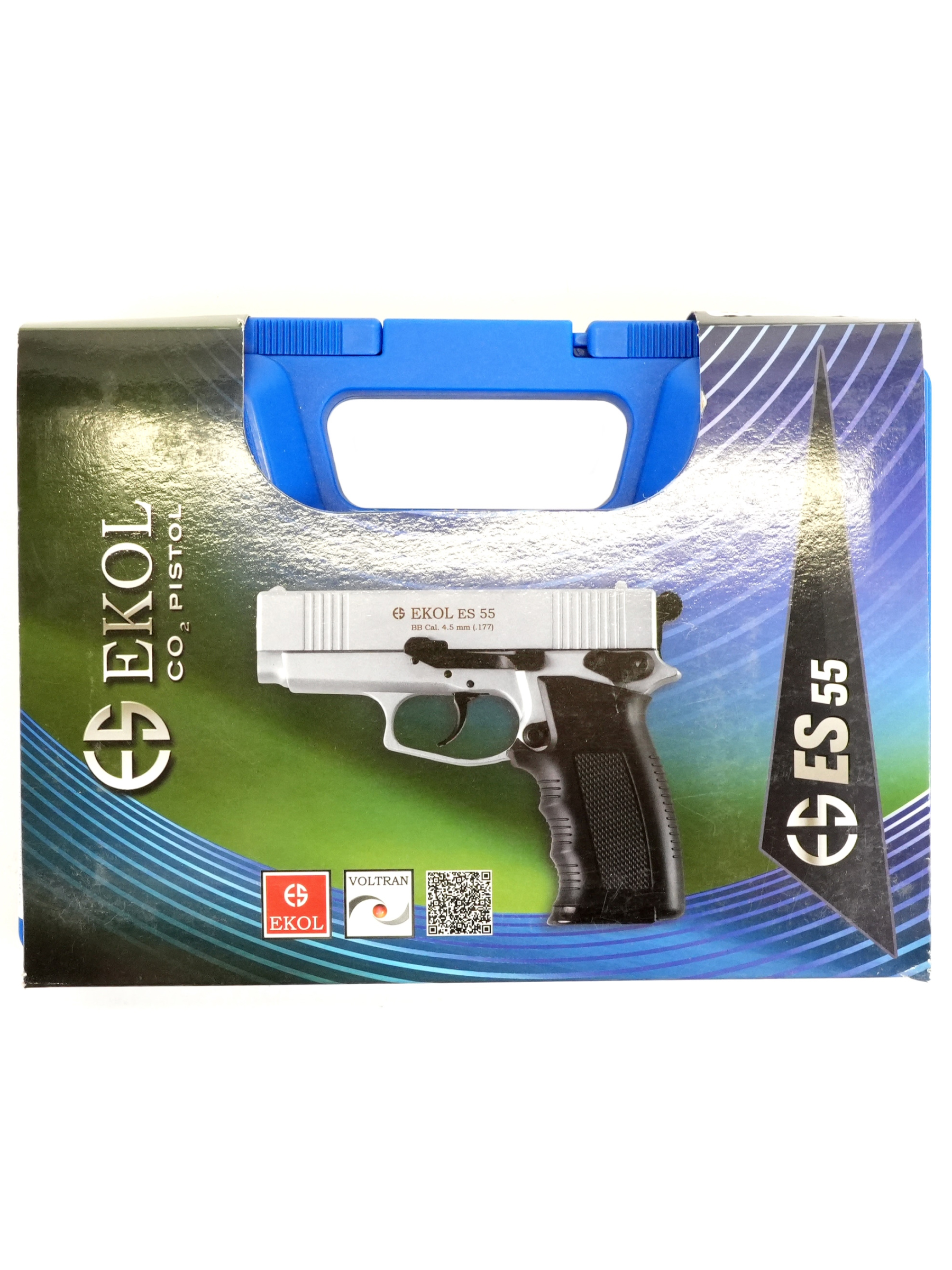 Затвор и рамка пистолета Ekol ES 55 выполнены из металла, накладки на рукоять - пластиковые. Магазин - полноразмерный, вместимостью 14 шариков, с отсеком под баллончик с углекислым газом; подаватель с фиксатором. Предохранитель отсутствует, но имеется декокер - рычаг, при помощи которого можно снять курок со взвода. Прицельные приспособления - целик и мушка без возможности регулировки.