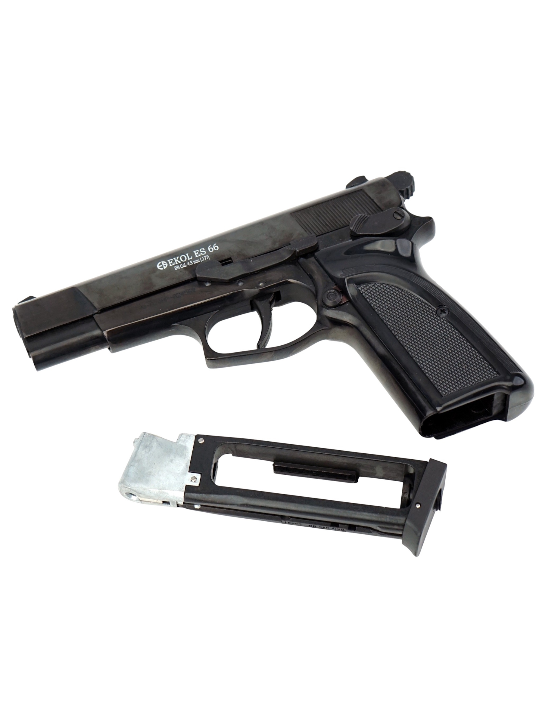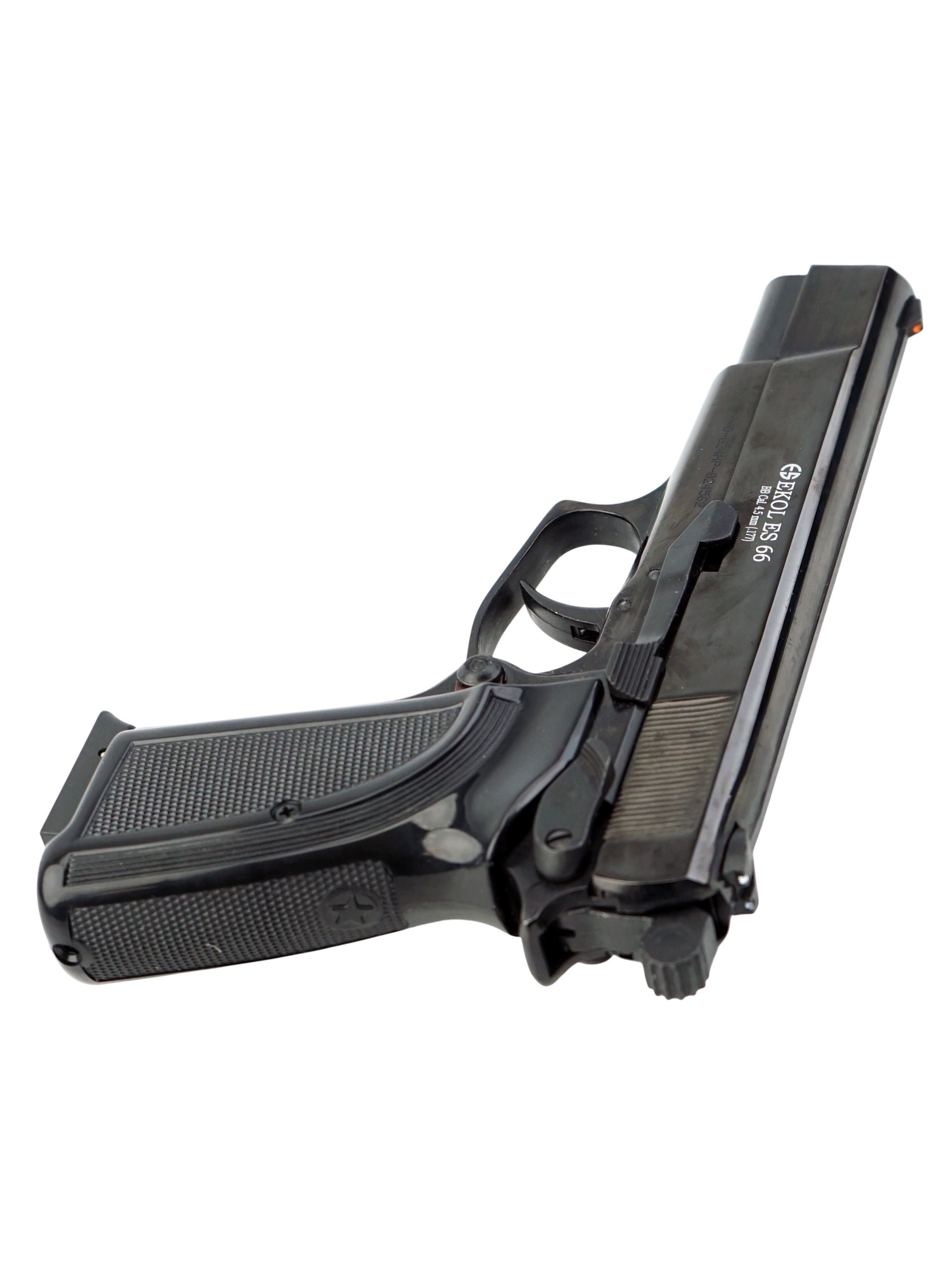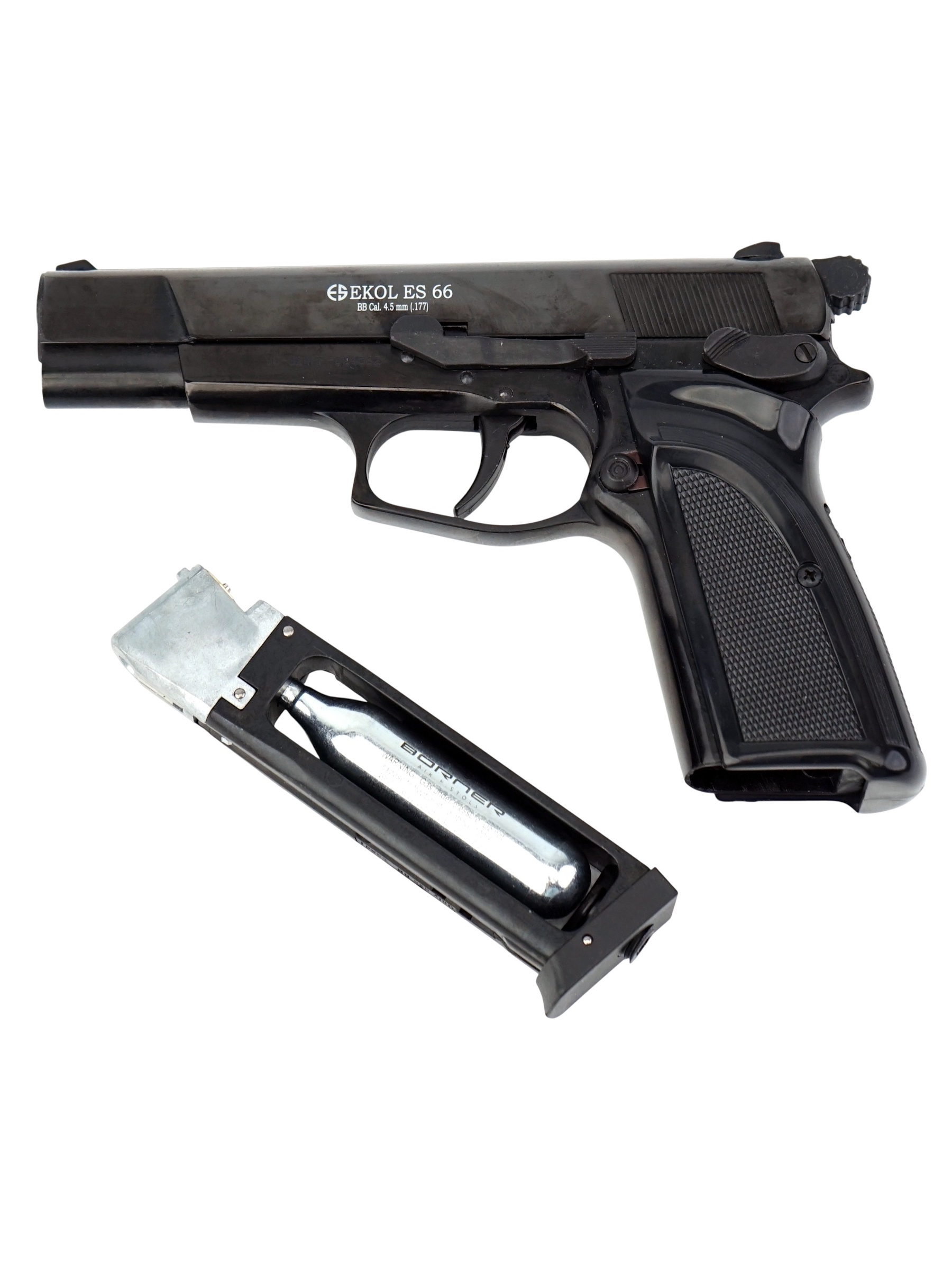 Пневматический пистолет Ekol ES 66 от турецкого производителя Ekol использует в качестве источника энергии 12-граммовые баллончики с углекислым газом.