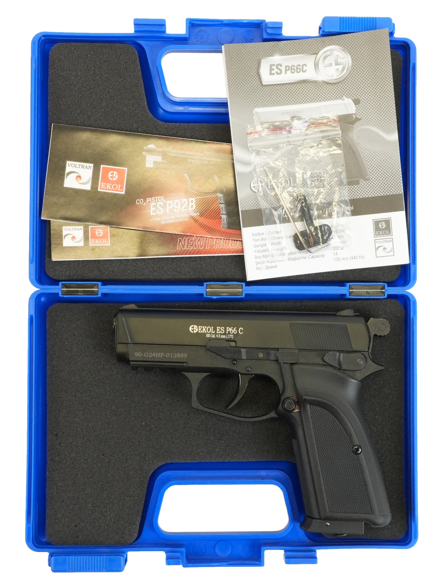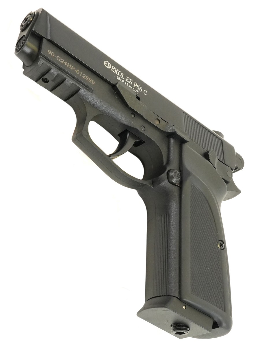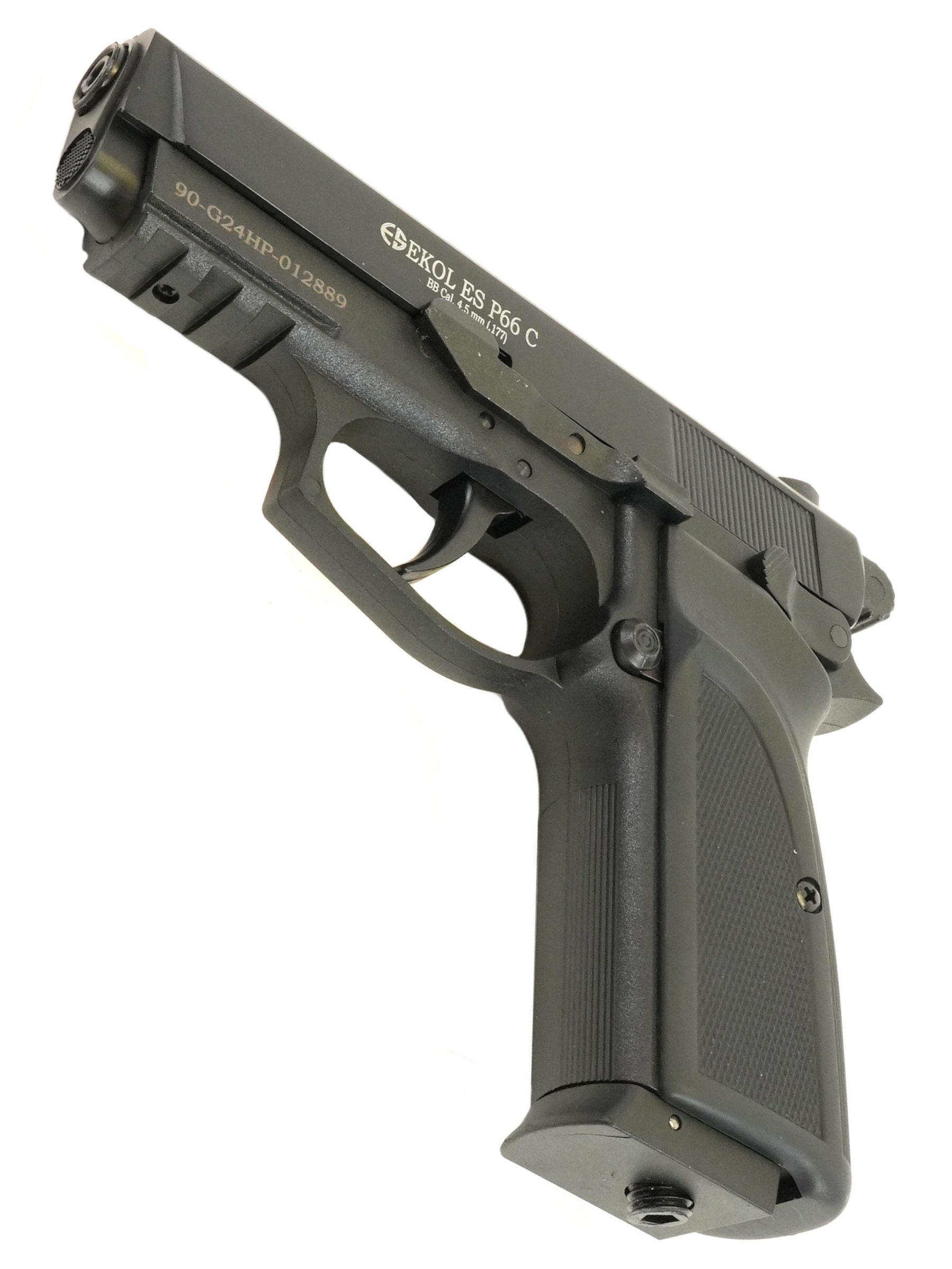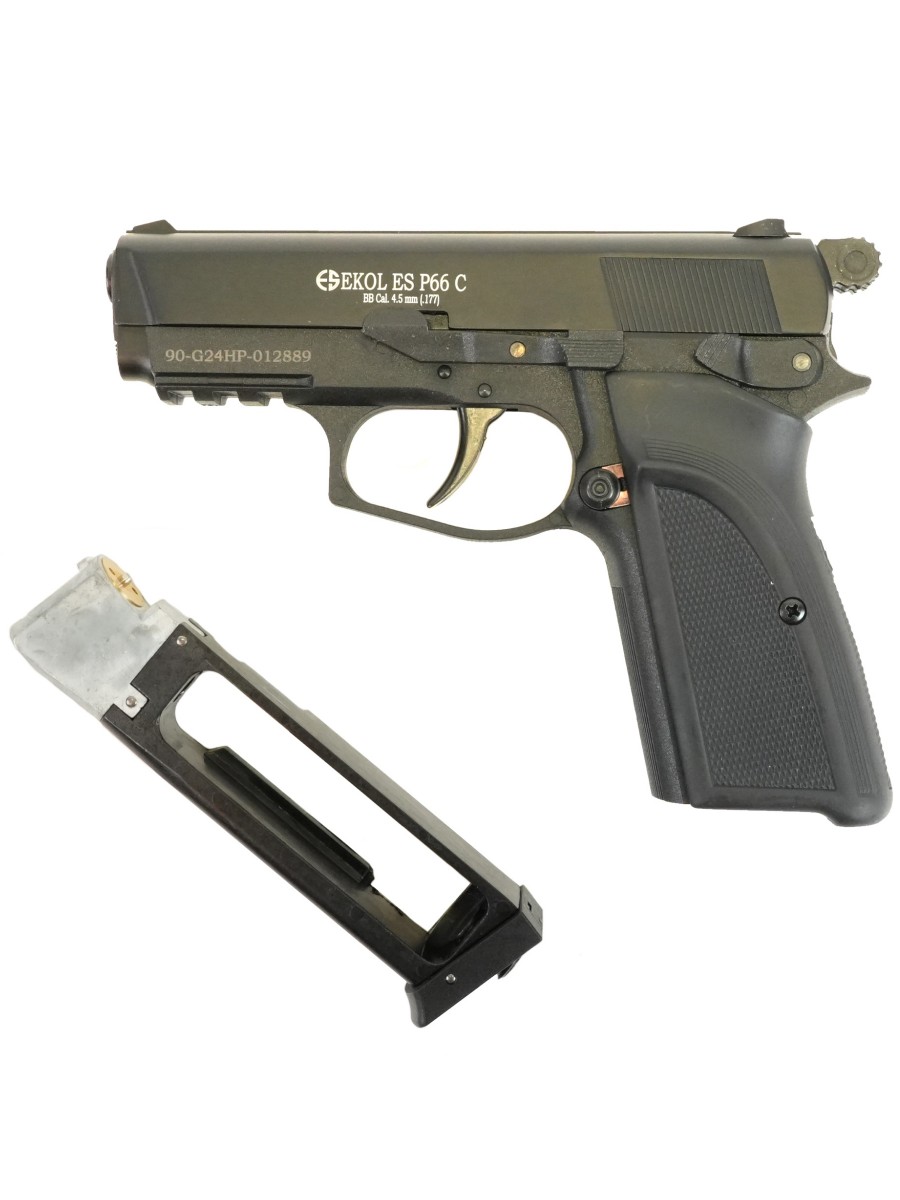Ekol ES P66 С Black обладает достойным рядом технических и стрелковых показателей. Магазин пистолета вмещает в себя 14 шариков BBs калибра 4,5 мм. Для стрельбы необходимо использовать только шарики BBs. Система BlowBack на данной модели пневматического пистолета не предусмотрена. Отсутствие системы имитации отдачи Blowback снижает количество расходуемого газа в баллончике СО2 и позволит осуществить на 30-40% больше выстрелов.