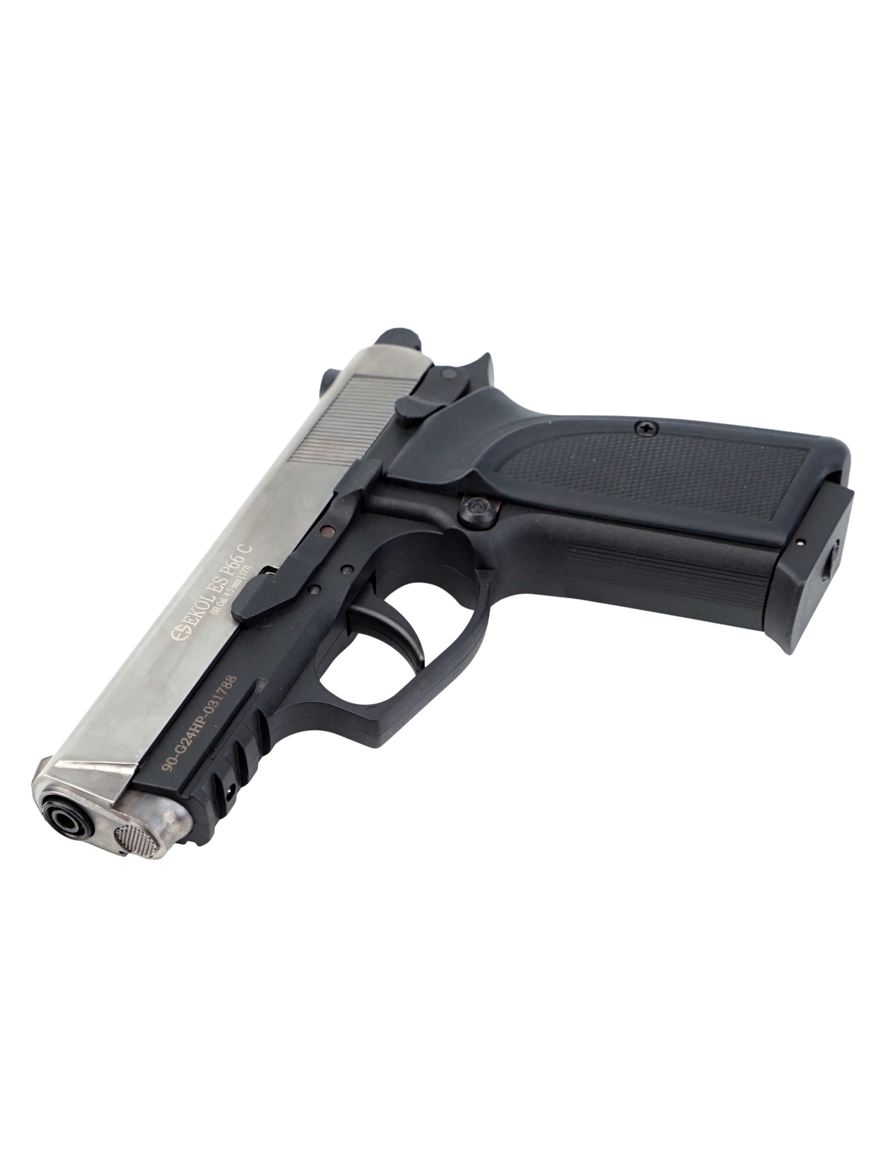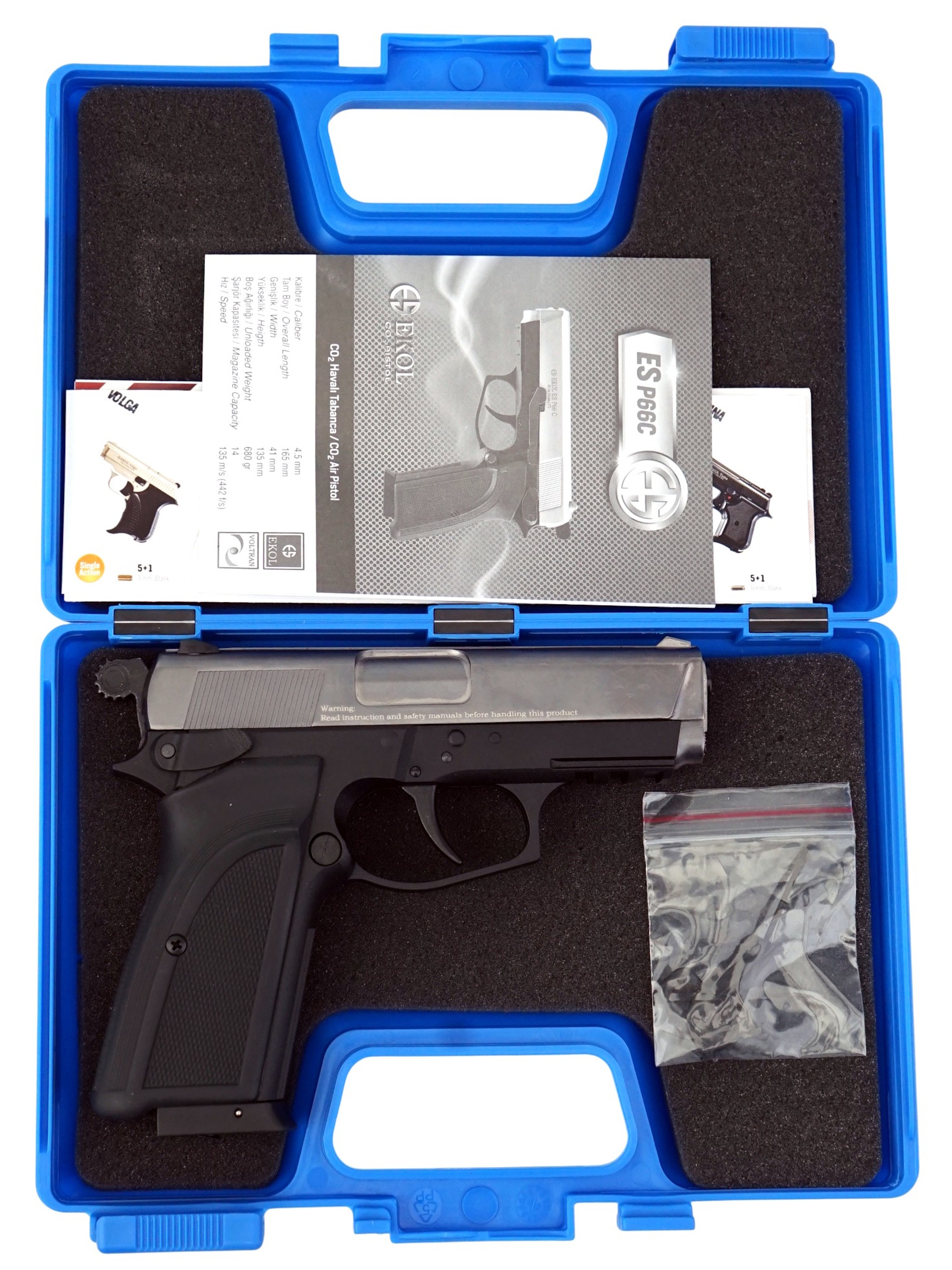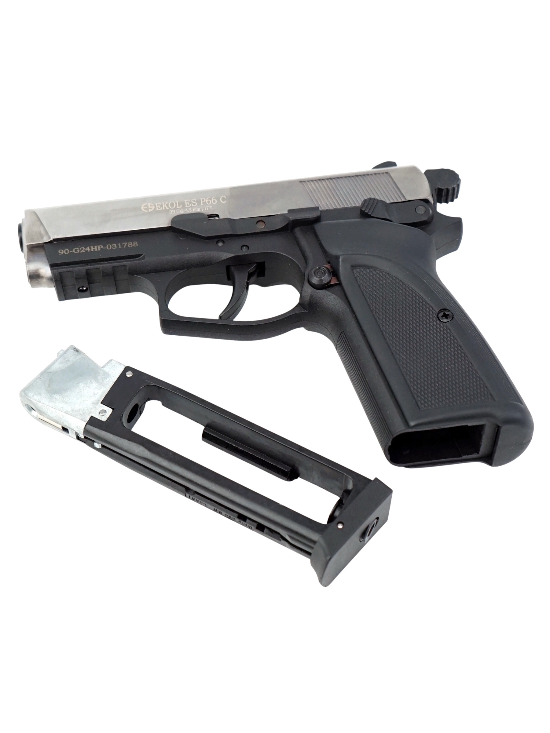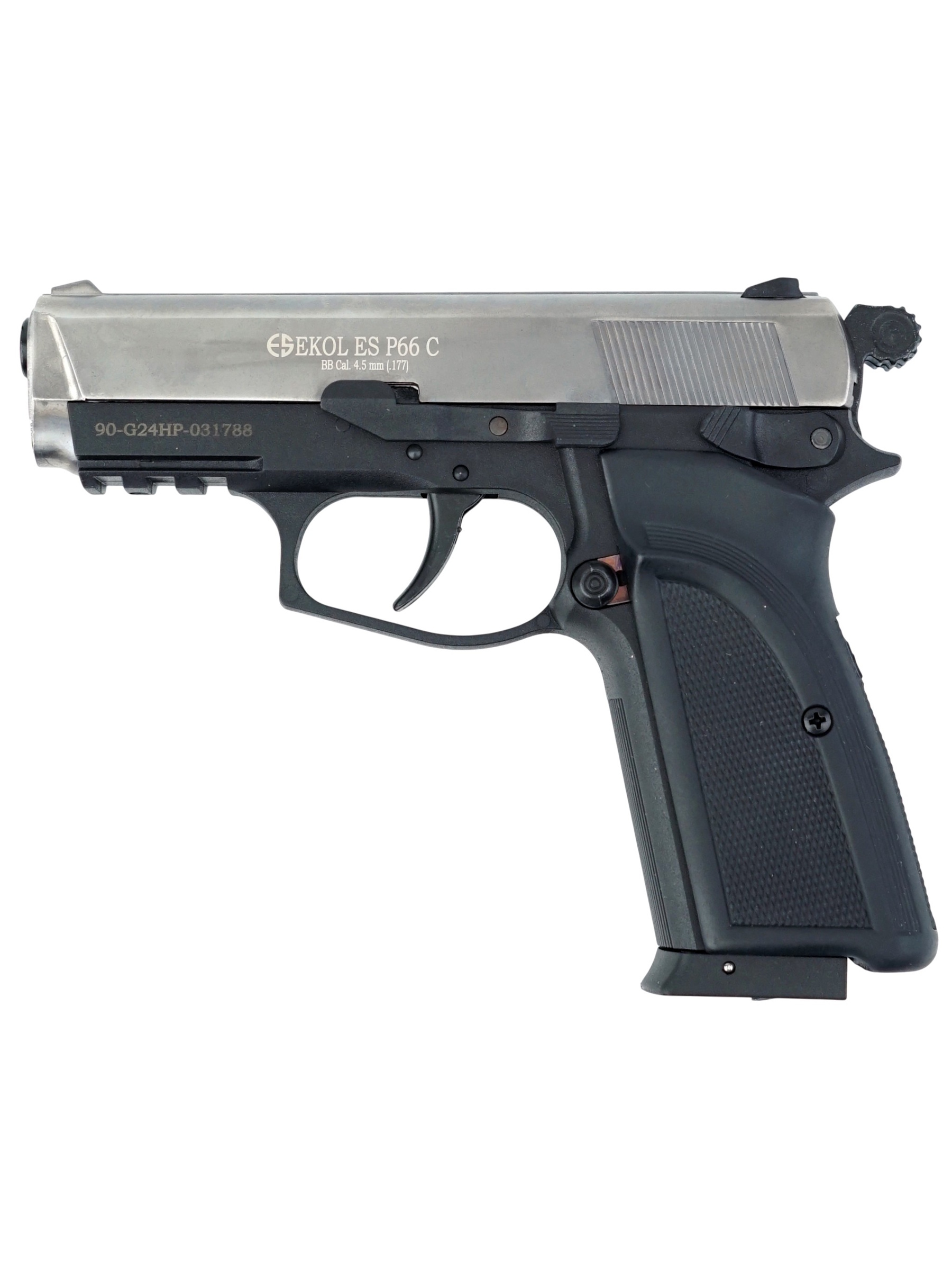Ekol ES P66 С Black обладает достойным рядом технических и стрелковых показателей. Магазин пистолета вмещает в себя 14 шариков BBs калибра 4,5 мм. Для стрельбы необходимо использовать только шарики BBs. Система BlowBack на данной модели пневматического пистолета не предусмотрена. Отсутствие системы имитации отдачи Blowback снижает количество расходуемого газа в баллончике СО2 и позволит осуществить на 30-40% больше выстрелов.