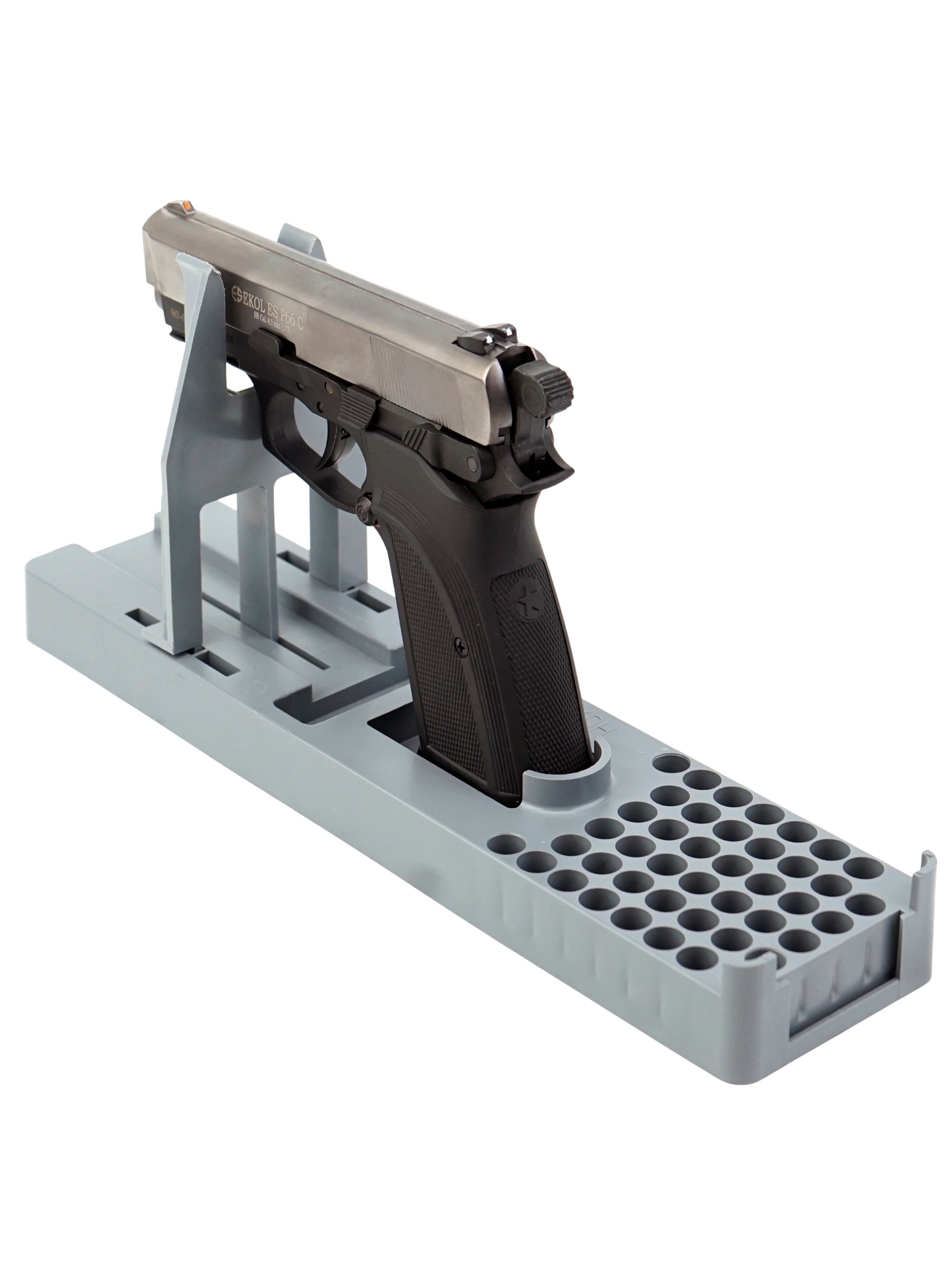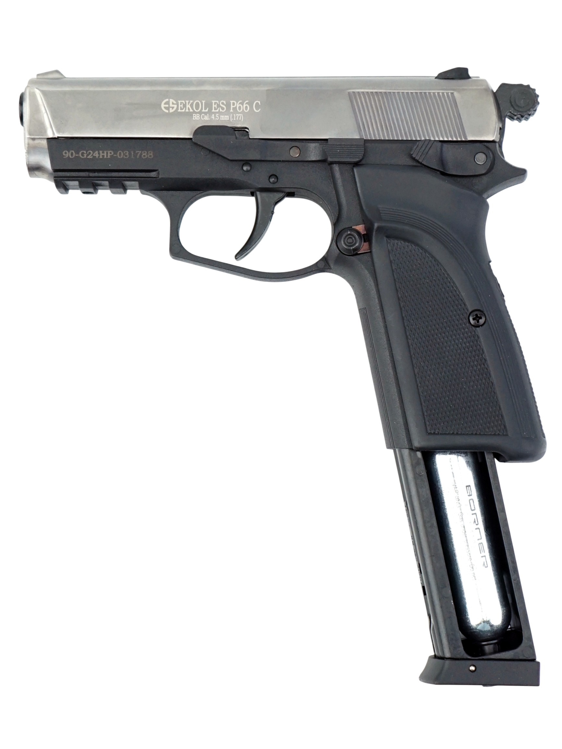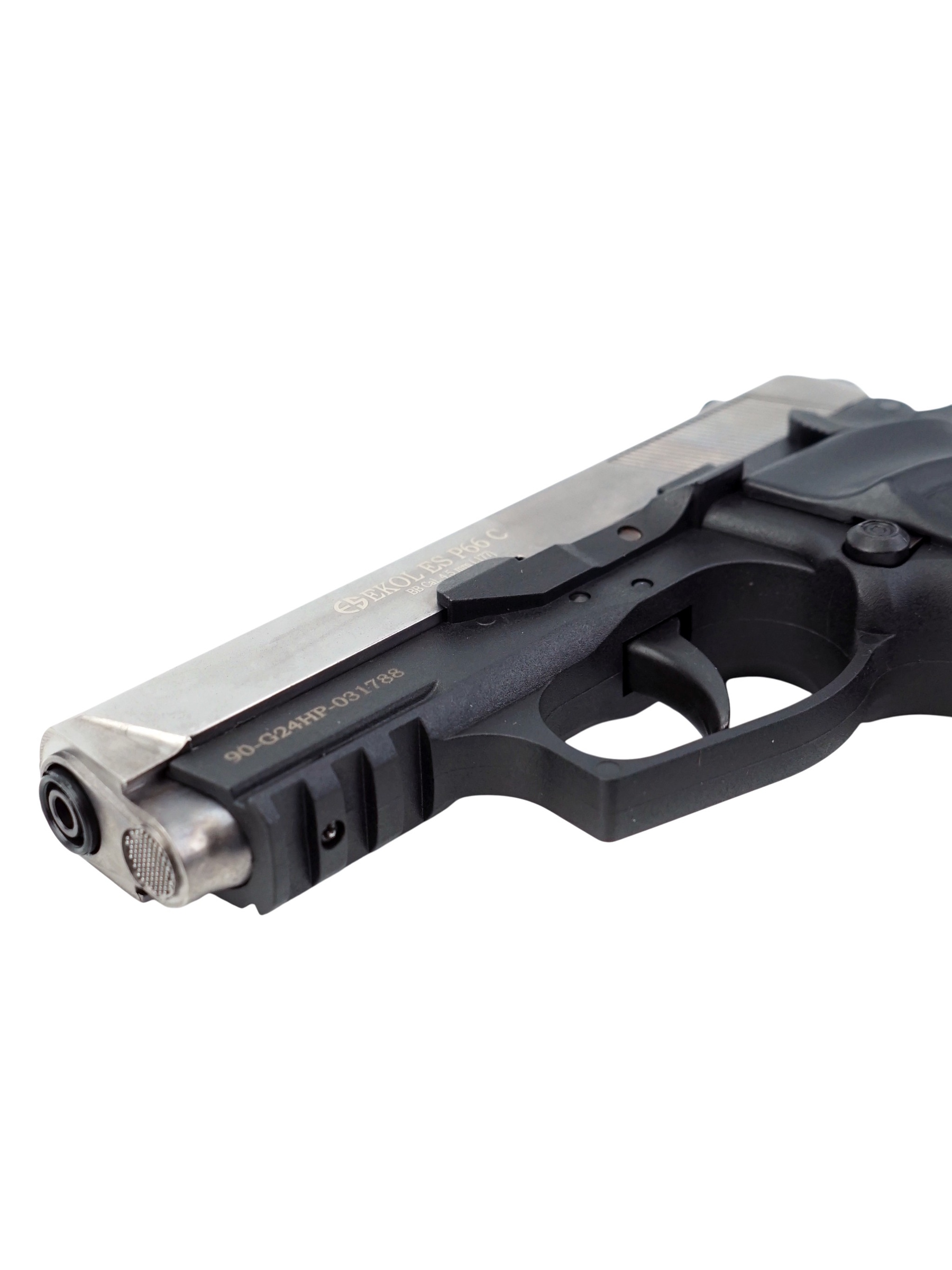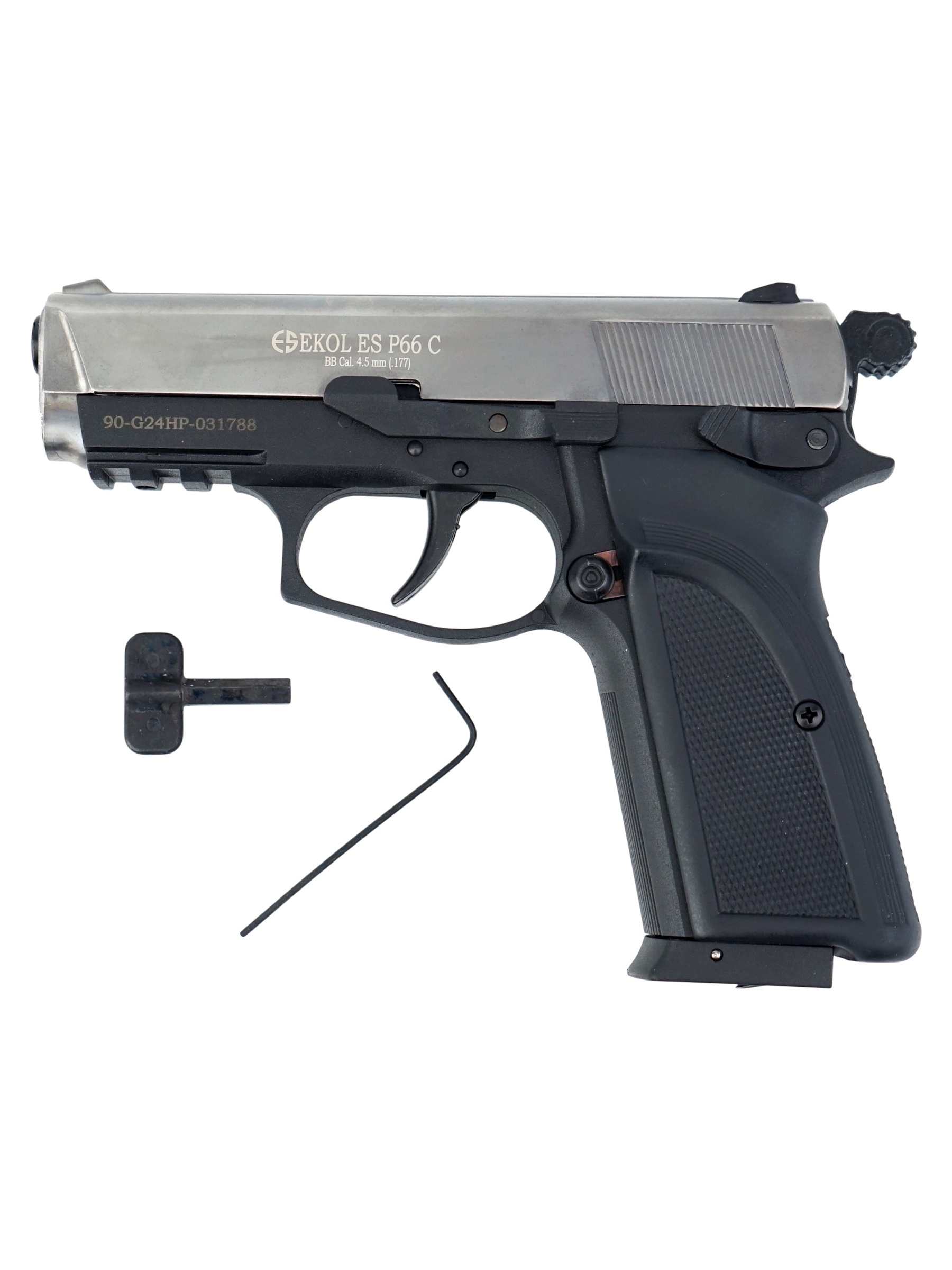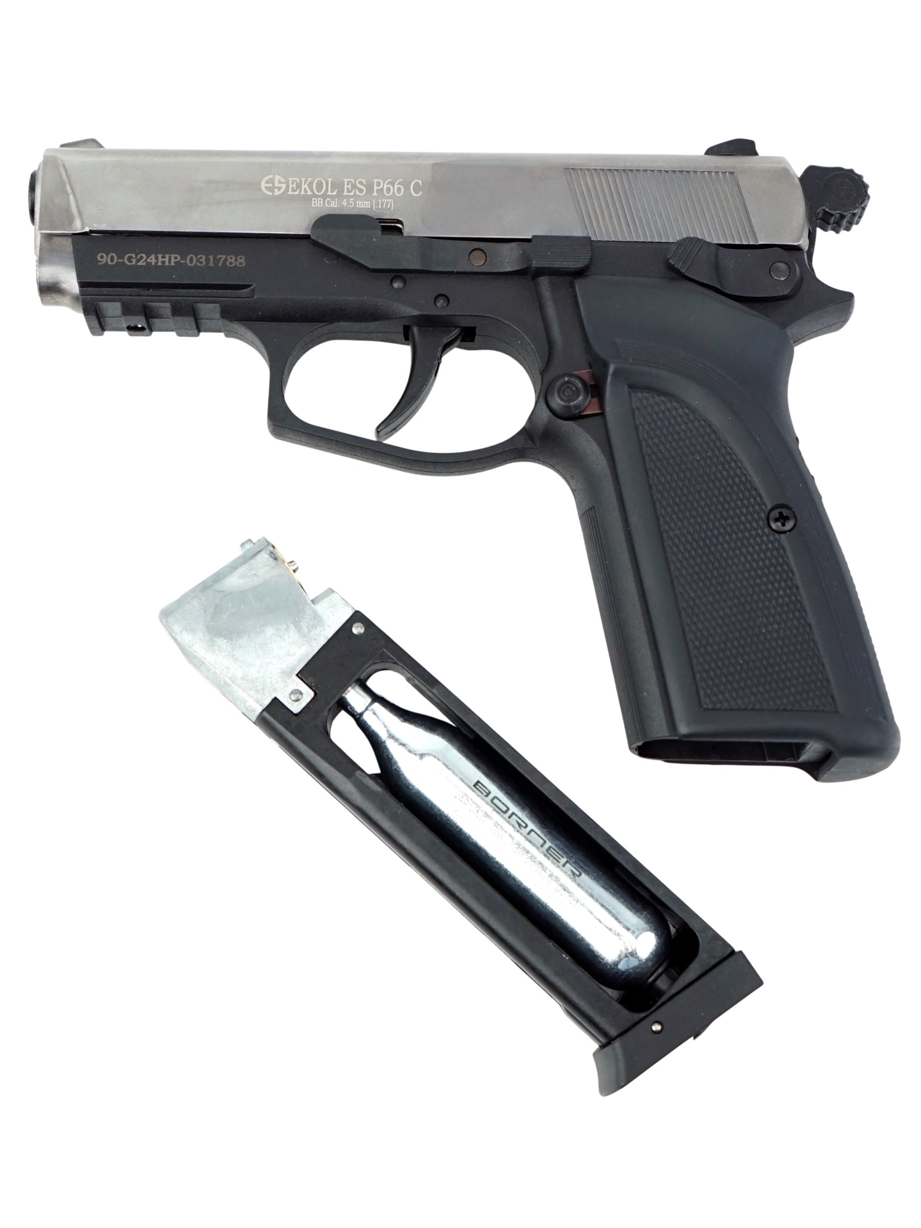 Ekol ES P66 С Black обладает достойным рядом технических и стрелковых показателей. Магазин пистолета вмещает в себя 14 шариков BBs калибра 4,5 мм. Для стрельбы необходимо использовать только шарики BBs. Система BlowBack на данной модели пневматического пистолета не предусмотрена. Отсутствие системы имитации отдачи Blowback снижает количество расходуемого газа в баллончике СО2 и позволит осуществить на 30-40% больше выстрелов.