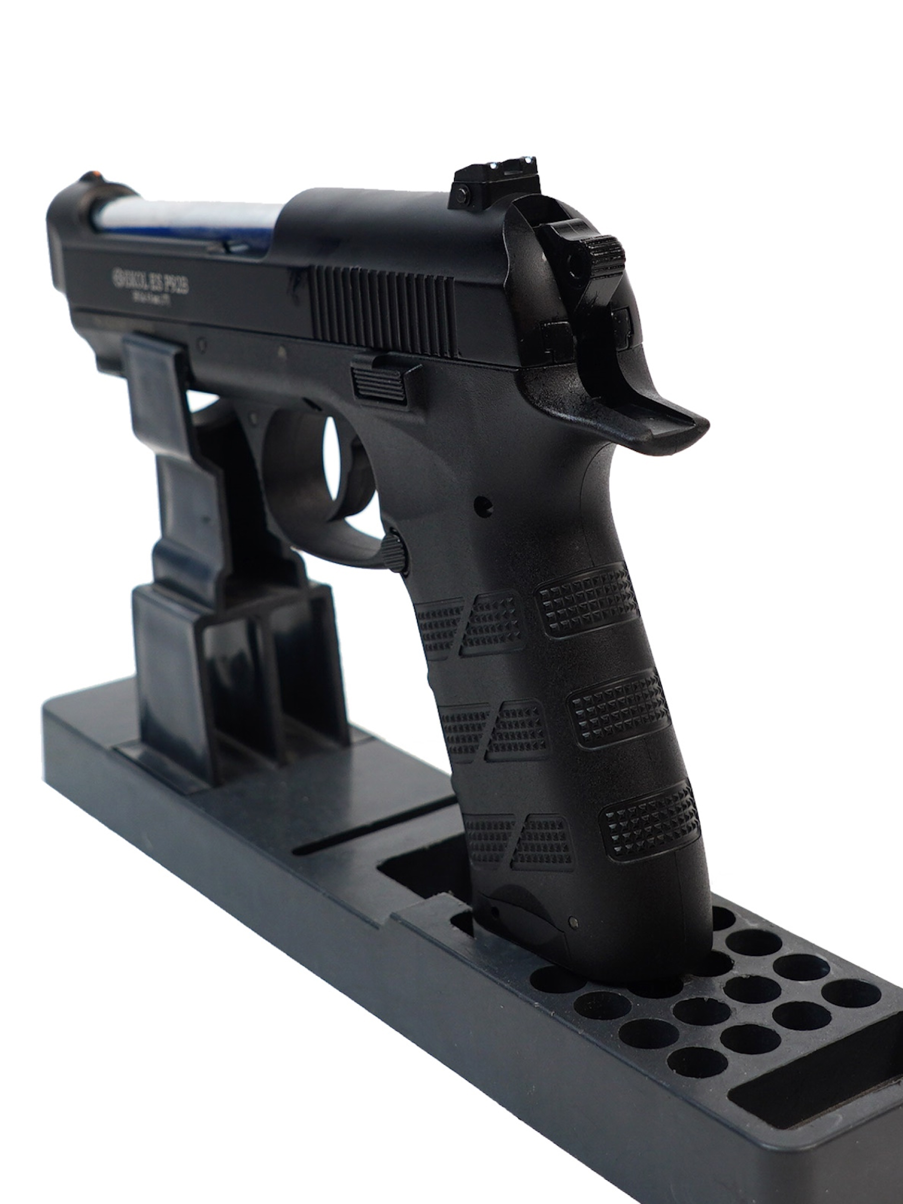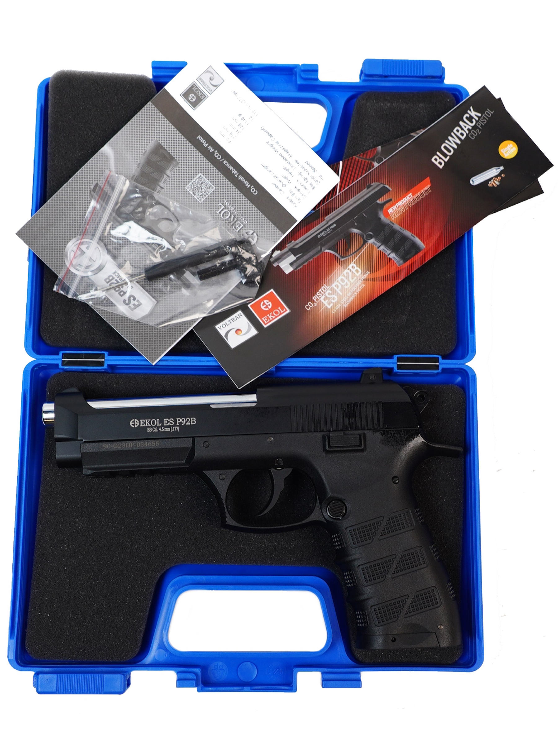 Ekol ES P92 B Black обладает достойным рядом технических и стрелковых показателей. Магазин пистолета вмещает в себя 14 шариков BBs калибра 4,5 мм. Для стрельбы необходимо использовать только шарики BBs. Система BlowBack на данной модели пневматического пистолета предусмотрена.