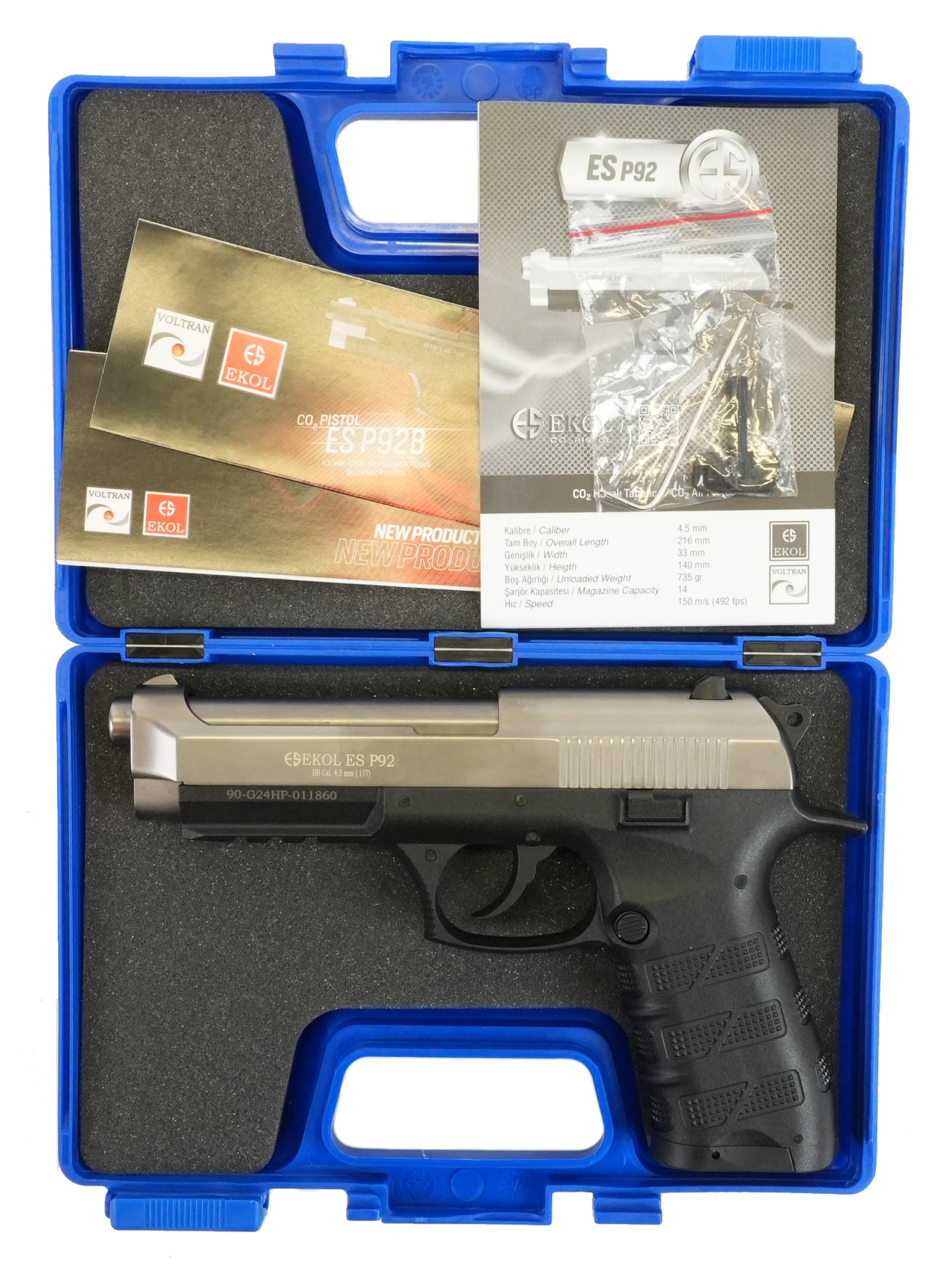 Ekol ES P92 Black обладает достойным рядом технических и стрелковых показателей. Магазин пистолета вмещает в себя 14 шариков BBs калибра 4,5 мм. Для стрельбы необходимо использовать только шарики BBs. Система BlowBack на данной модели пневматического пистолета не предусмотрена. Отсутствие системы имитации отдачи Blowback снижает количество расходуемого газа в баллончике СО2 и позволит осуществить на 30-40% больше выстрелов.