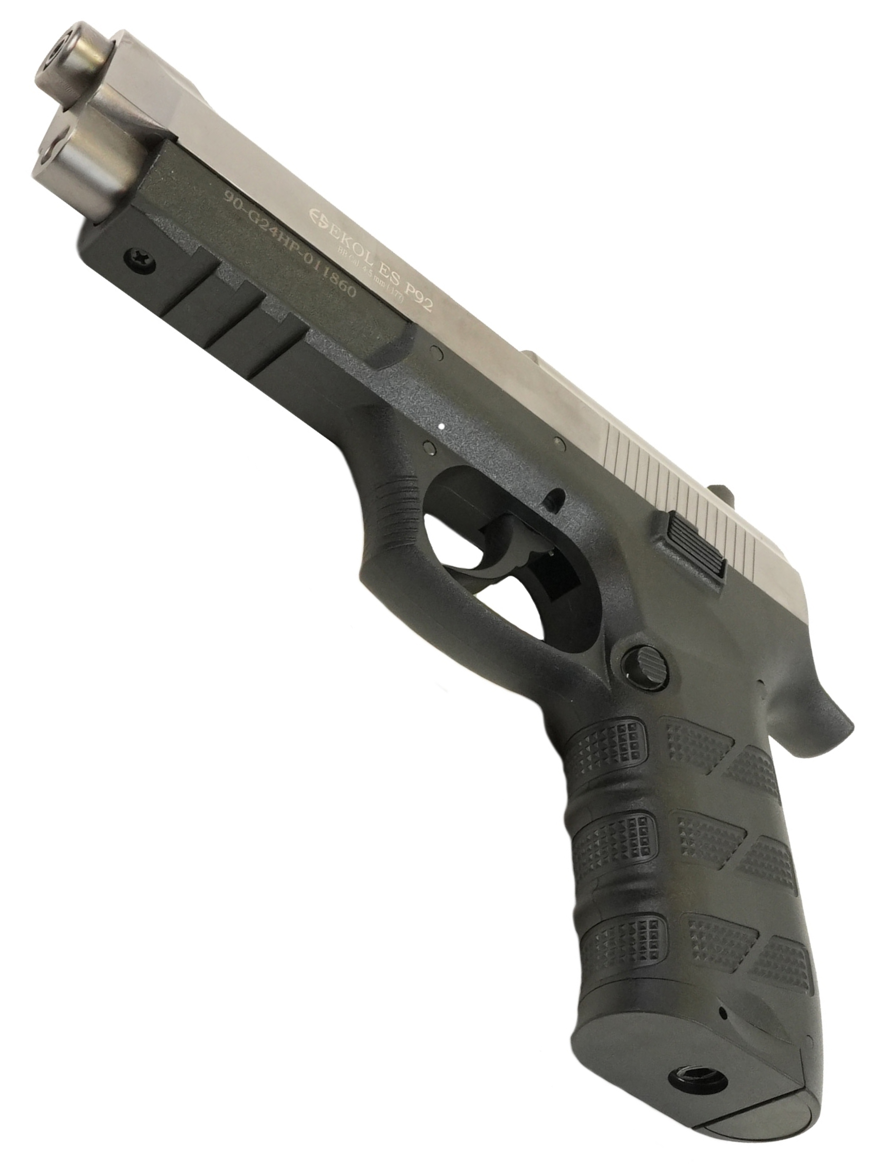 Корпус пневматического пистолета Ekol ES P92 Black изготовлен из металла. Эргономичная рифленая рукоятка позволяет комфортно удерживать пистолет во время стрельбы. Прицельные приспособления - целик и мушка. Для безопасности на модели предусмотрен двухпозиционный предохранитель. Также стоит отметить, что пистолет оснащен планкой Пикатинни, которая позволяет установить вспомогательные аксессуары.