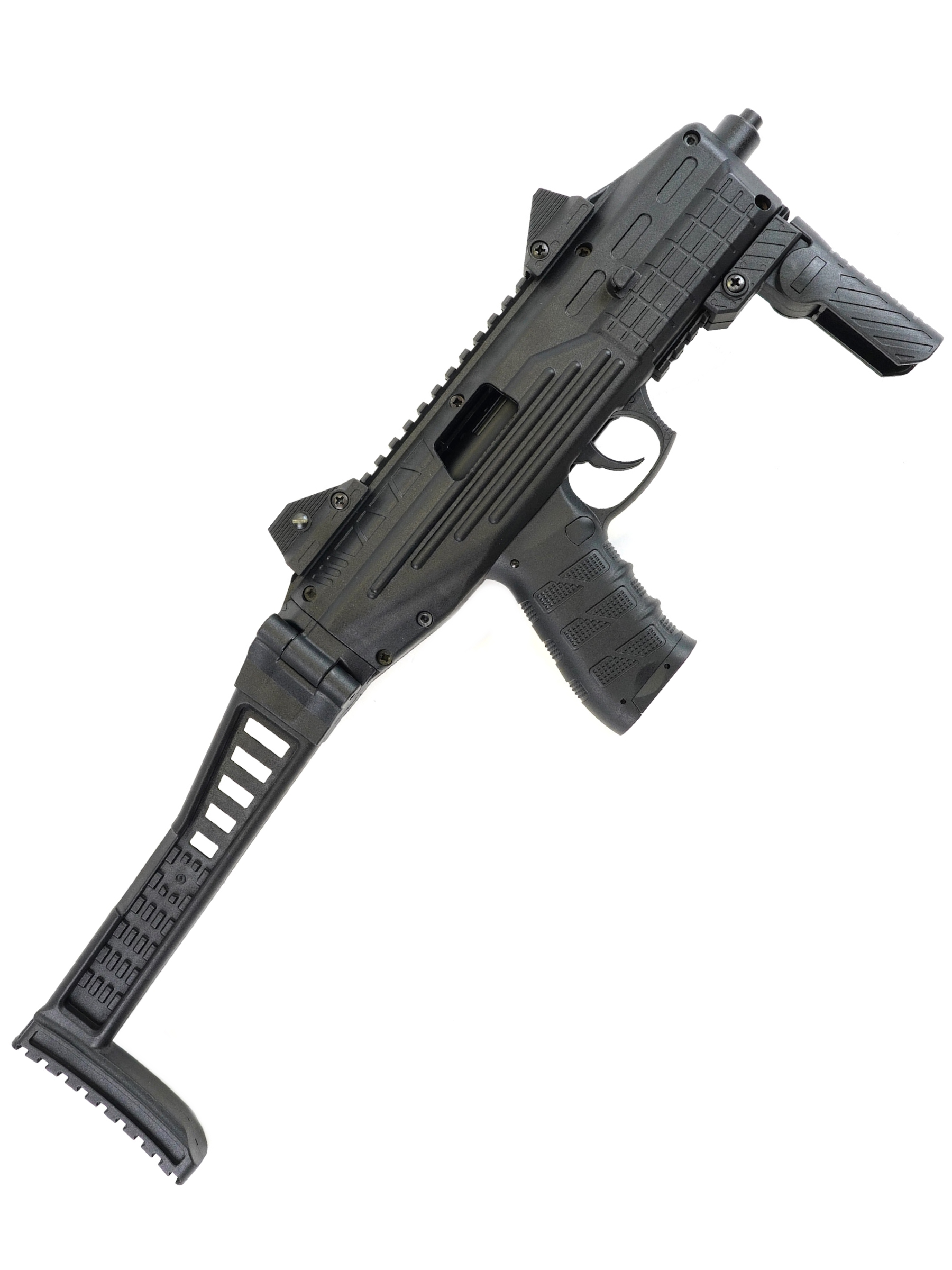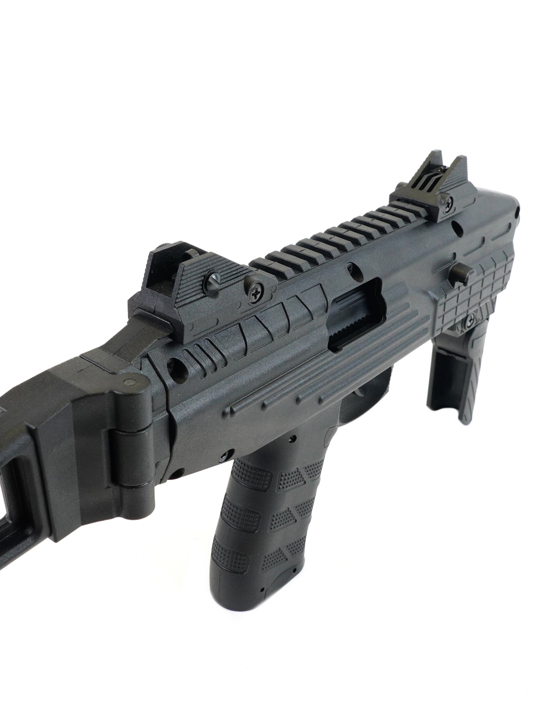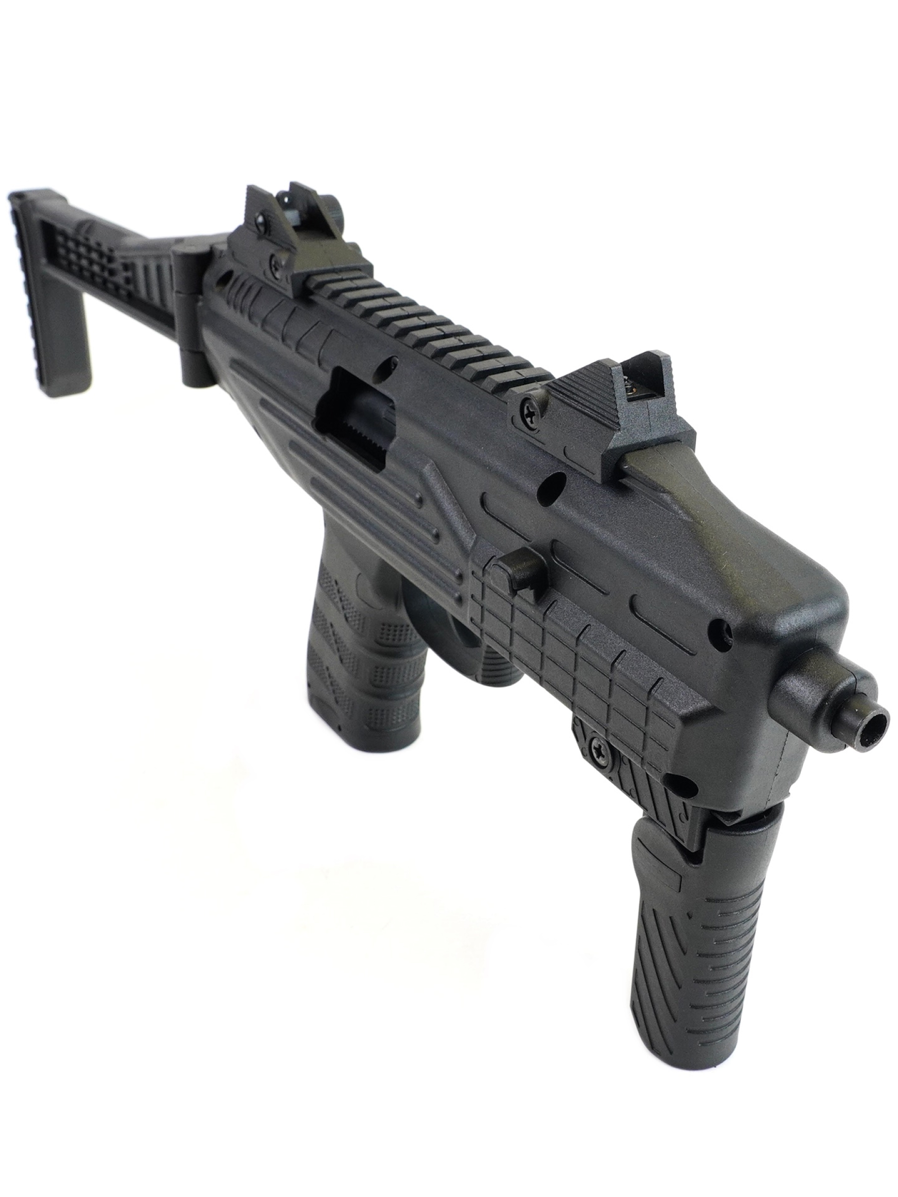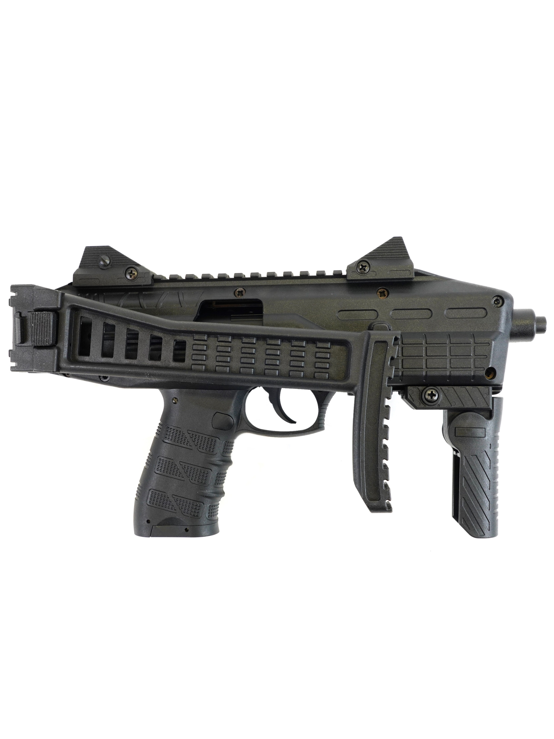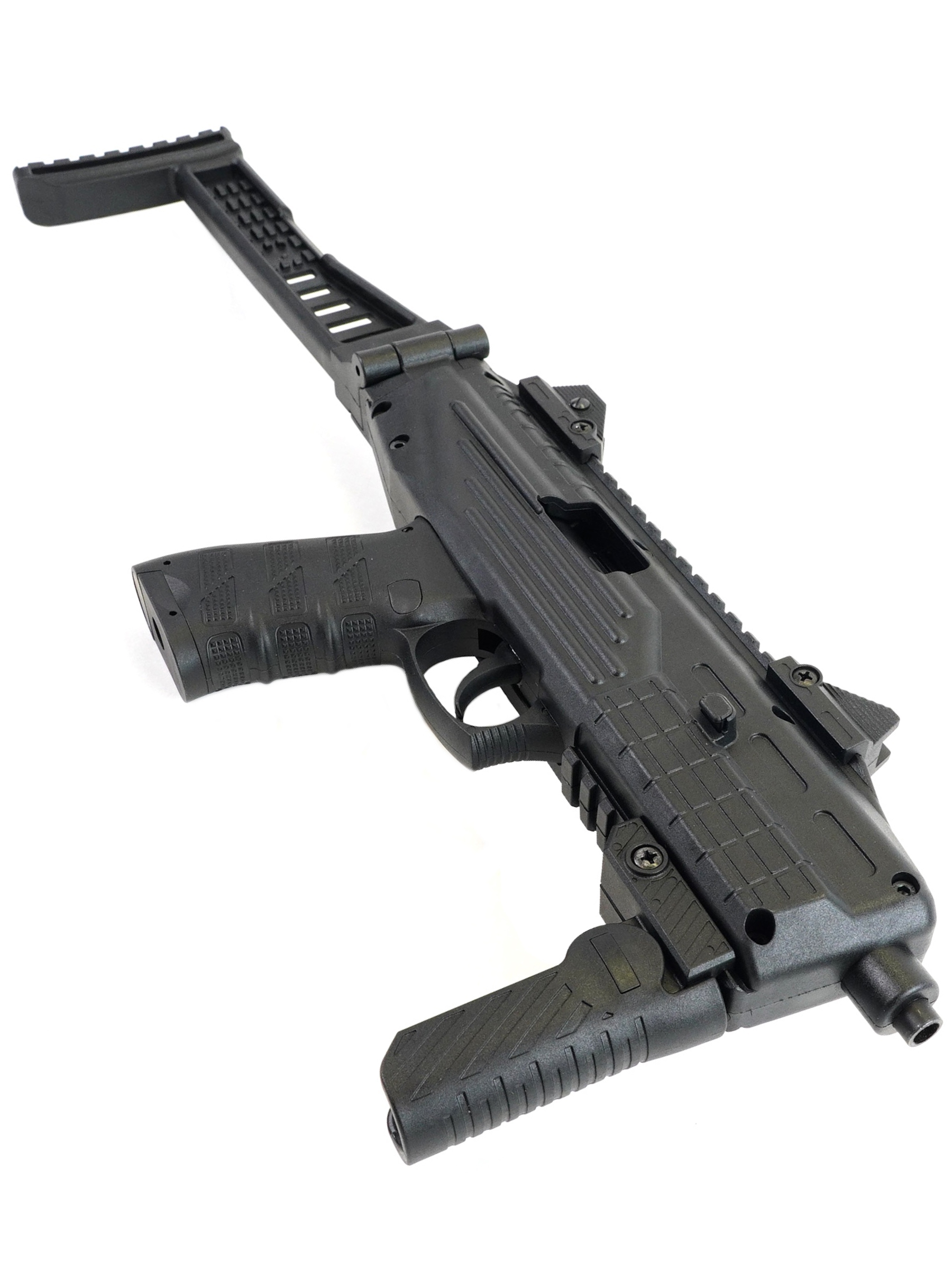 Подствольная планка Пикатинни позволяет устанавливать различные аксессуары, такие как ЛЦУ или фонарик. Кроме того, она штатно оборудована складной тактической рукояткой. Пластиковый приклад пистолета складывается вправо. Полноразмерный магазин вмещает до 14 шариков и имеет специальный отсек для баллончика с углекислым газом.