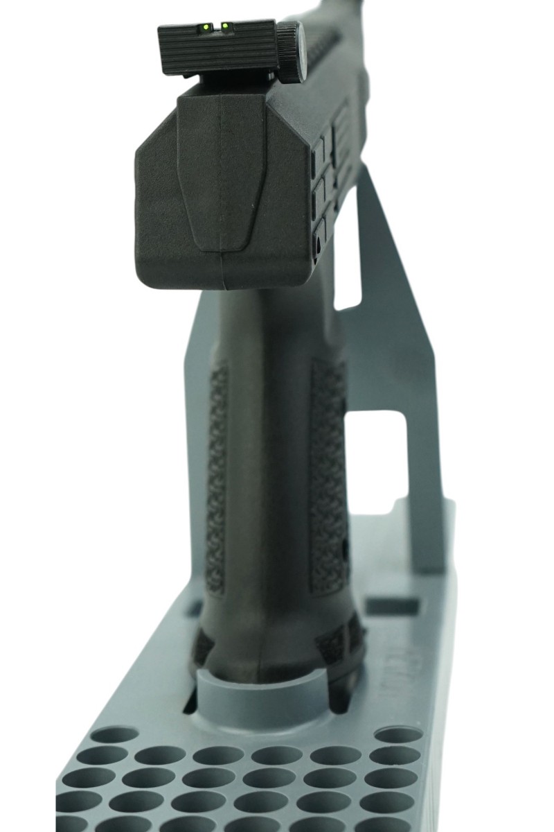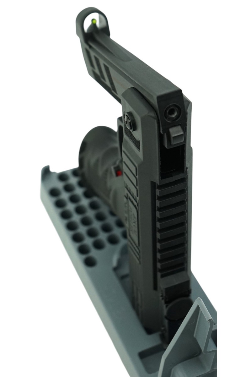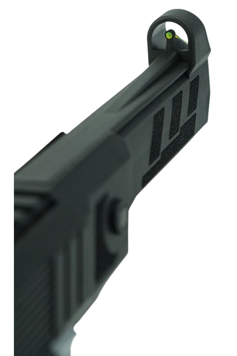 Прицельные приспособления включают регулируемый целик (по вертикали и горизонтали) и мушку с фибероптическим элементом, защищенную кожухом. Для установки оптического или коллиматорного прицела предусмотрена планка Пикатинни. Корпус пистолета выполнен из прочного пластика, а для предотвращения случайного выстрела имеется предохранитель.