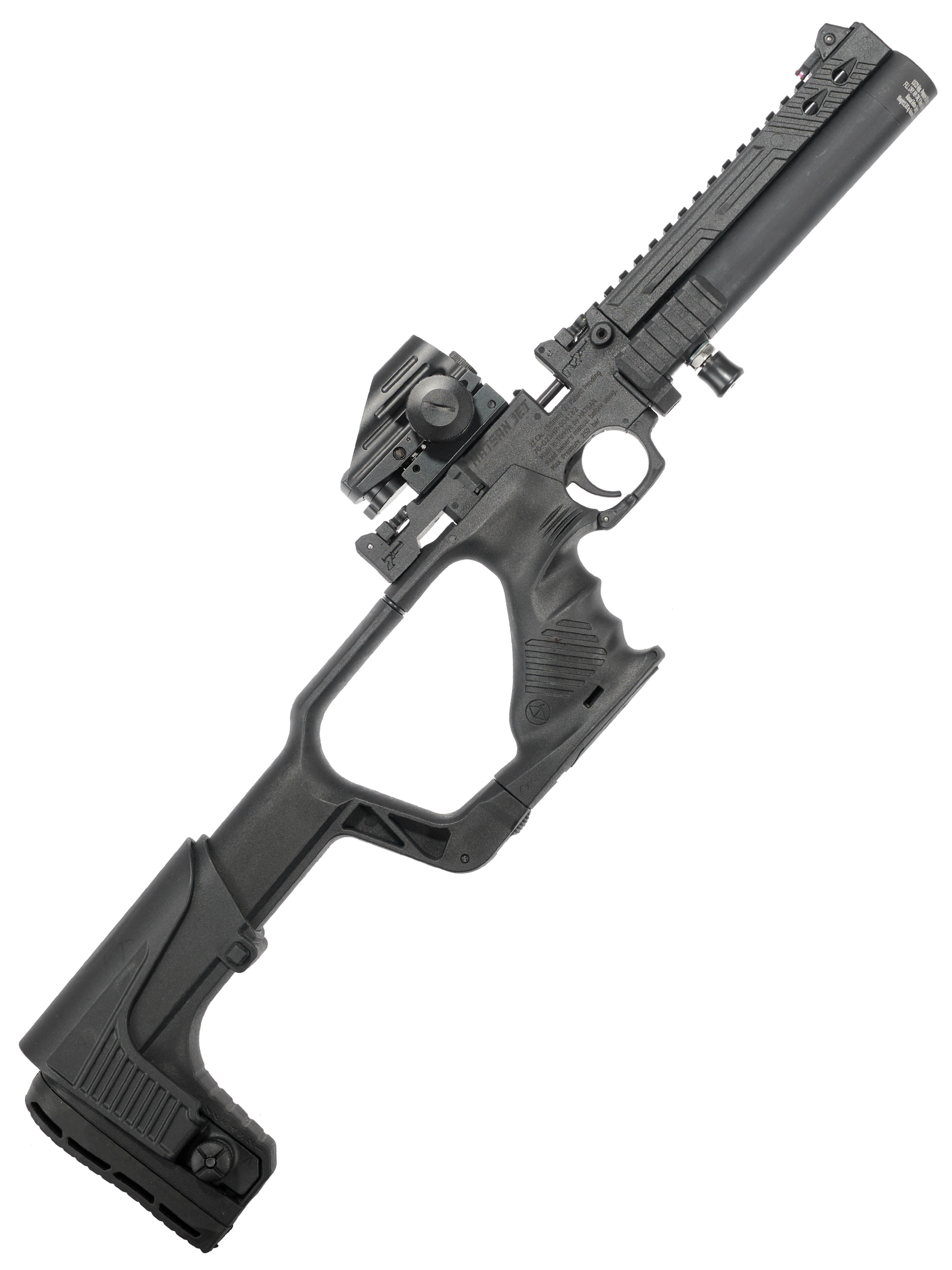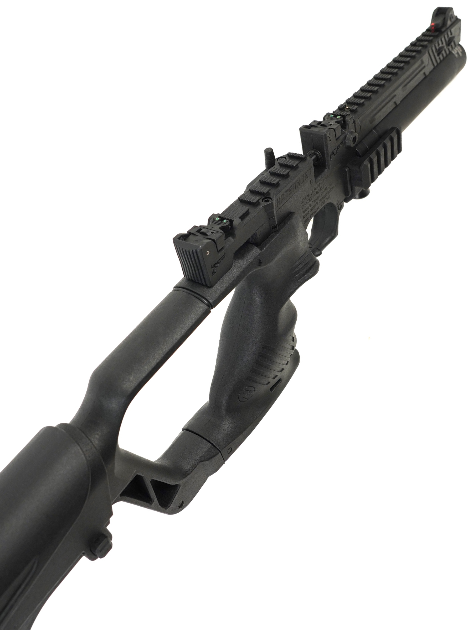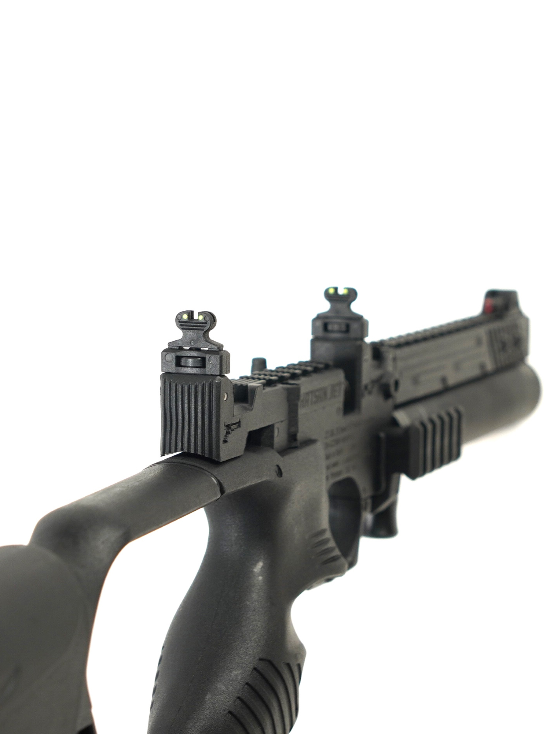 Преобразование на этом не завершается - для перенастройки оружия под нужды конкретного пользователя предусмотрены изменения длины и высоты приклада. Кроме того, модель Jet1 оснащена сразу тремя механическими прицелами, которые можно раскладывать в зависимости от выбранной пользователем модификации для стрельбы. Для установки дополнительных обвесов в конструкции пистолета предусмотрены две универсальные планки крепления типа Пикатинни, расположенные по бокам корпуса.