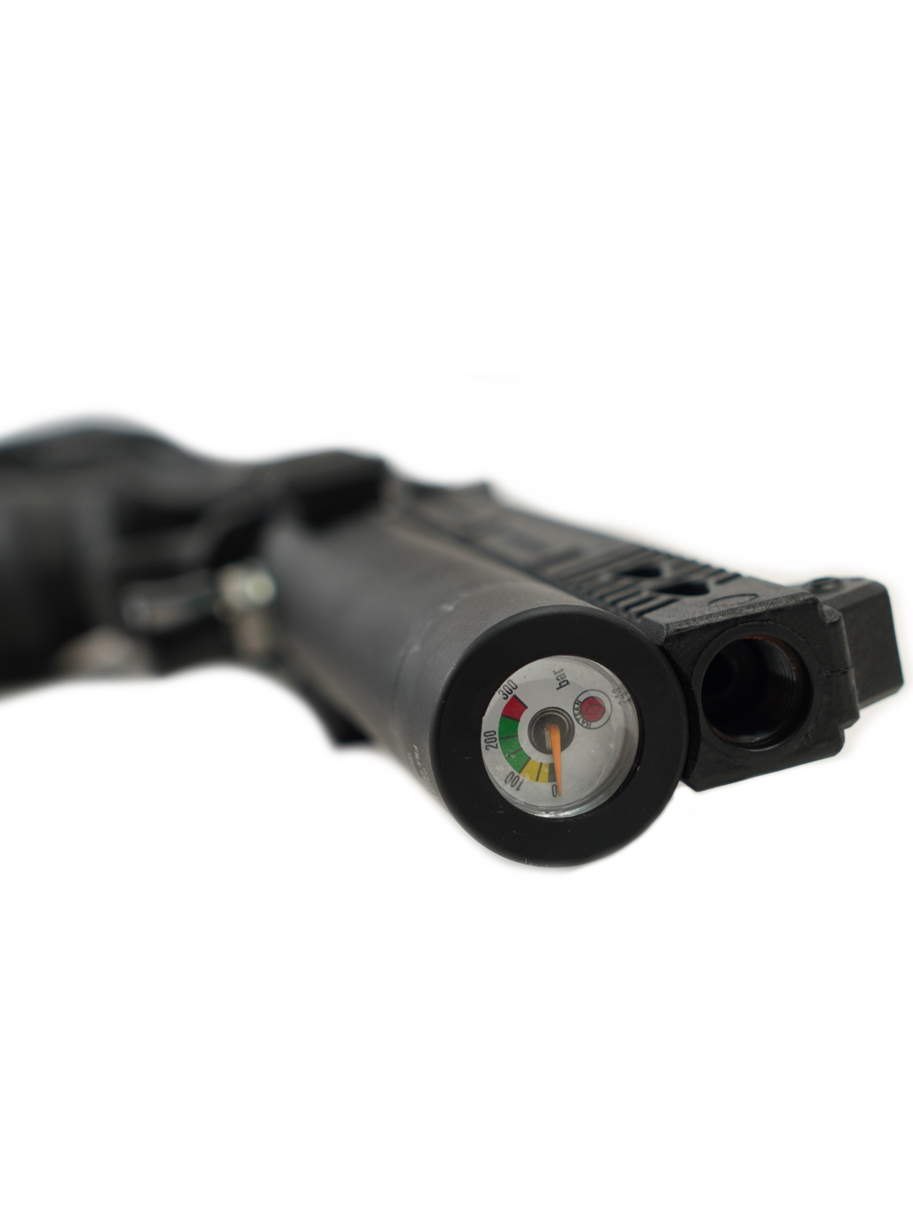 Для стрельбы использован базовый принцип, на котором работает PCP пневматика Hatsan - пуля выталкивается из ствола энергией сжатого воздуха. Во время подготовки оружия к стрельбе нужно создать в резервуаре емкостью 40 куб. см необходимое давление - до 210 Бар максимум. Контролировать степень сжатия воздуха можно с помощью вмонтированного в торец резервуара манометра.