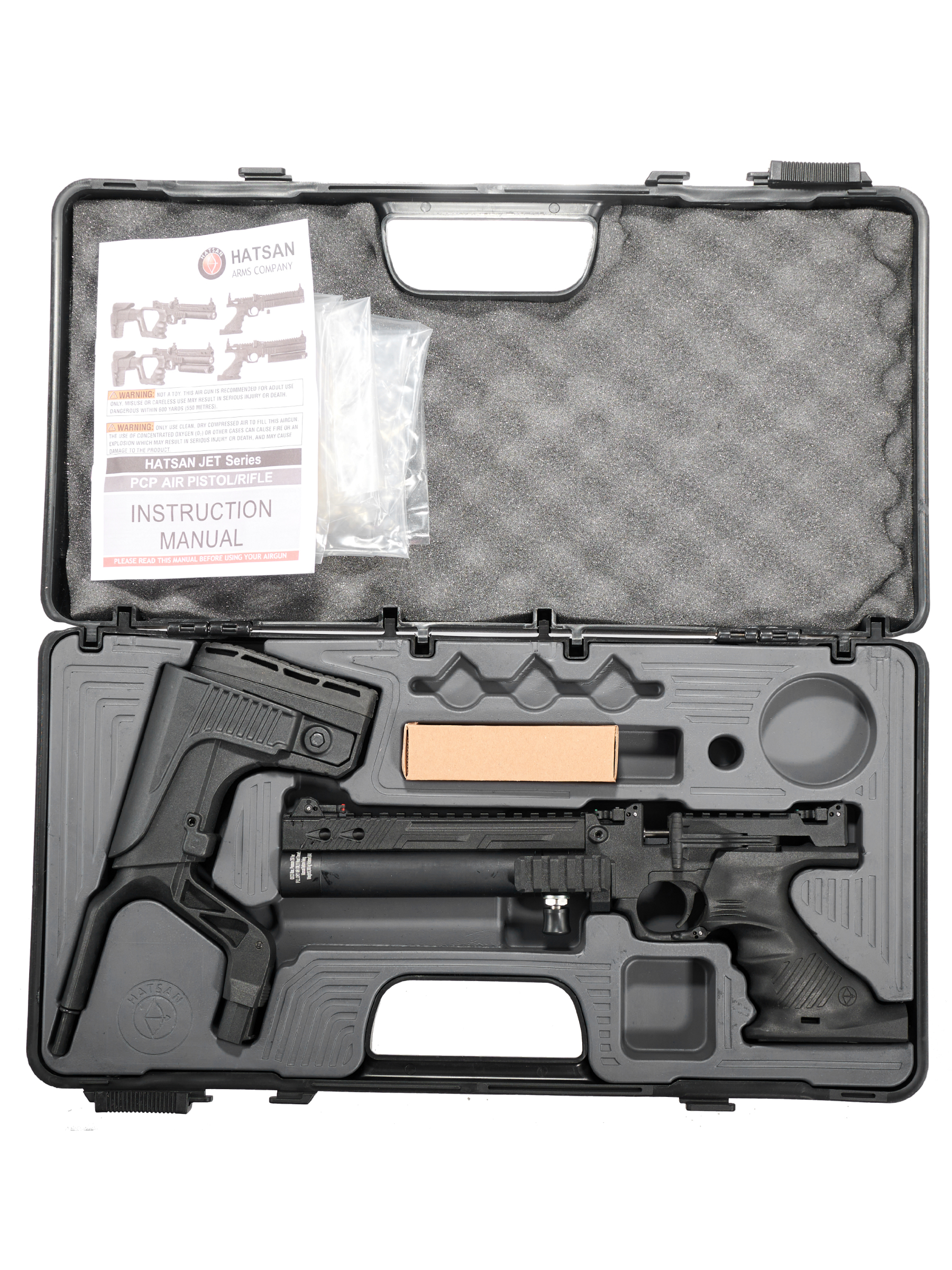 Пневматический пистолет Hatsan Jet 1 (PCP, 3 Дж, 1 баллон) 5,5 мм – это спортивная многозарядная модификация российского производства, конструкция которого допускает использование этого оружия на ближних и средних дистанциях. Разработчик применил нетривиальное решение - если к образцу присоединить комплектный приклад, пистолет превращается в практически полноценный карабин.