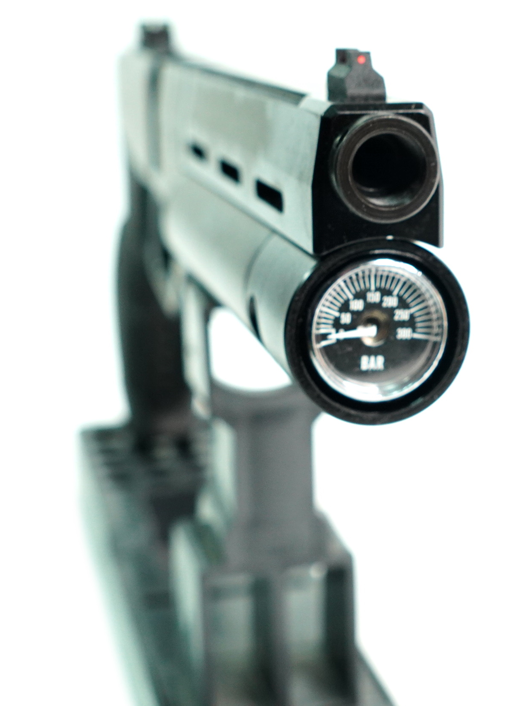 Пистолет заряжается пулями для пневматики калибра 5,5 мм из удобного барабанного магазина на 7 зарядов. Резервуар объемом 51,5 см3 позволяет совершить множество выстрелов без необходимости дозаправки. Встроенный манометр позволяет контролировать давление, а максимальное давление достигает 300 бар. Нарезной ствол обеспечивает впечатляющую скорость пули – до 200 м/с.