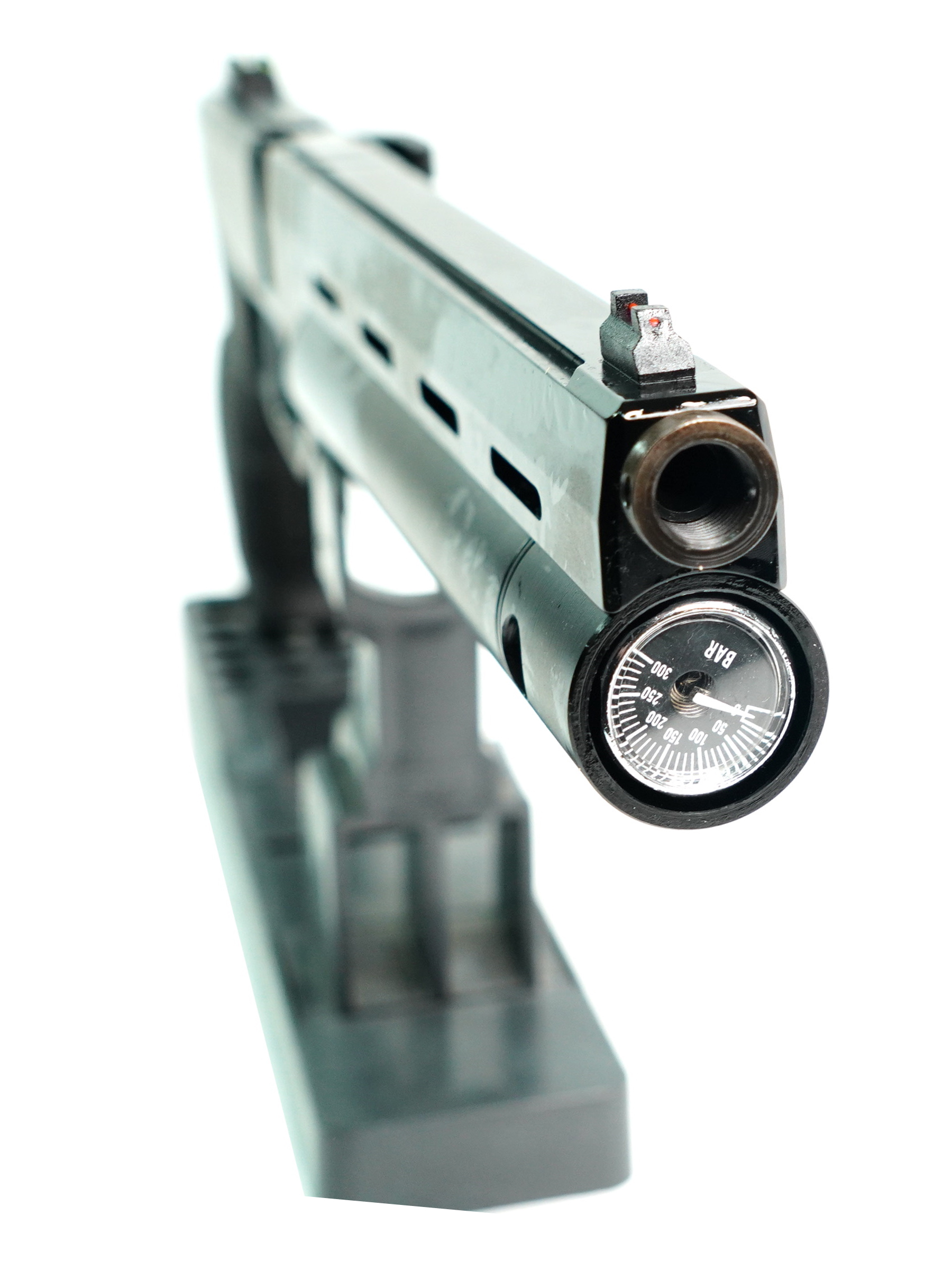 Пистолет заряжается пулями для пневматики калибра 5,5 мм, подаваемыми из удобного барабанного магазина на 7 зарядов. Резервуар объемом 51,5 см3 обеспечивает внушительное количество выстрелов без необходимости дозаправки. Встроенный манометр позволяет контролировать давление, а максимальное давление достигает 300 бар. Нарезной ствол обеспечивает великолепную точность и начальную скорость пули до 200 м/с.