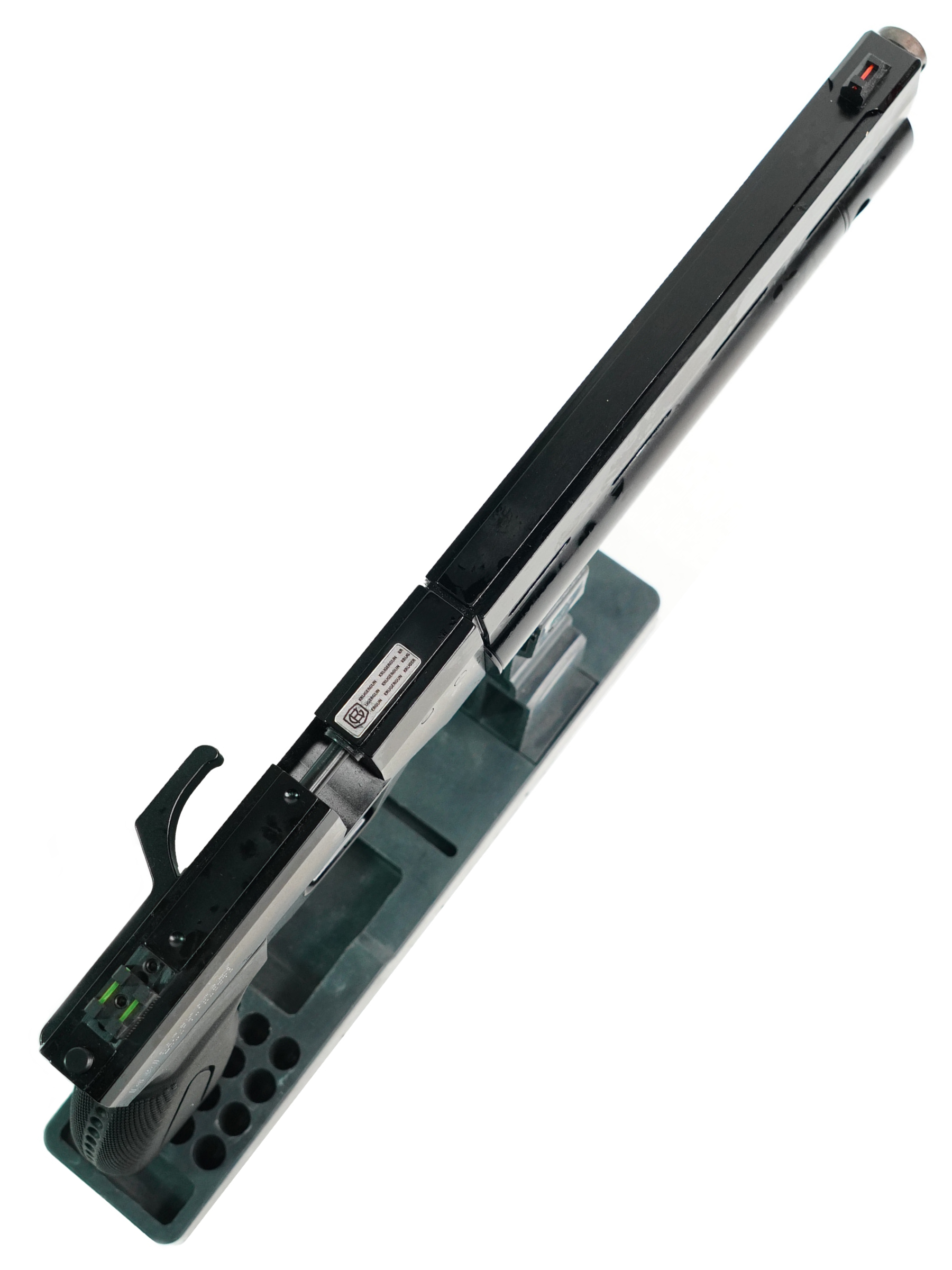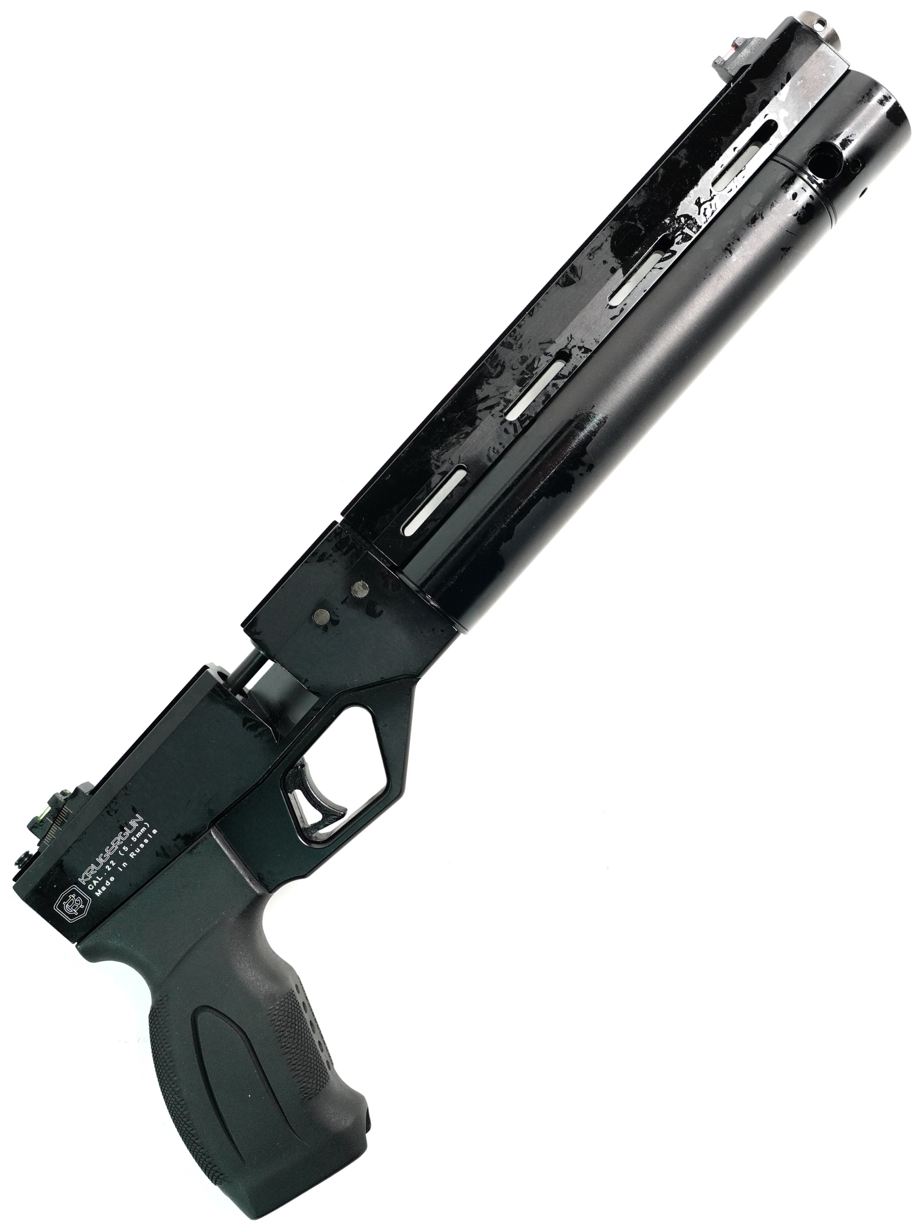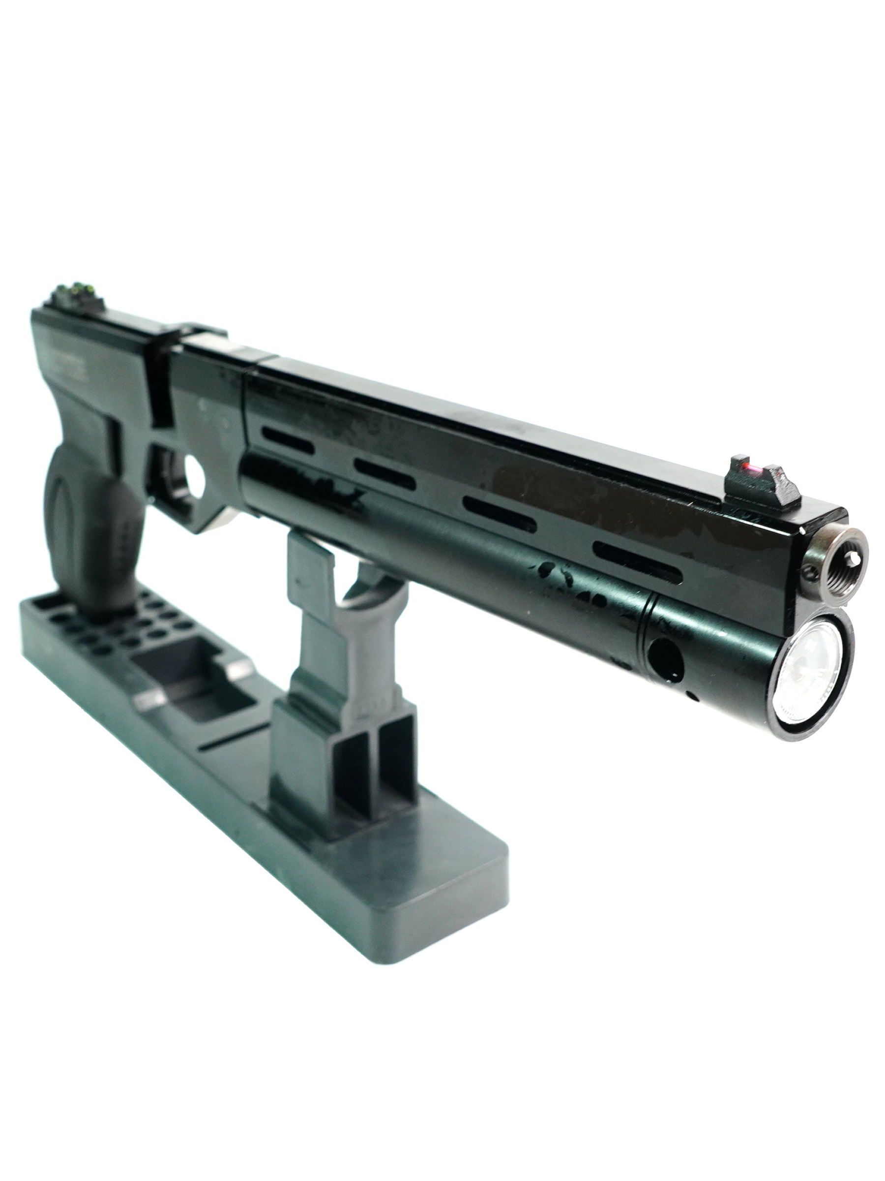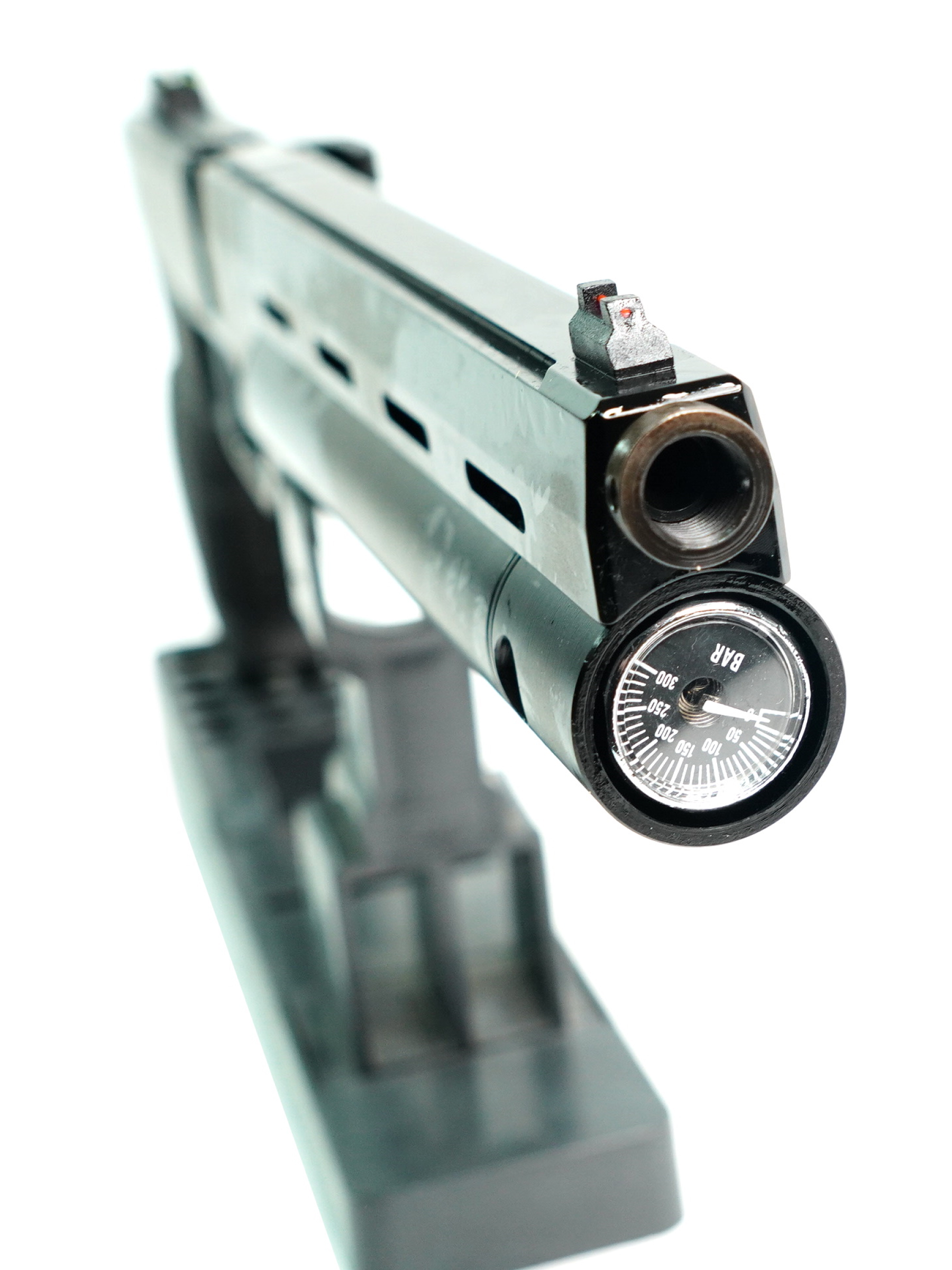 Пистолет заряжается пулями для пневматики калибра 6,35 мм, подаваемыми из удобного барабанного магазина на 7 зарядов. Резервуар объемом 51,5 см3 обеспечивает внушительное количество выстрелов без необходимости дозаправки. Встроенный манометр позволяет контролировать давление, а максимальное давление достигает 300 бар. Нарезной ствол обеспечивает великолепную точность и начальную скорость пули до 200 м/с.