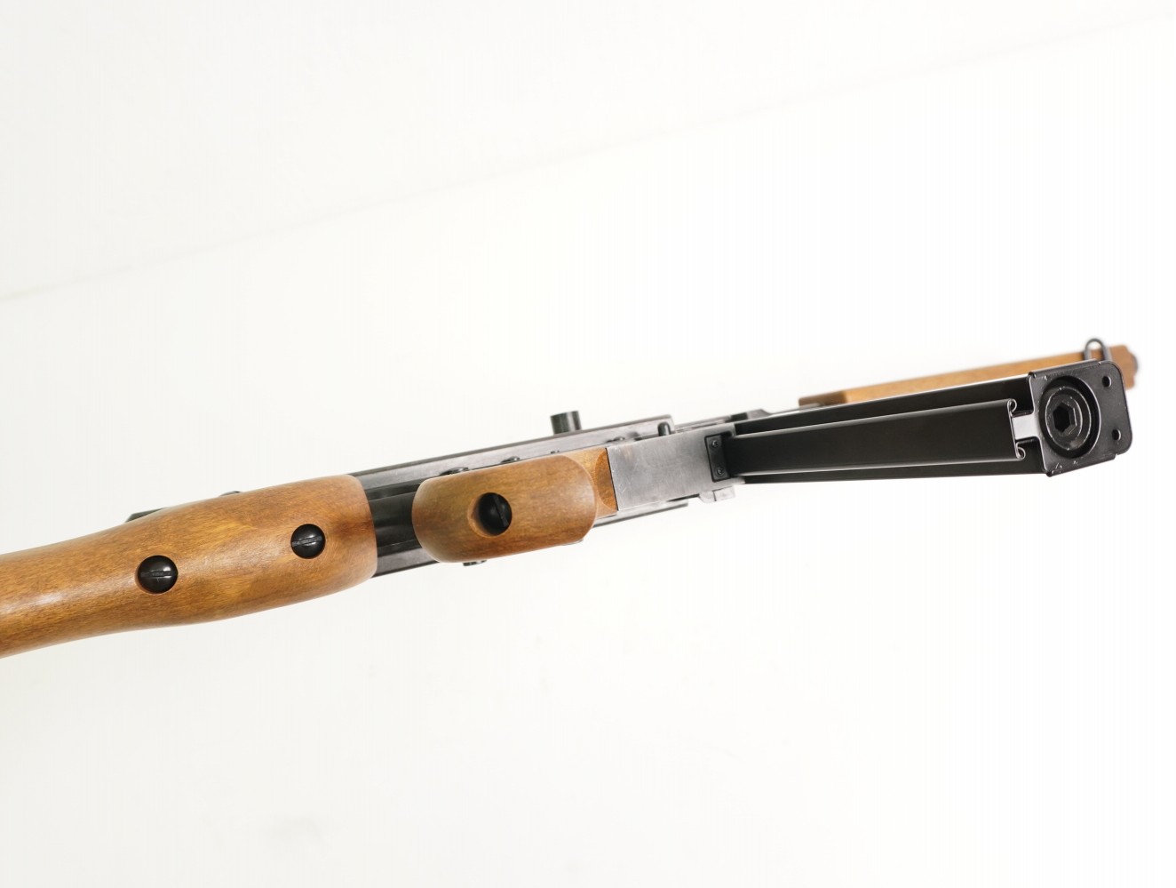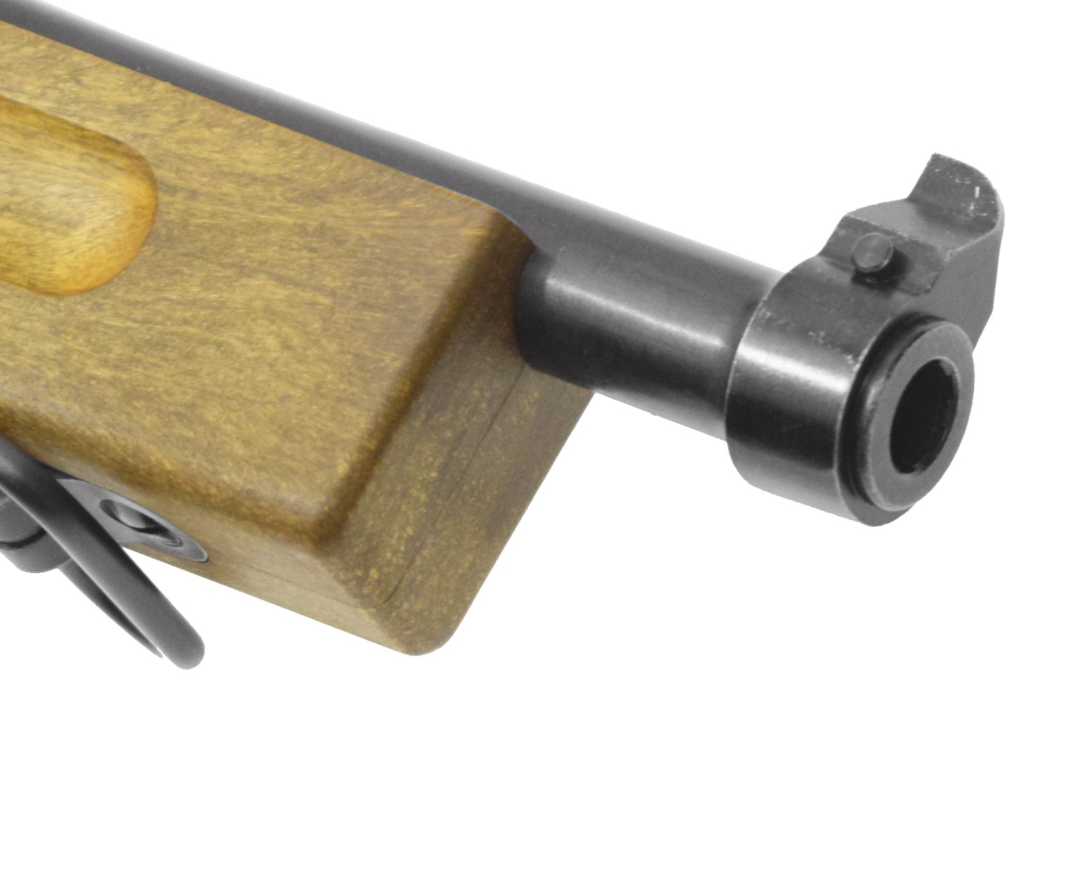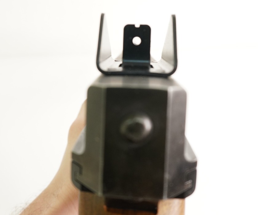 Металлический сплав и высококачественный пластик – основные материалы этого пистолета-пулемета. Приклад и цевье пластиковые, цвет «под дерево», и на первый взгляд этот материал неотличим от натурального. Установлен неавтоматический предохранитель в виде переключателя. Ствол гладкий. Штатные целик и мушка позволят прицелиться на ближних дистанциях.