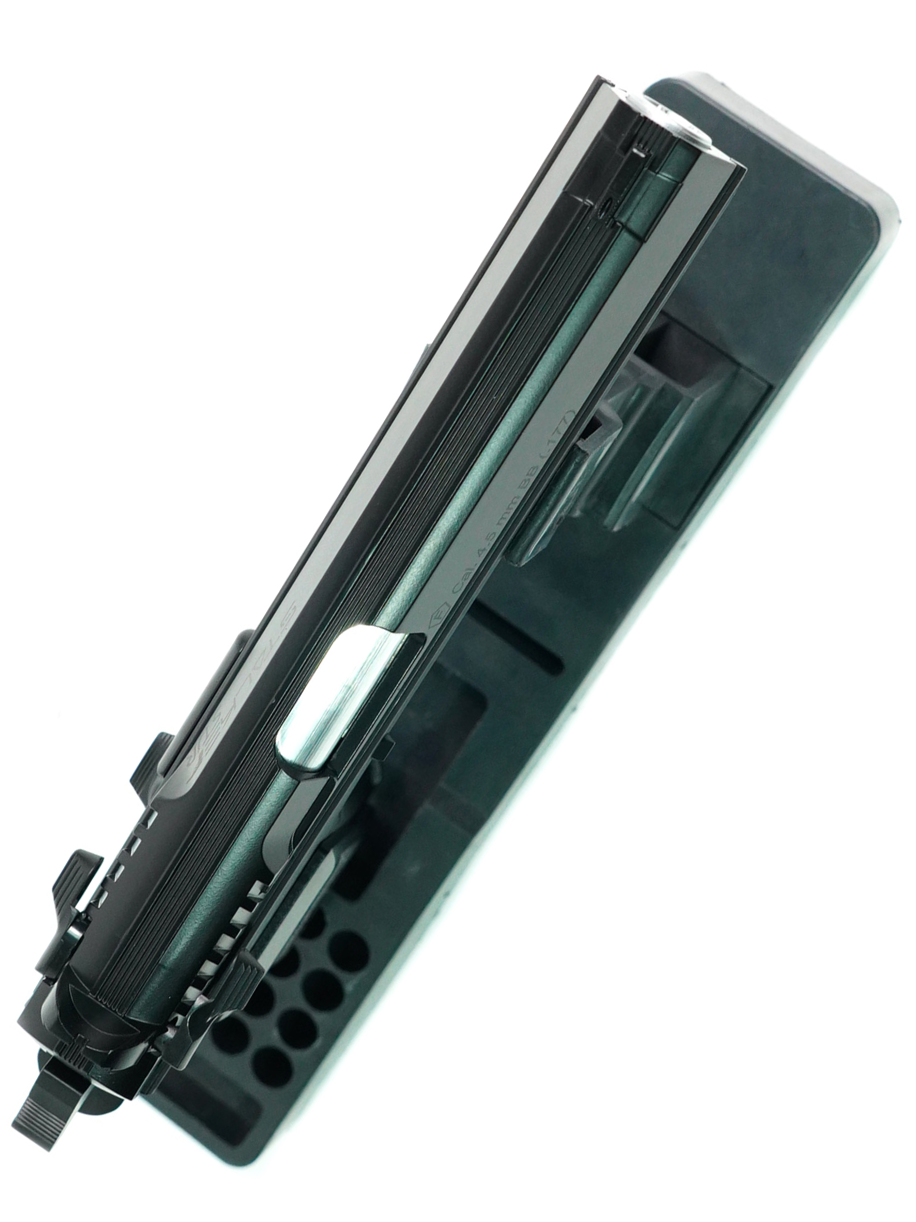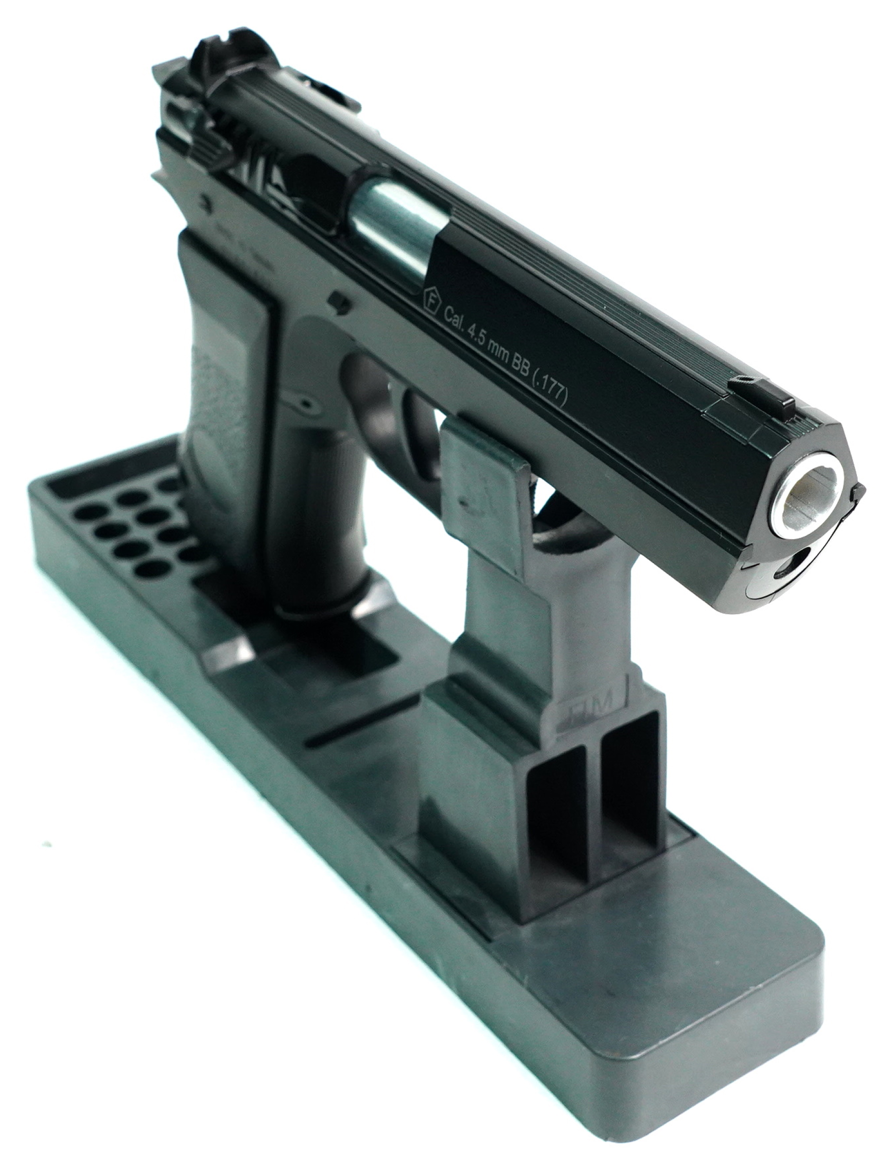 Емкость магазина составляет 21 шарик BB диаметром 4,5 мм, а режим стрельбы — полуавтоматический, что обеспечивает удобство и быстрый цикл стрельбы. Ударно-спусковой механизм — двойного действия, а для повышения надежности предусмотрен двусторонний неавтоматический флажковый предохранитель. В комплекте отсутствуют регулируемые прицельные приспособления, однако имеется нерегулируемый целик и мушка, которые позволяют вести прицеливание.