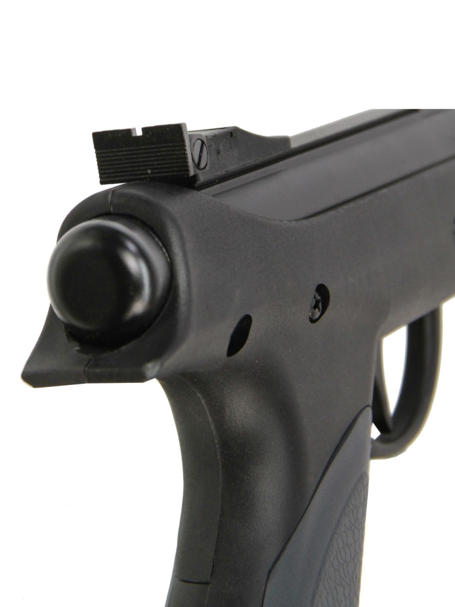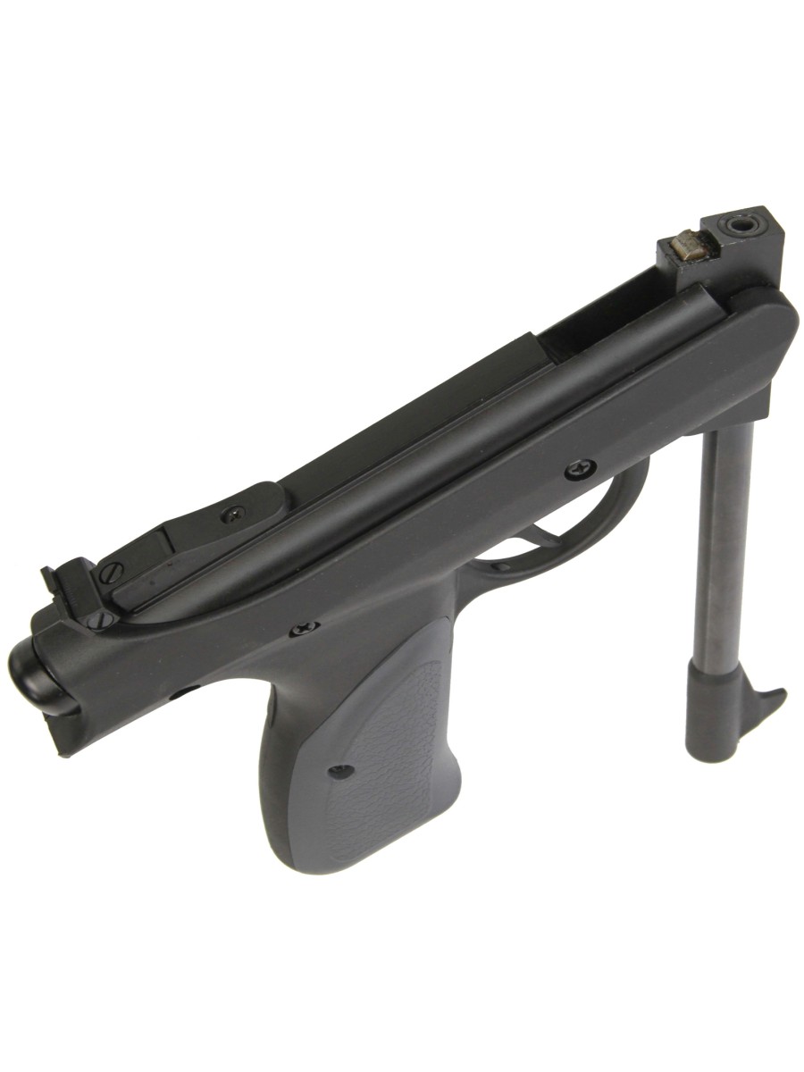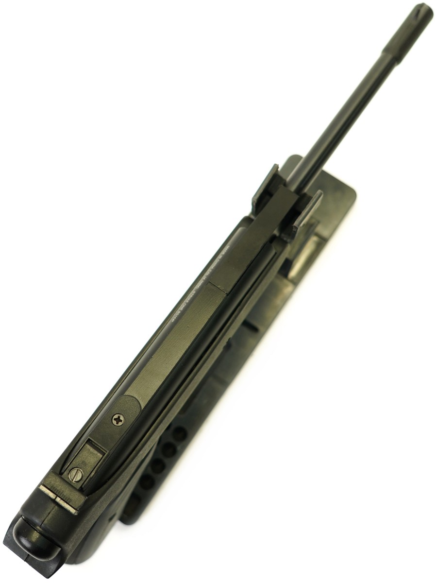 Пружинный компрессор взводится переломом ствола пистолета. Ручной кнопочный предохранитель, расположенный на спусковом крючке, блокирует устройство от случайного выстрела. Эргономичная рукоятка с рифленой полимерной накладкой позволяет комфортно стрелять с правой или с левой руки.