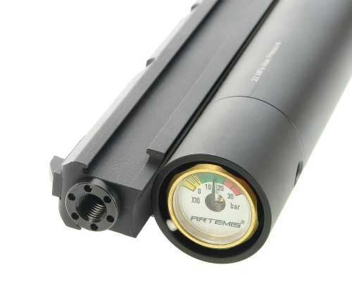 Сжатый воздух закачивается в съемный резервуар из металла с рабочим давлением 70-200 бар. С полным резервуаром можно произвести 200 выстрелов. Функцию контроля давления в резервуаре выполняет манометр. Скорость выстрела – 125 м/с. Предусмотрен съемный замковый предохранитель, закрепляемый на скобе спуска и предотвращающий случайный выстрел.